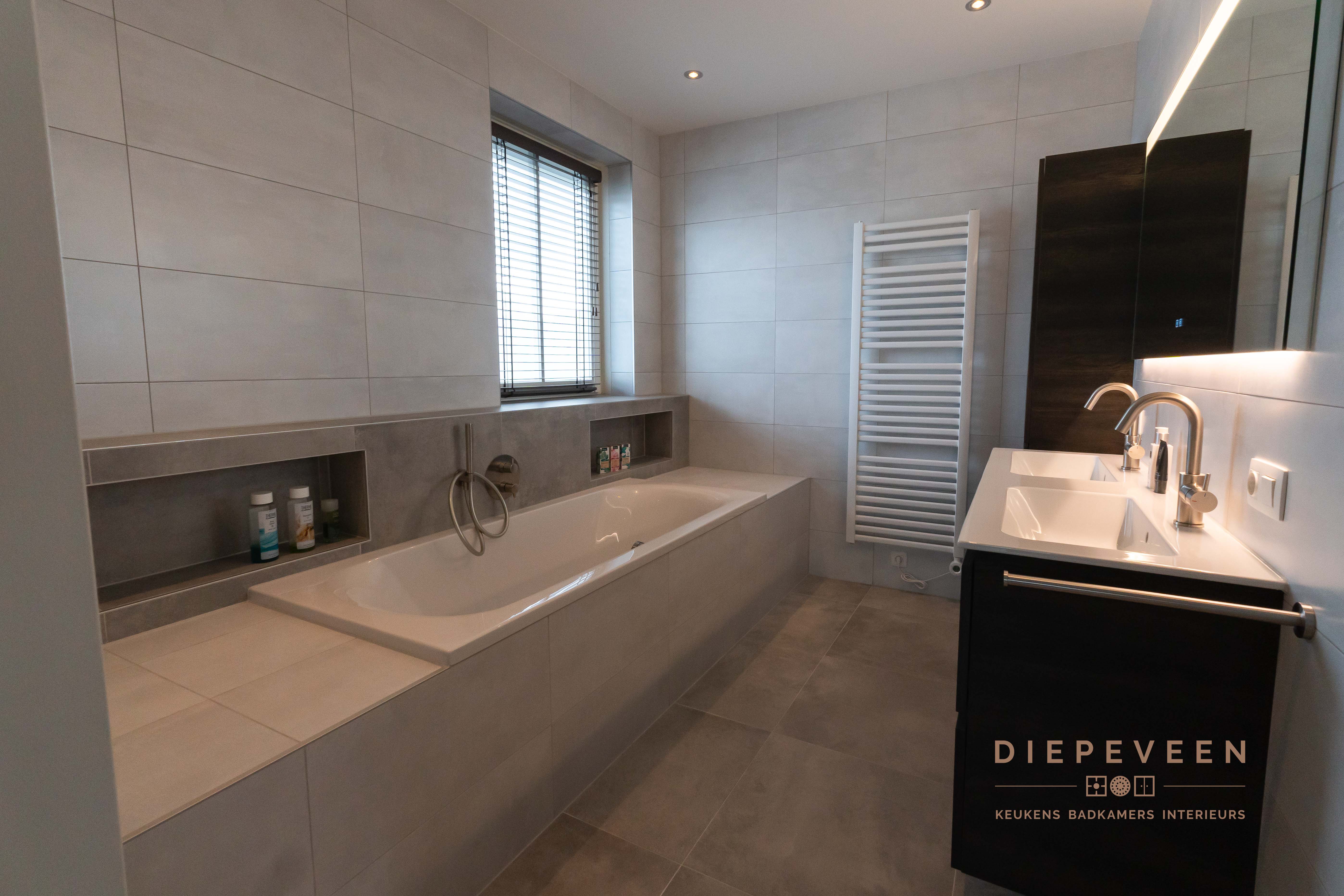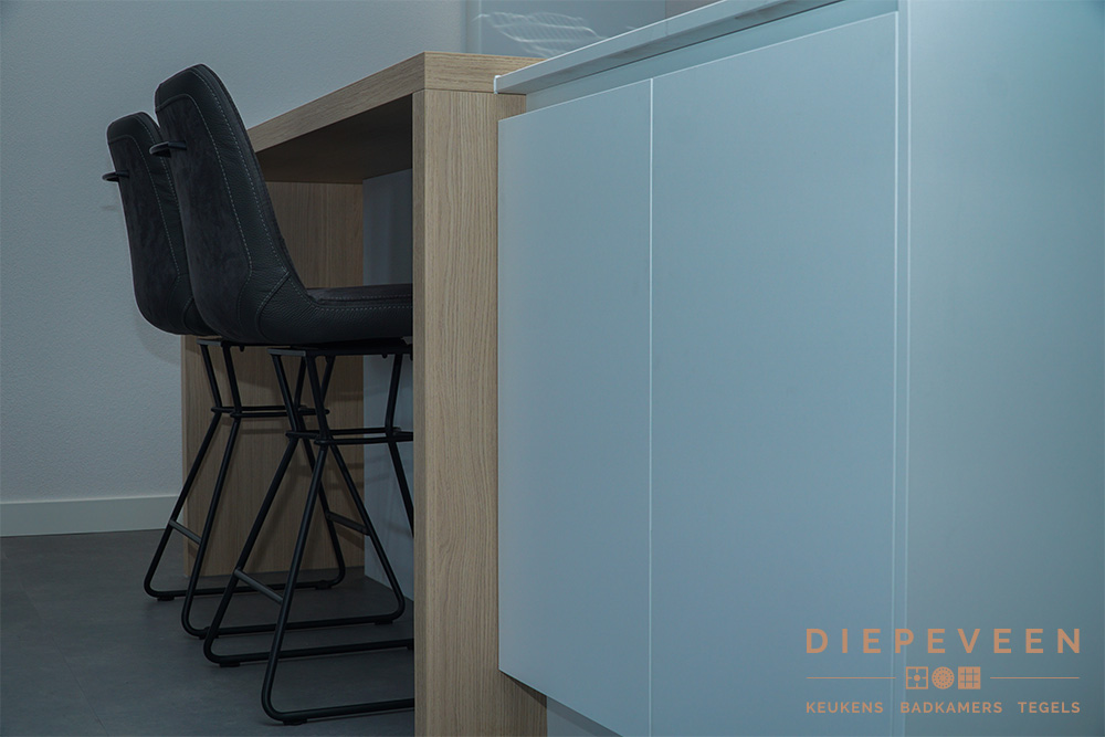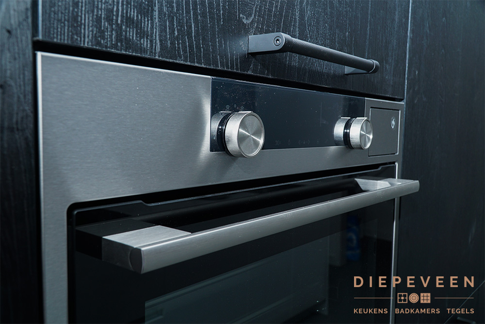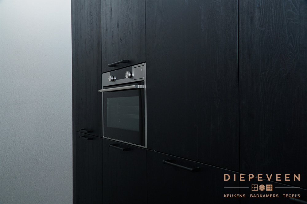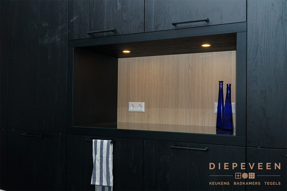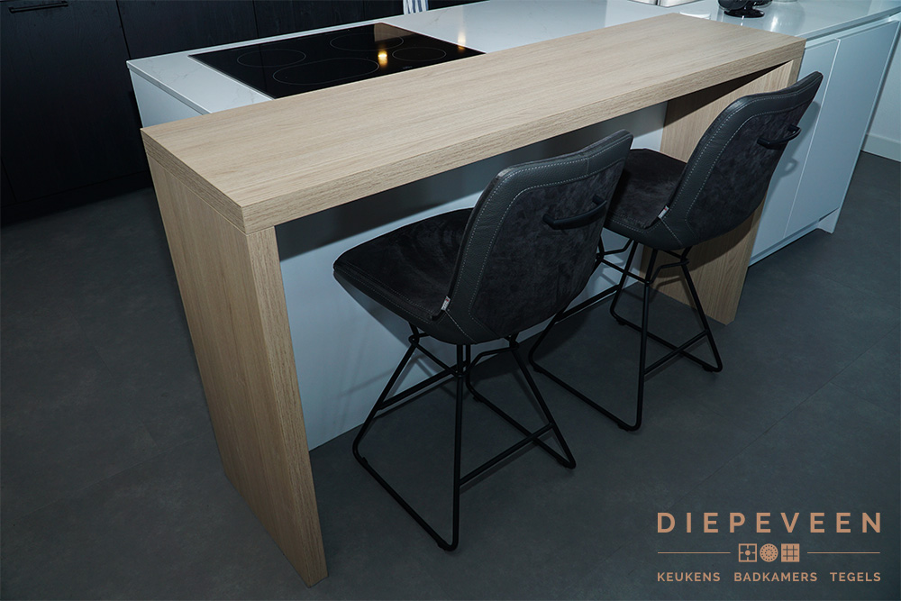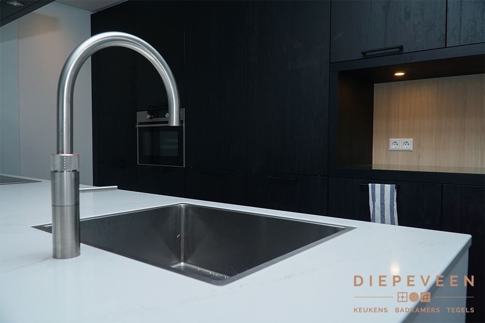Een prachtige moderne leefkeuken. Prachtig gecombineerd met de zwarte hoge kasten.