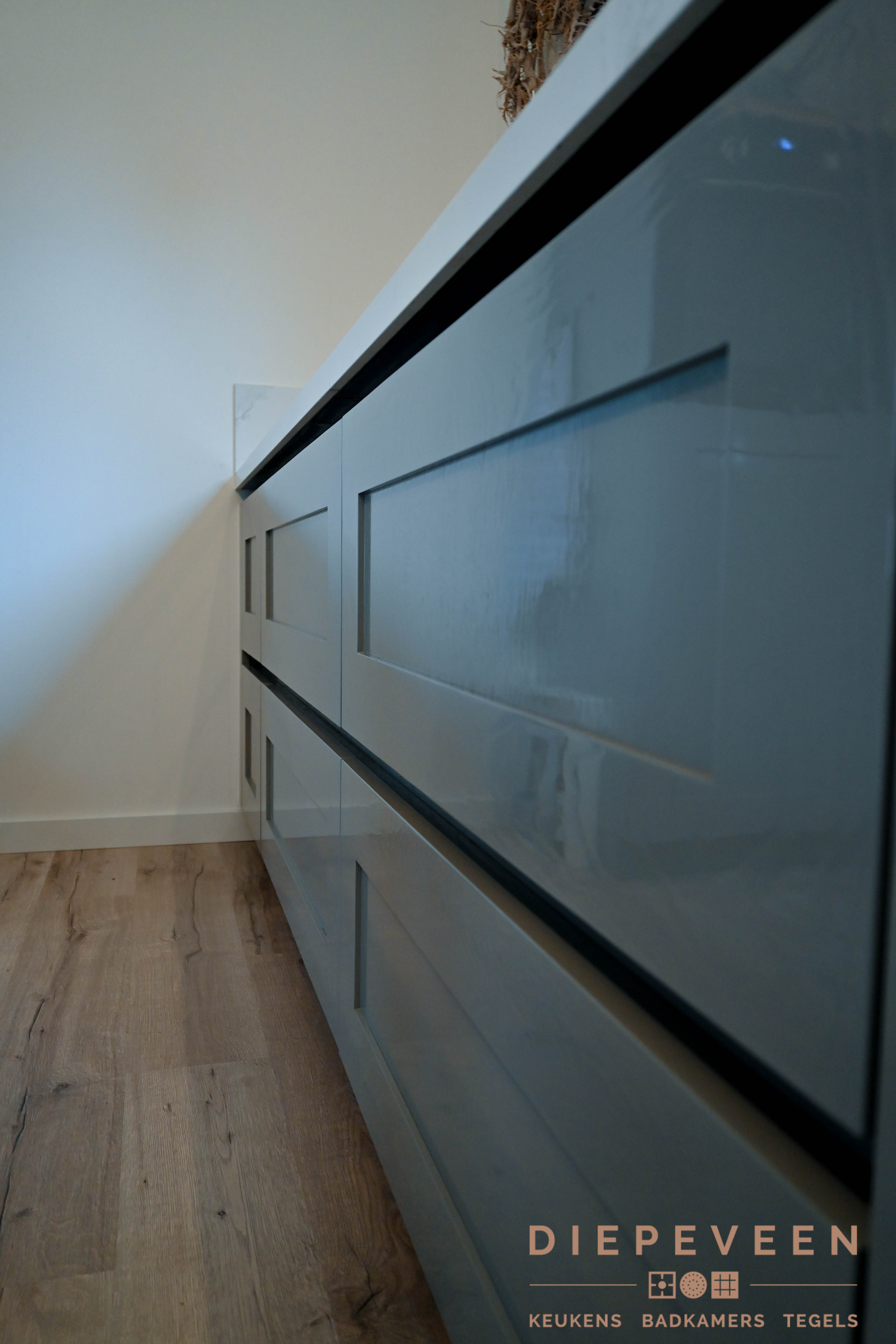 Prachtige stijlvolle tijdloze keuken voorzien van een heerlijk zitelement om even lekker samen wat te drinken.