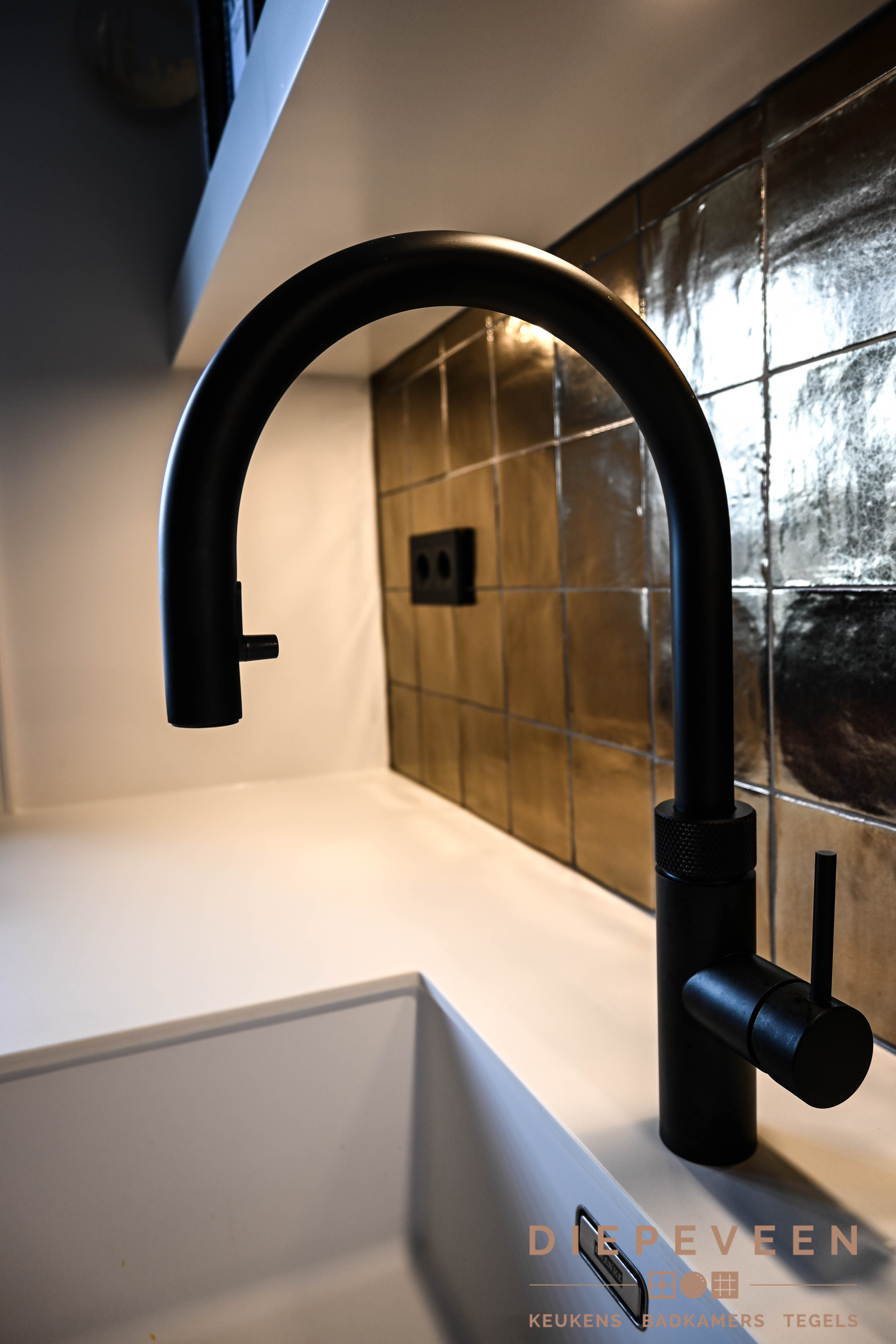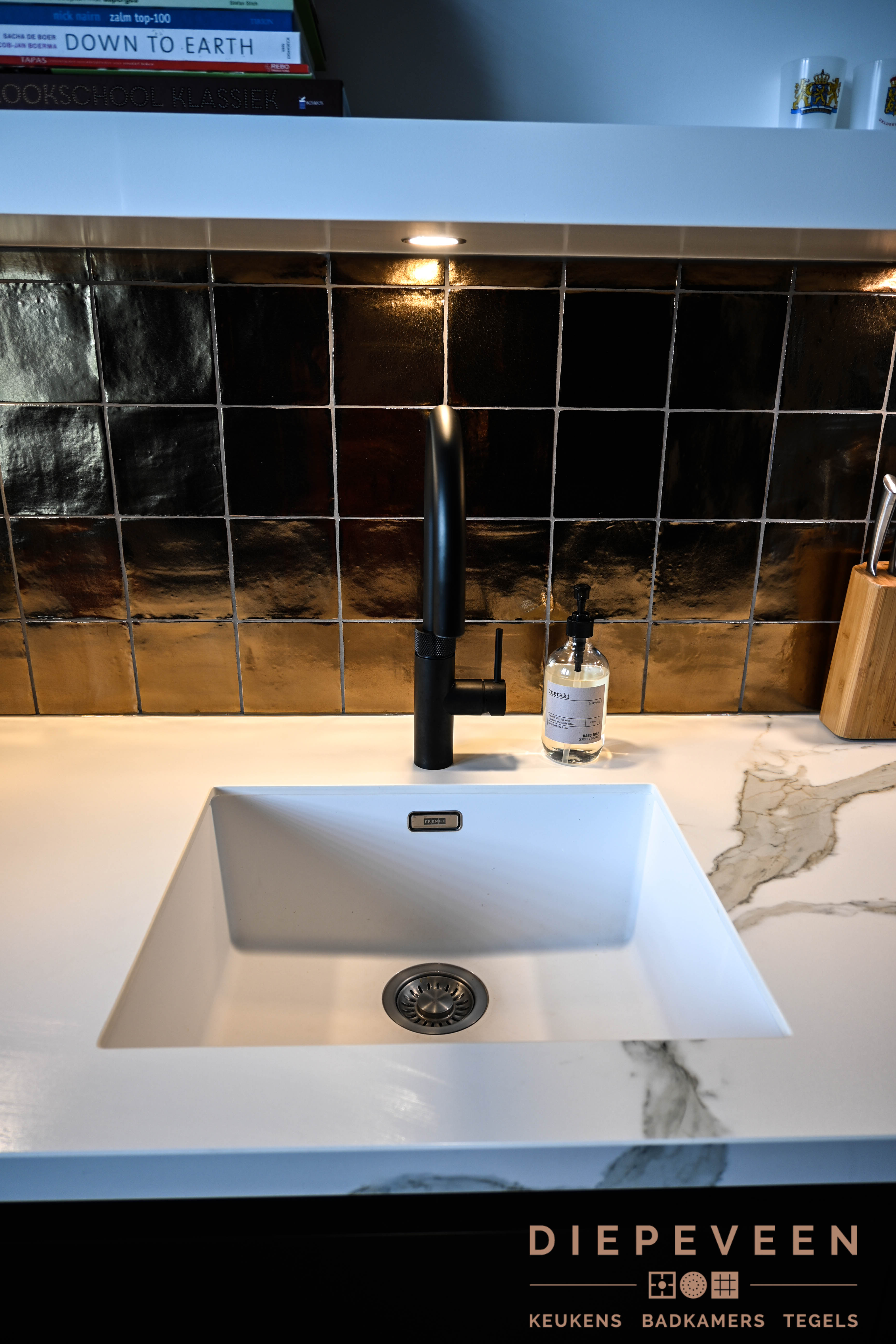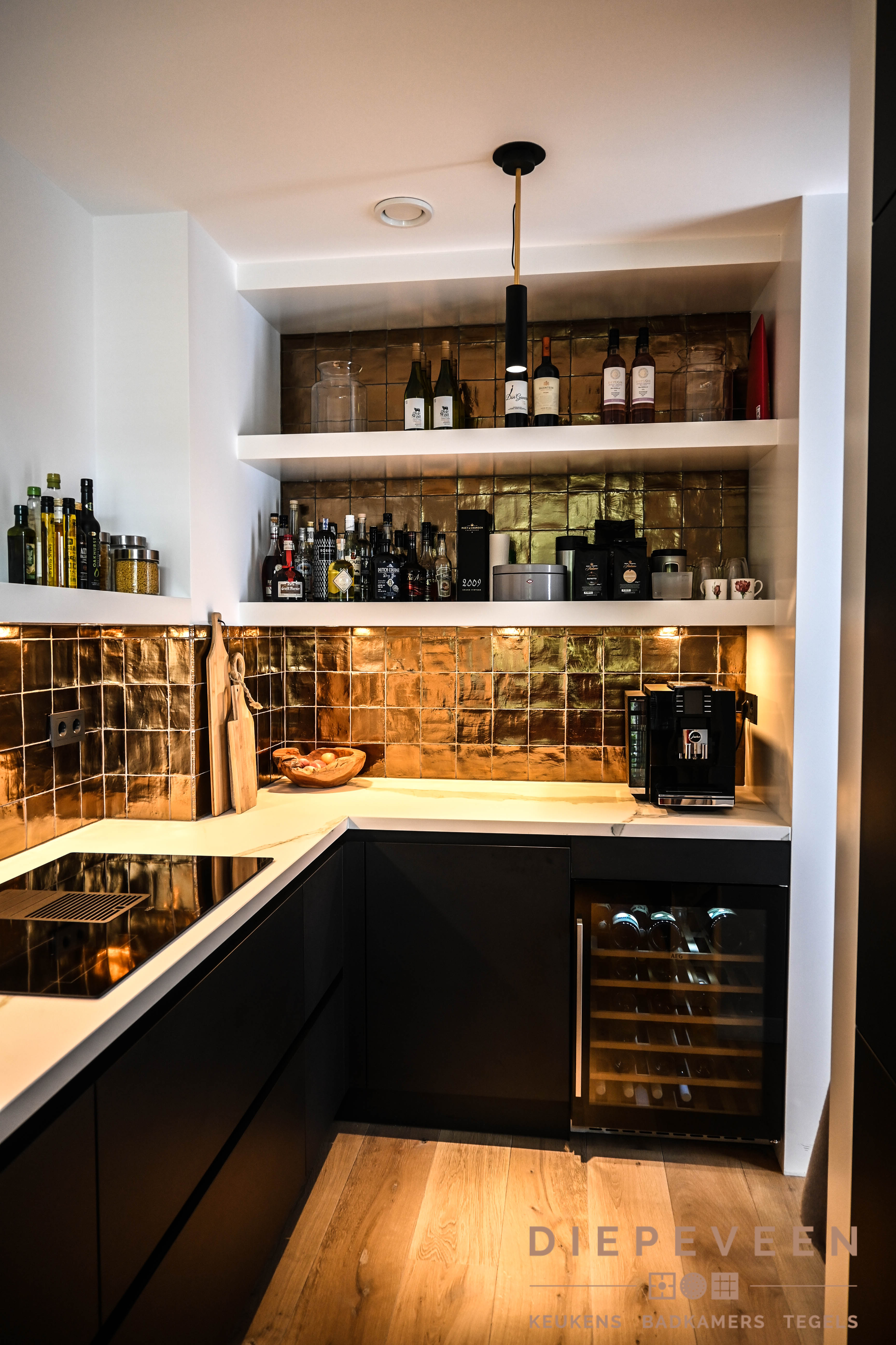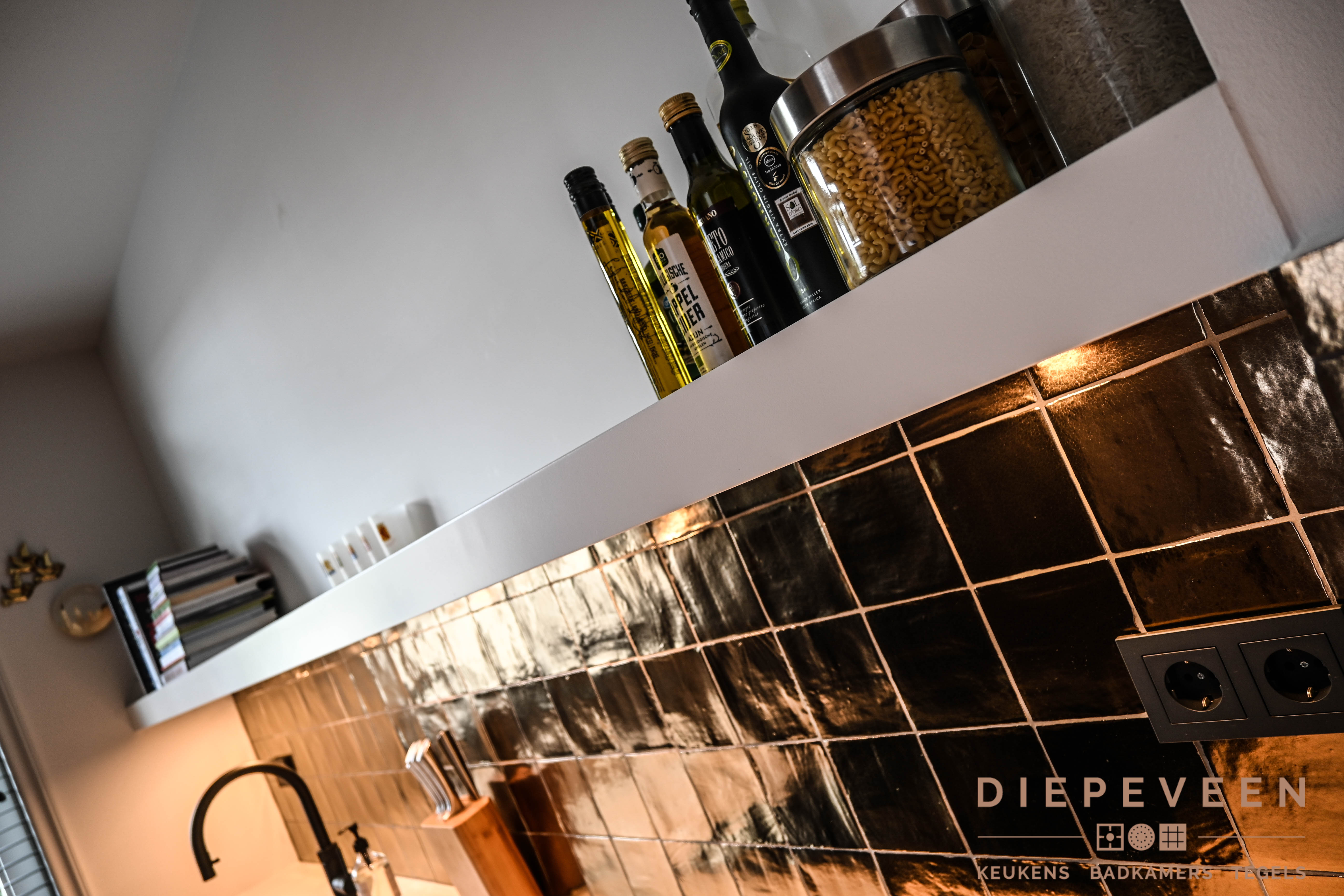 Wauw, wat een plaatje! De gouden tegeltjes zijn echt even 'out of the box' maar past helemaal bij deze keuken.
