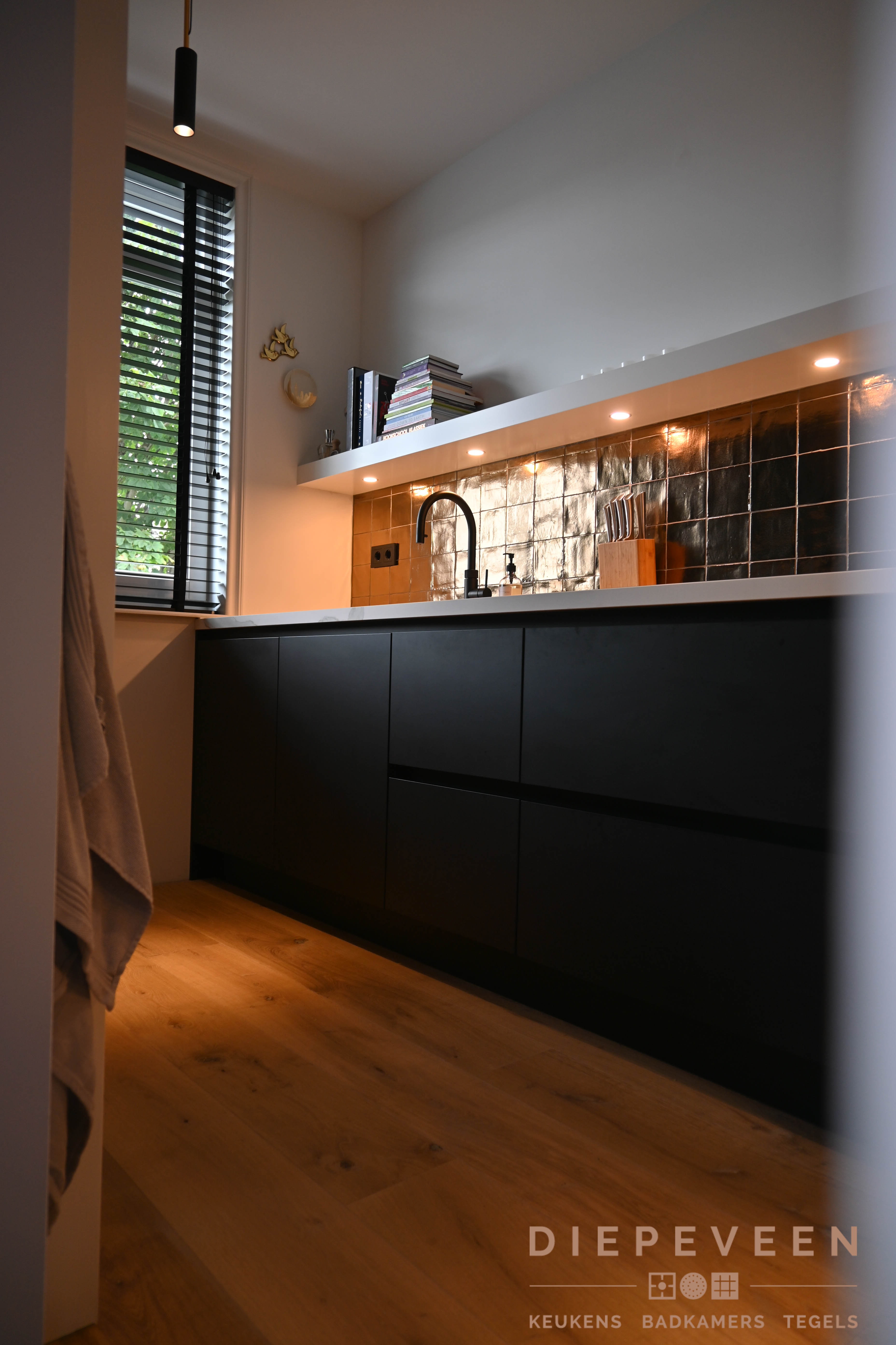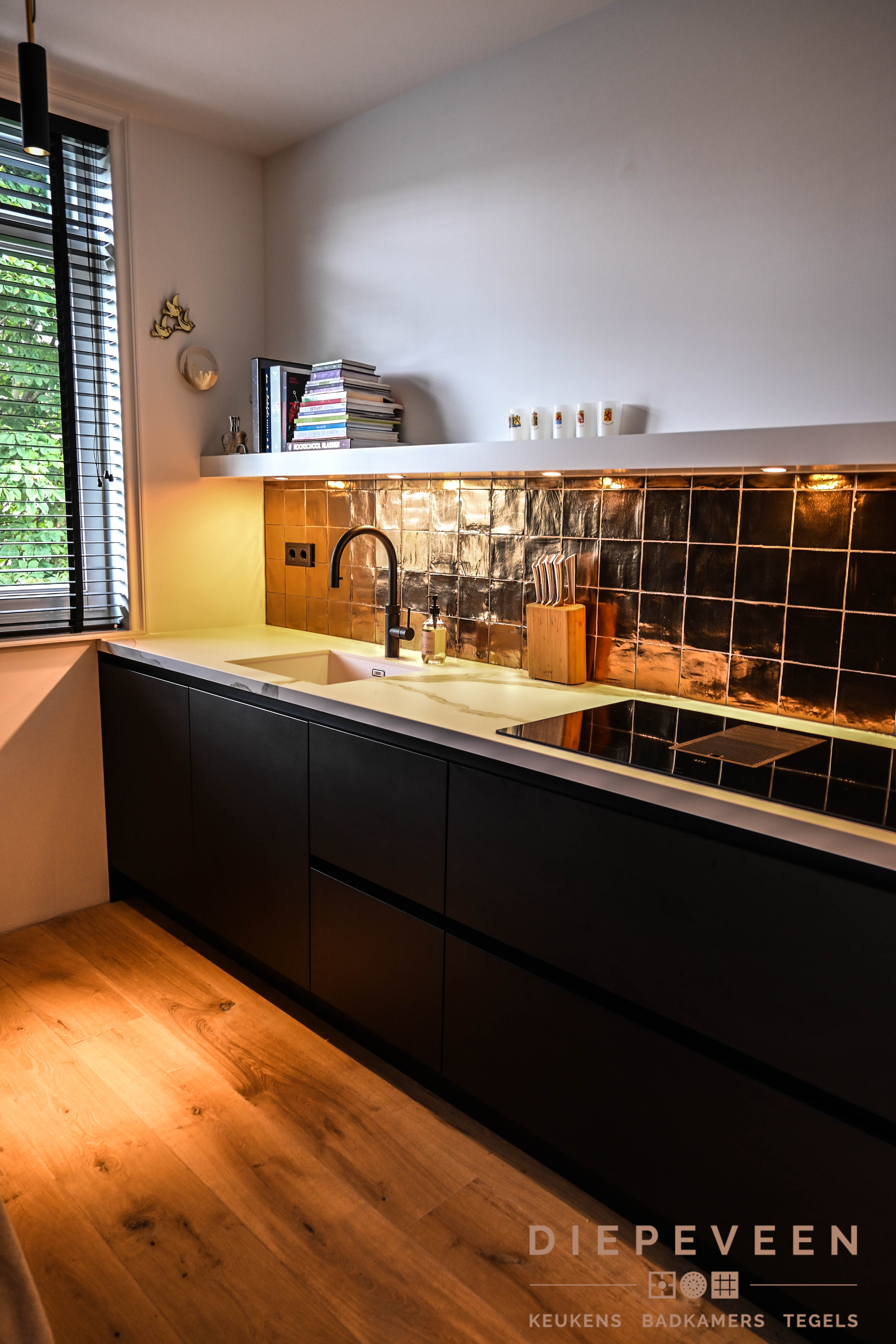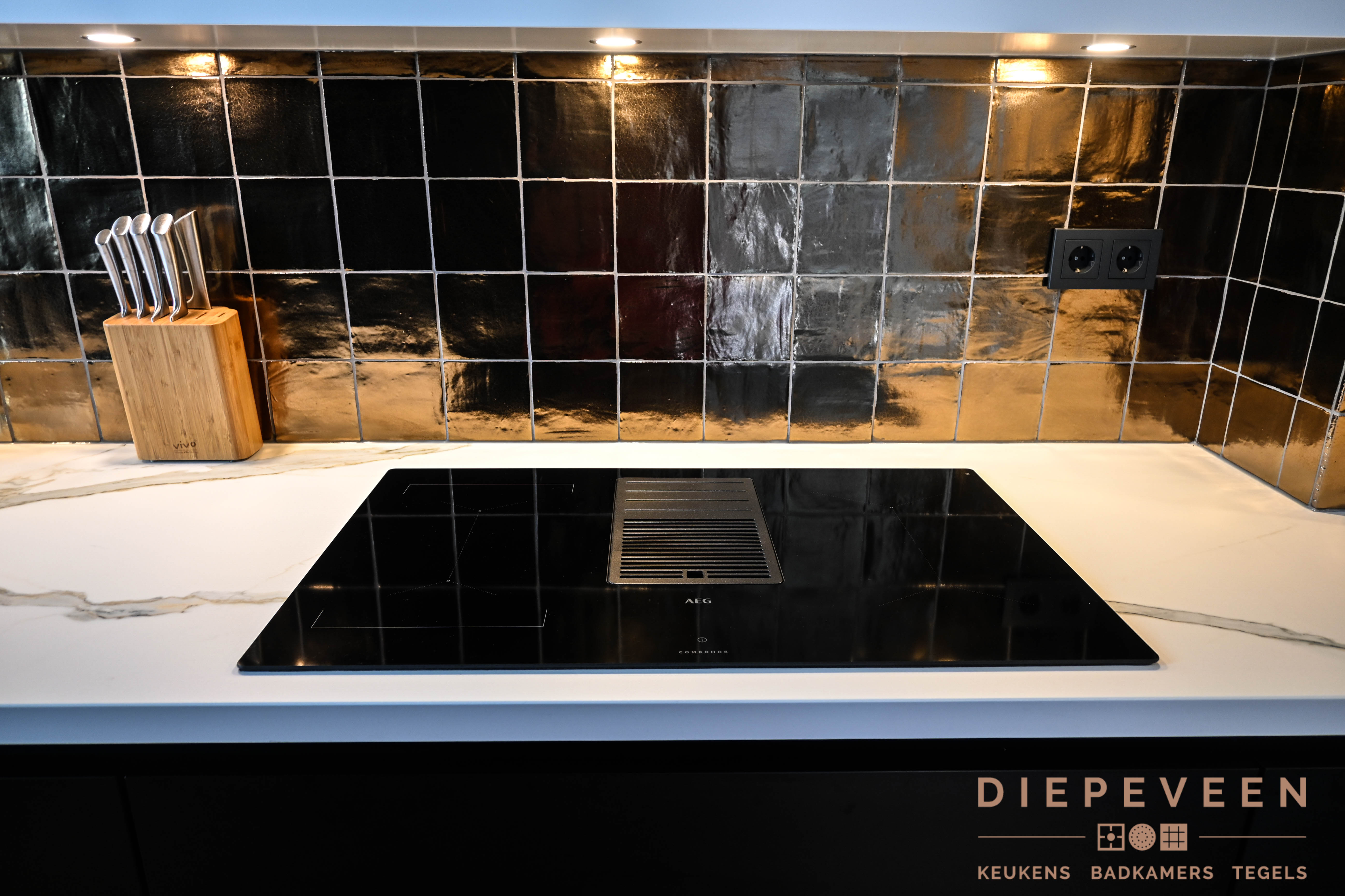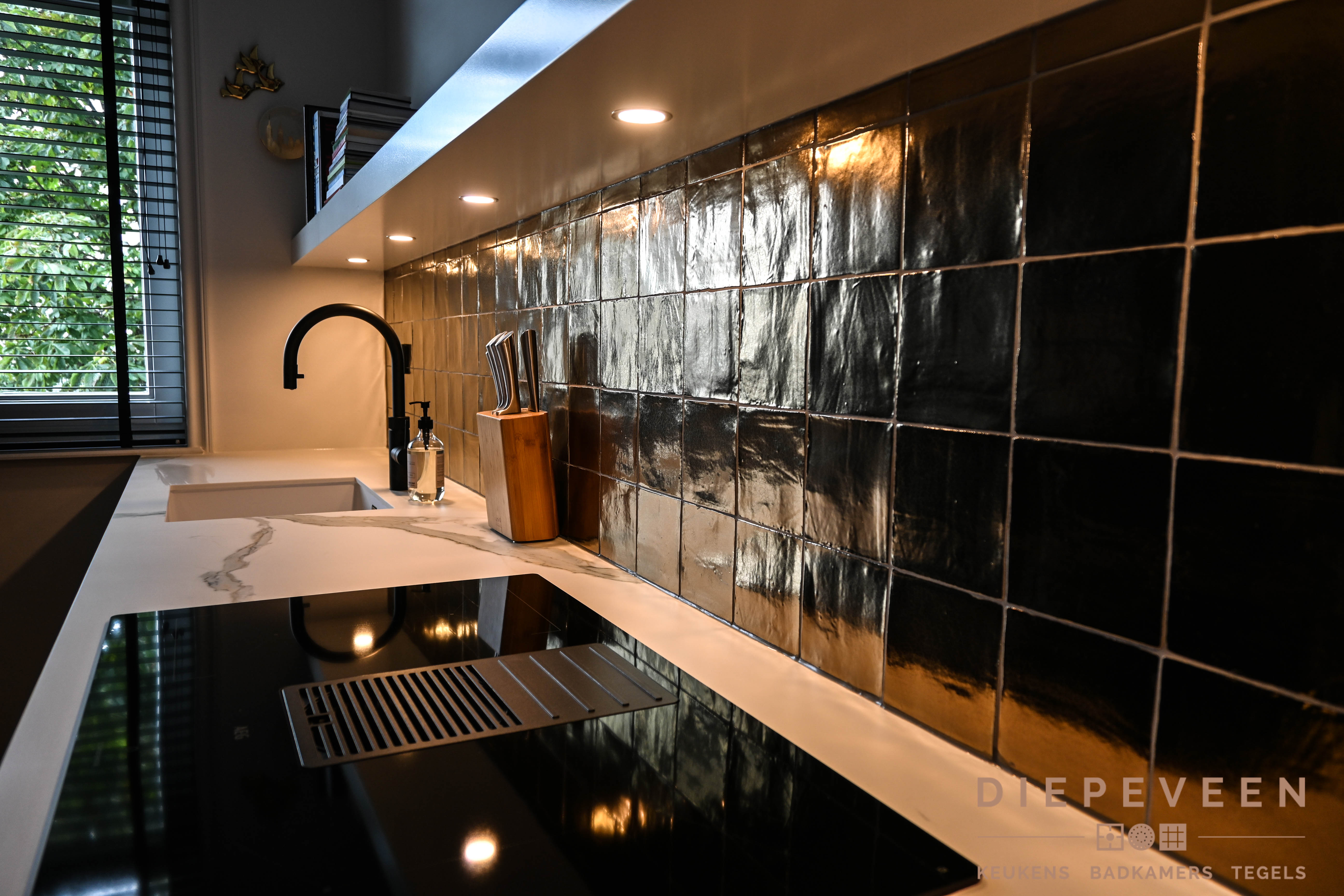 Wauw, wat een plaatje! De gouden tegeltjes zijn echt even 'out of the box' maar past helemaal bij deze keuken.