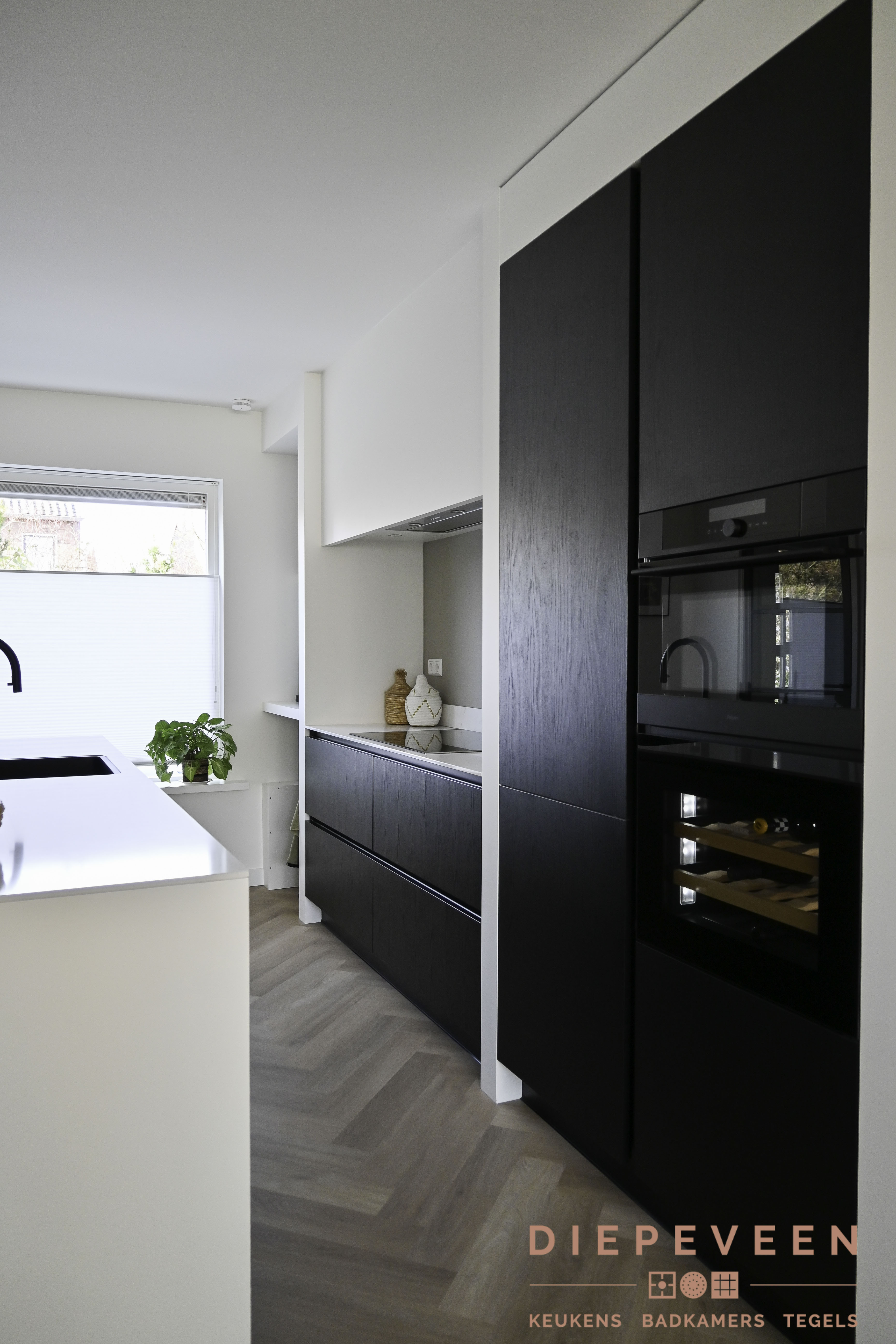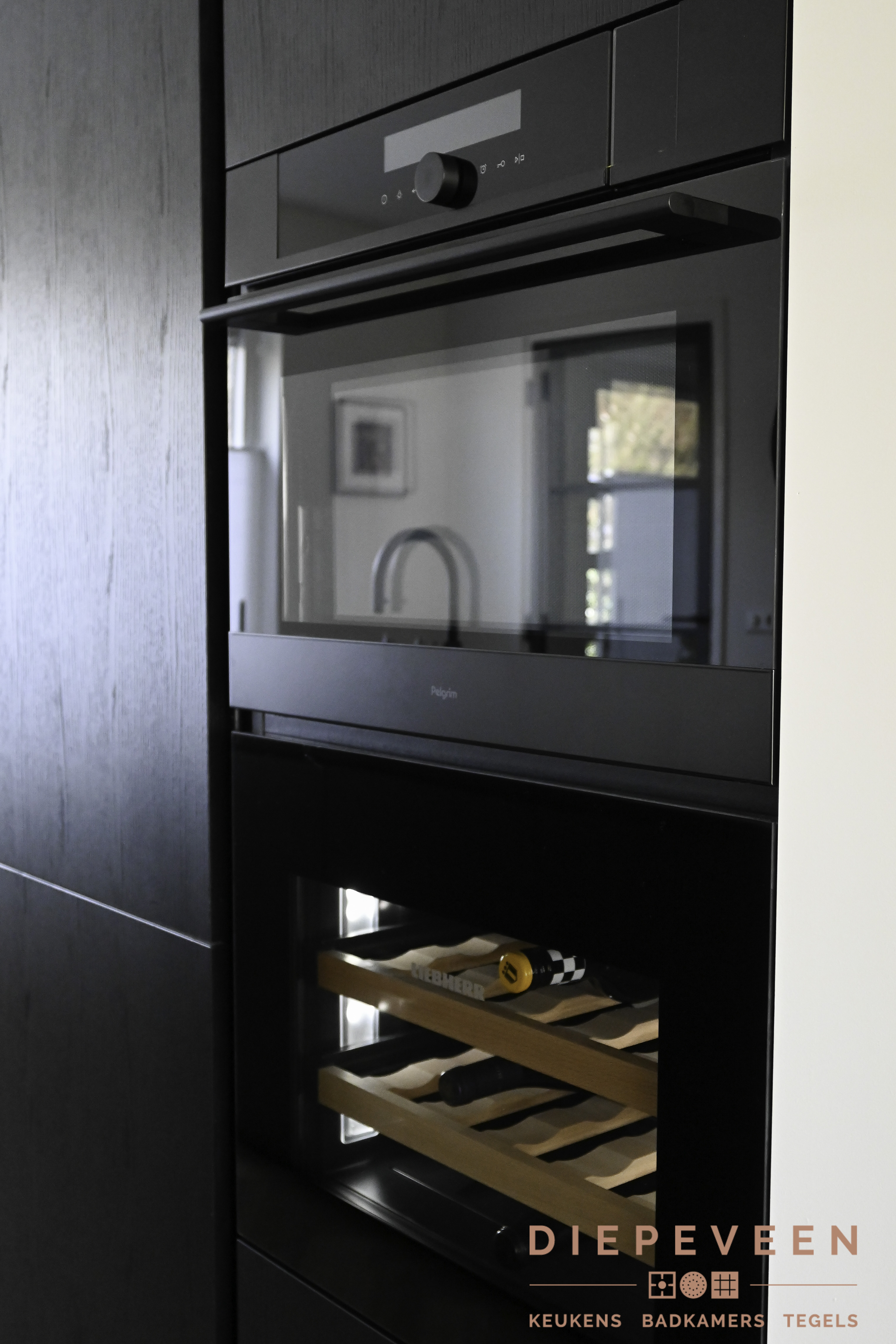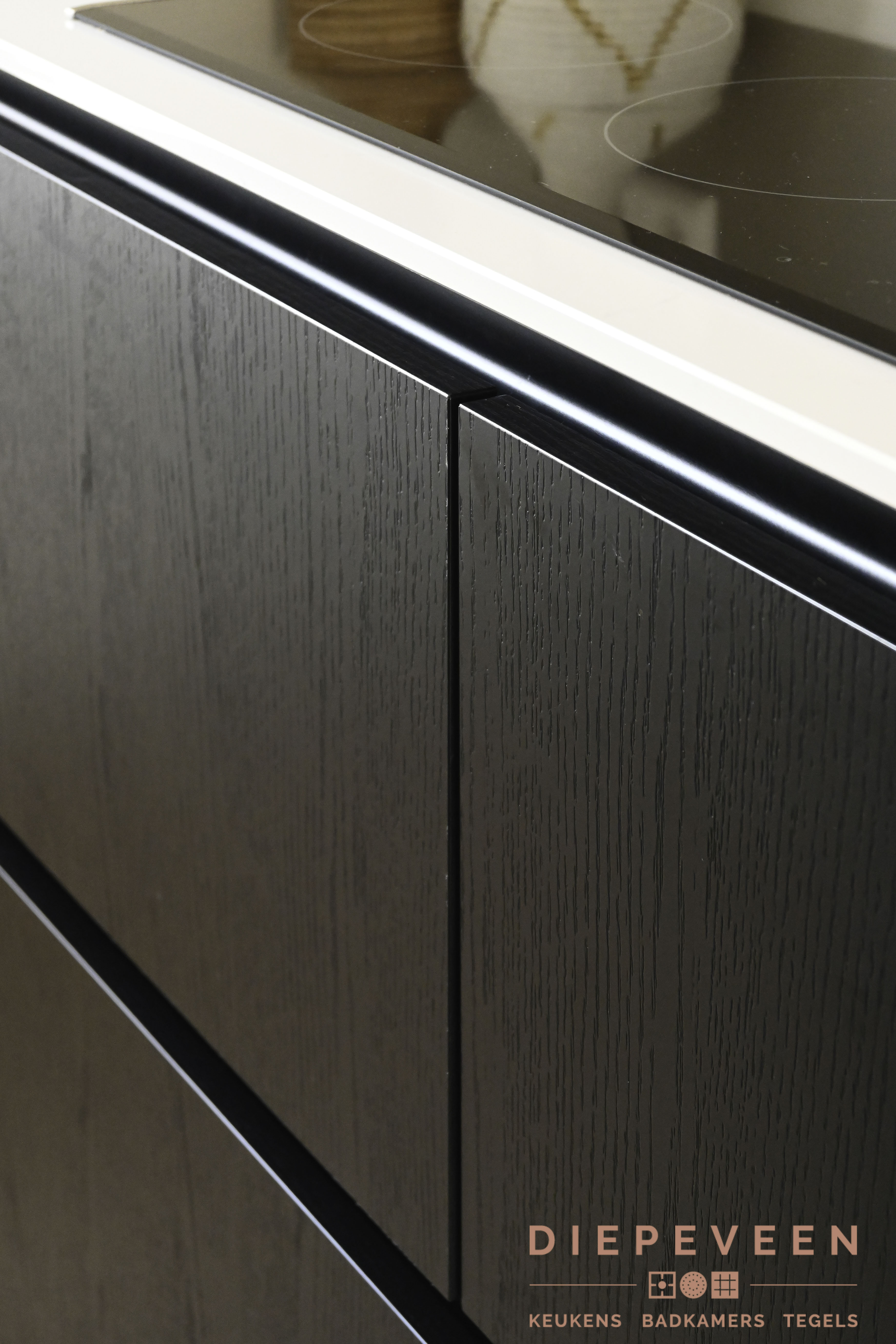 Bij deze keuken is gewerkt met zwarte fronten en een wit marmerlook werkblad. De kasten en lades zijn greeploos wat zorgt voor een strakke uitstraling. Deze keuken is een heerlijke plek om te genieten van de gerechten en een heerlijk glas wijn!