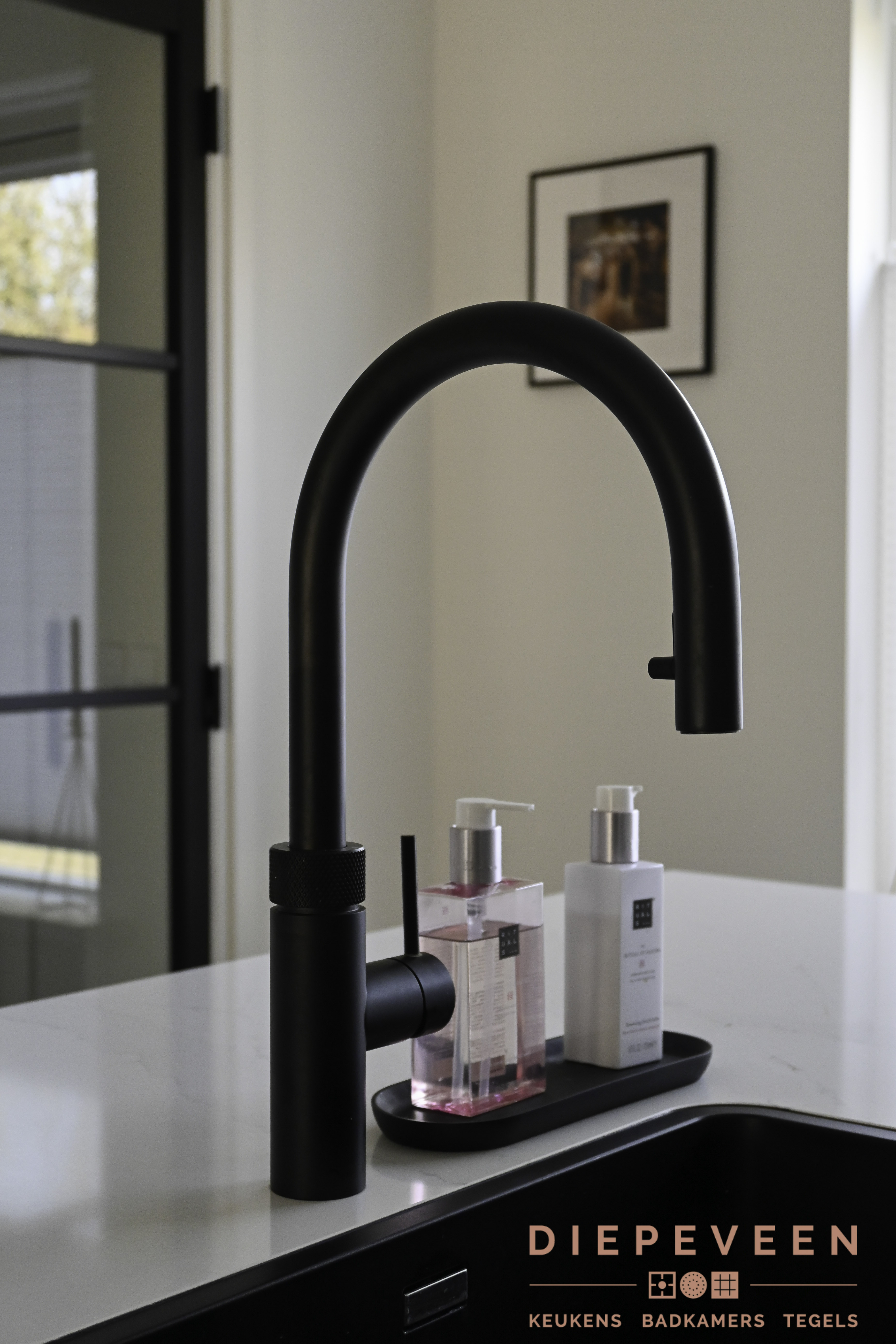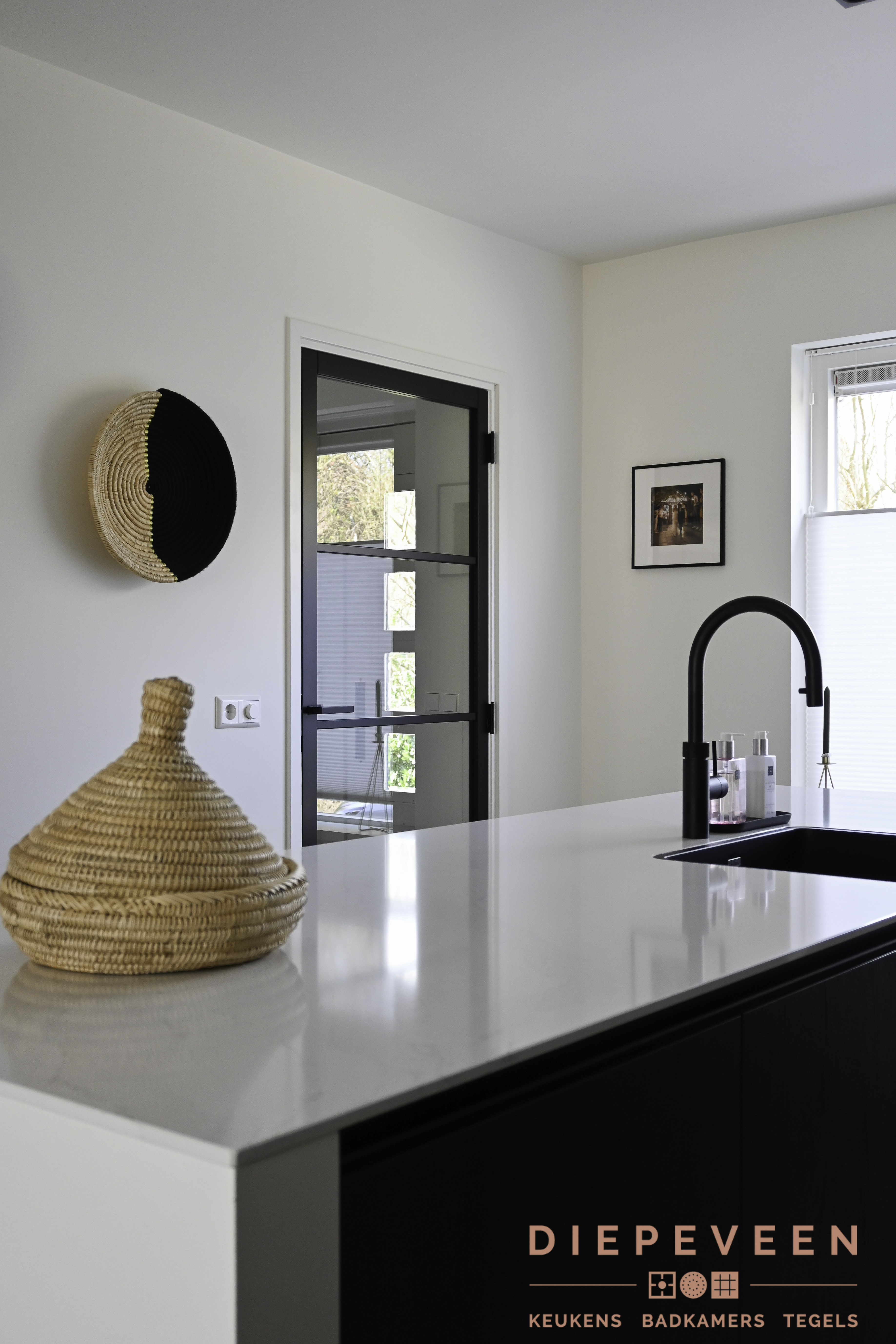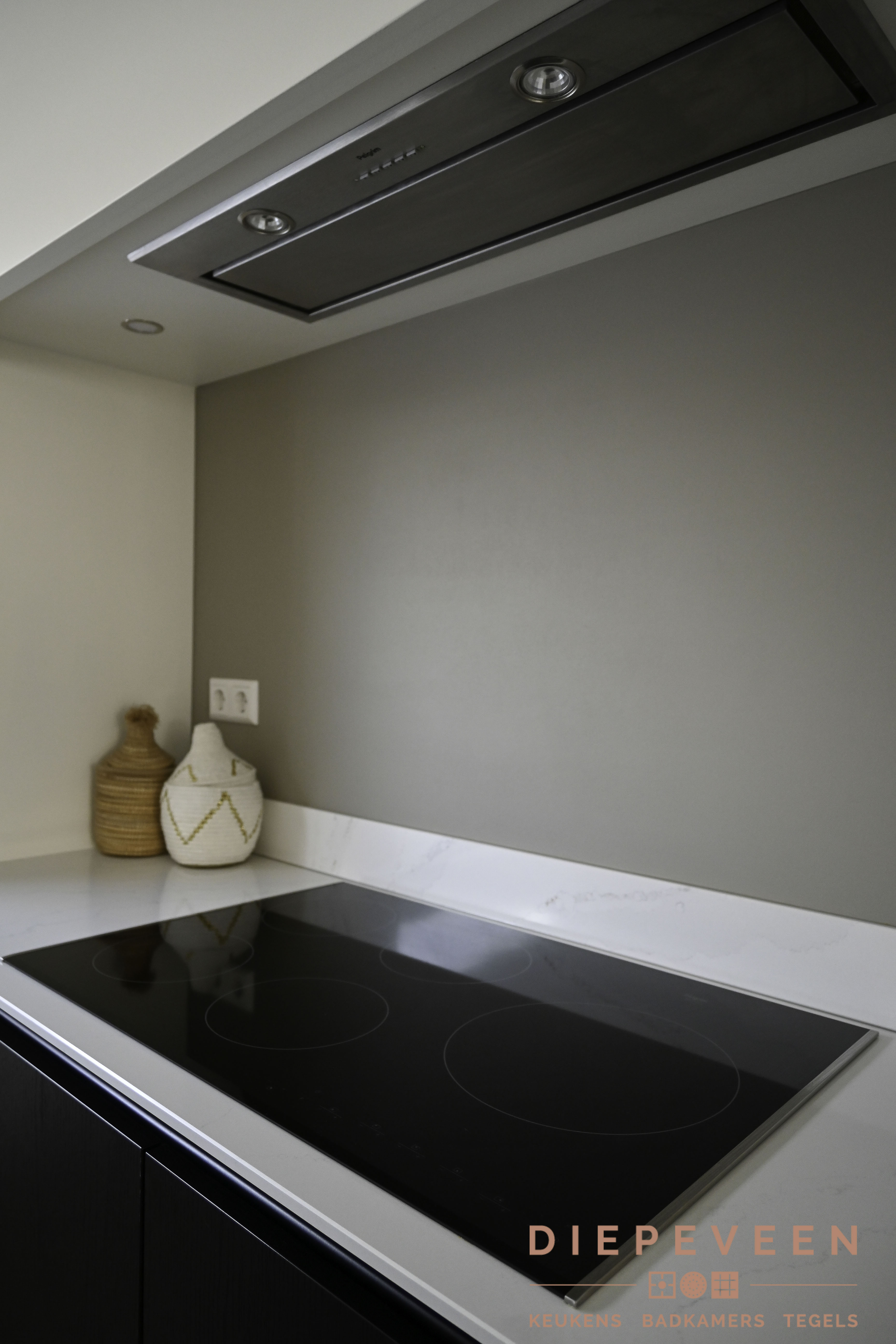 Bij deze keuken is gewerkt met zwarte fronten en een wit marmerlook werkblad. De kasten en lades zijn greeploos wat zorgt voor een strakke uitstraling. Deze keuken is een heerlijke plek om te genieten van de gerechten en een heerlijk glas wijn!