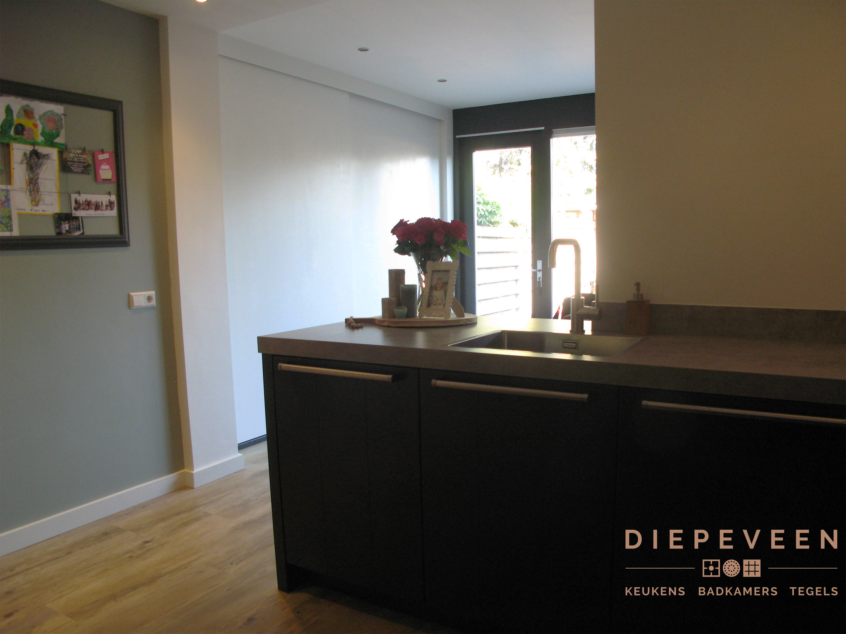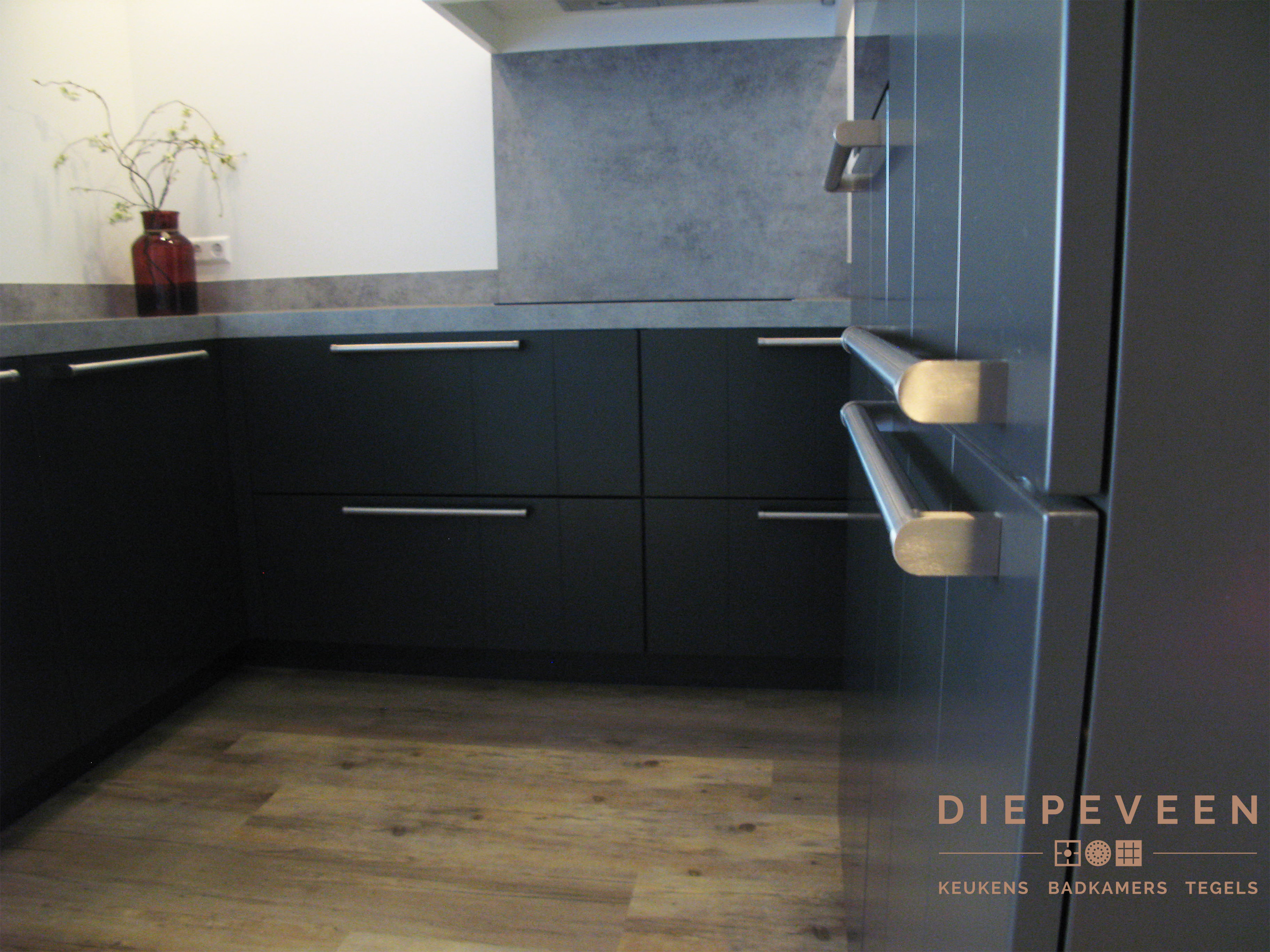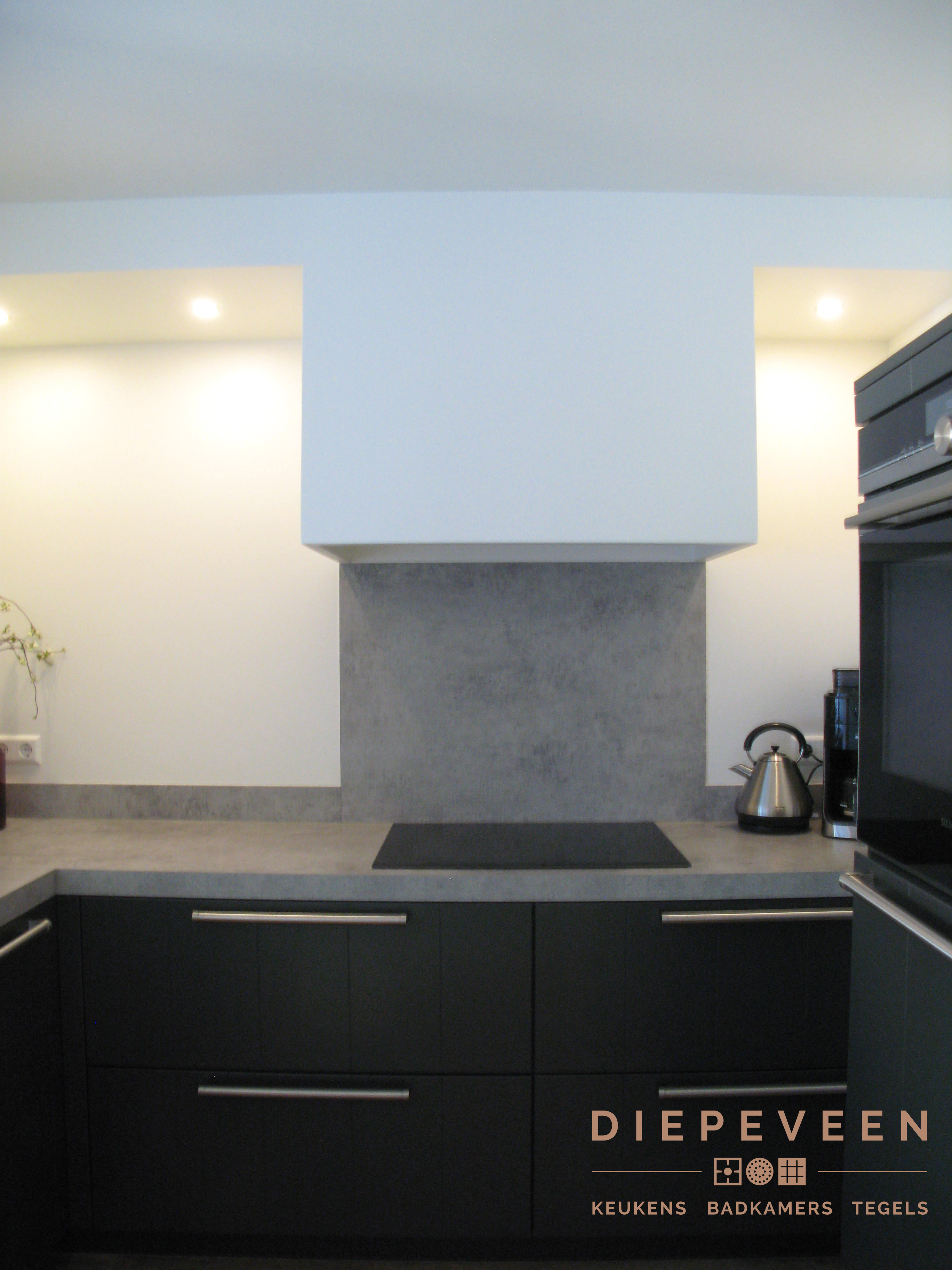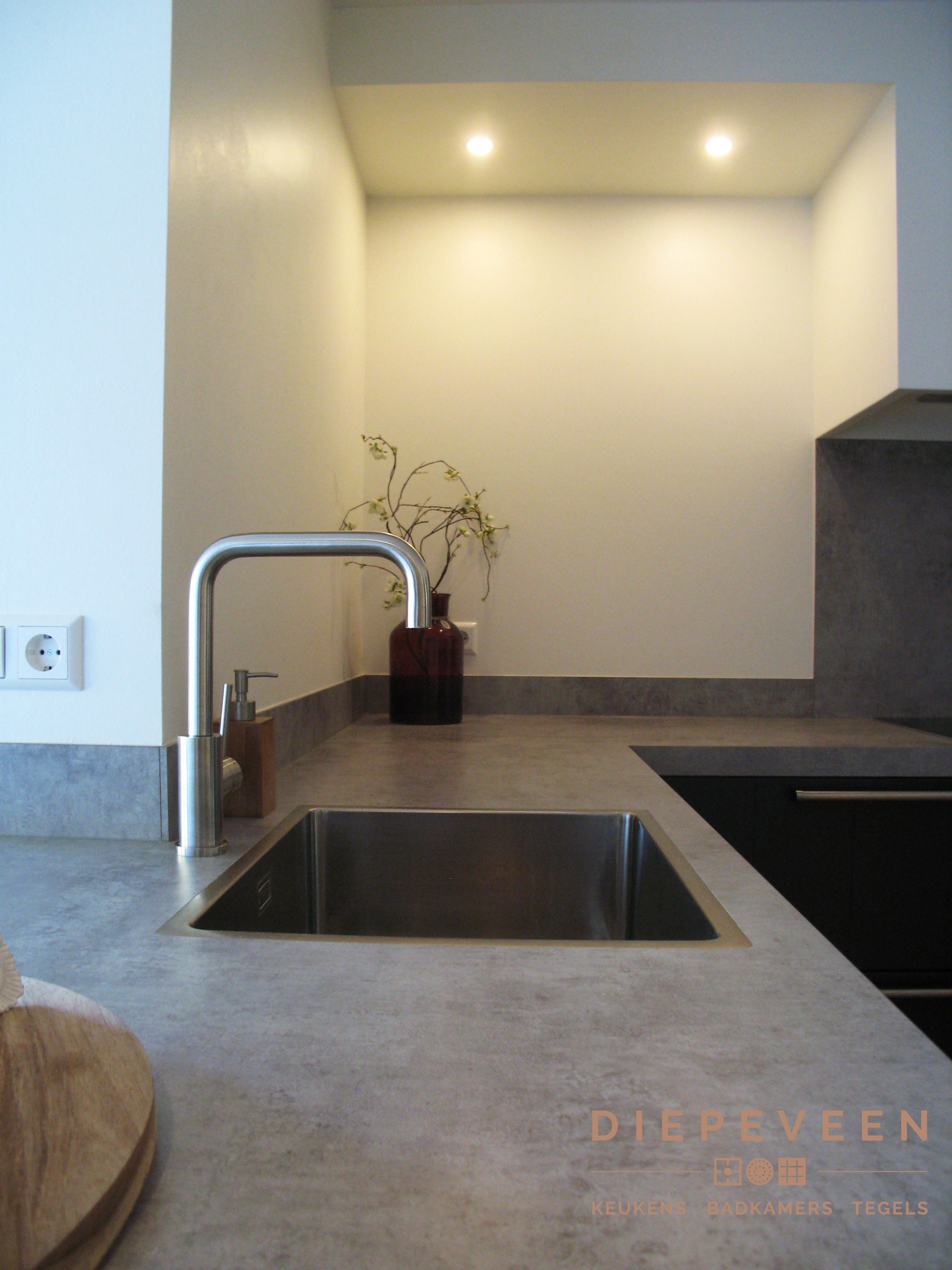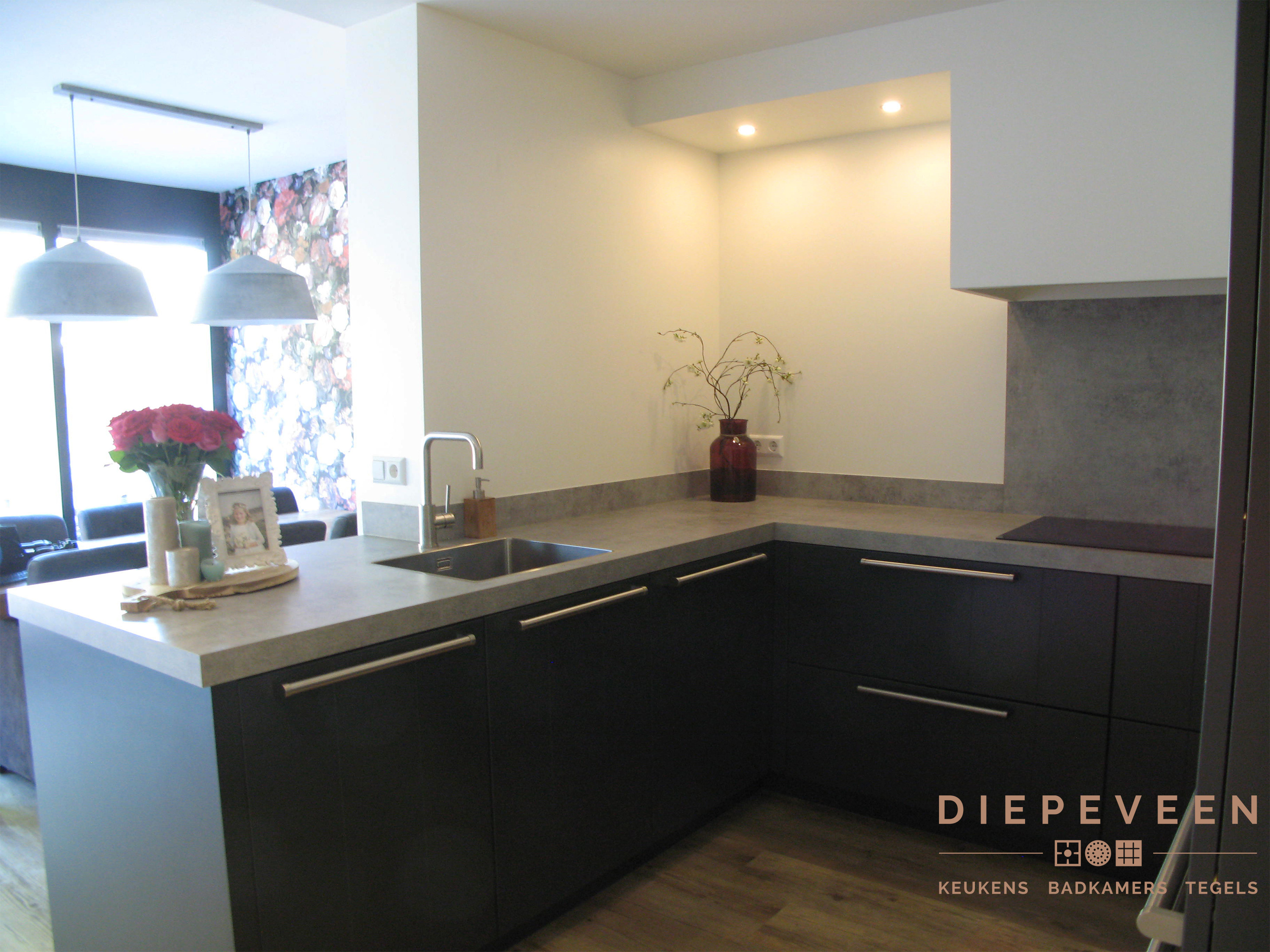 Prachtige moderne keuken. Mooi gecombineerd met een betonlook aanrecht blad en zwarte frontjes. Echt een eye-catcher.