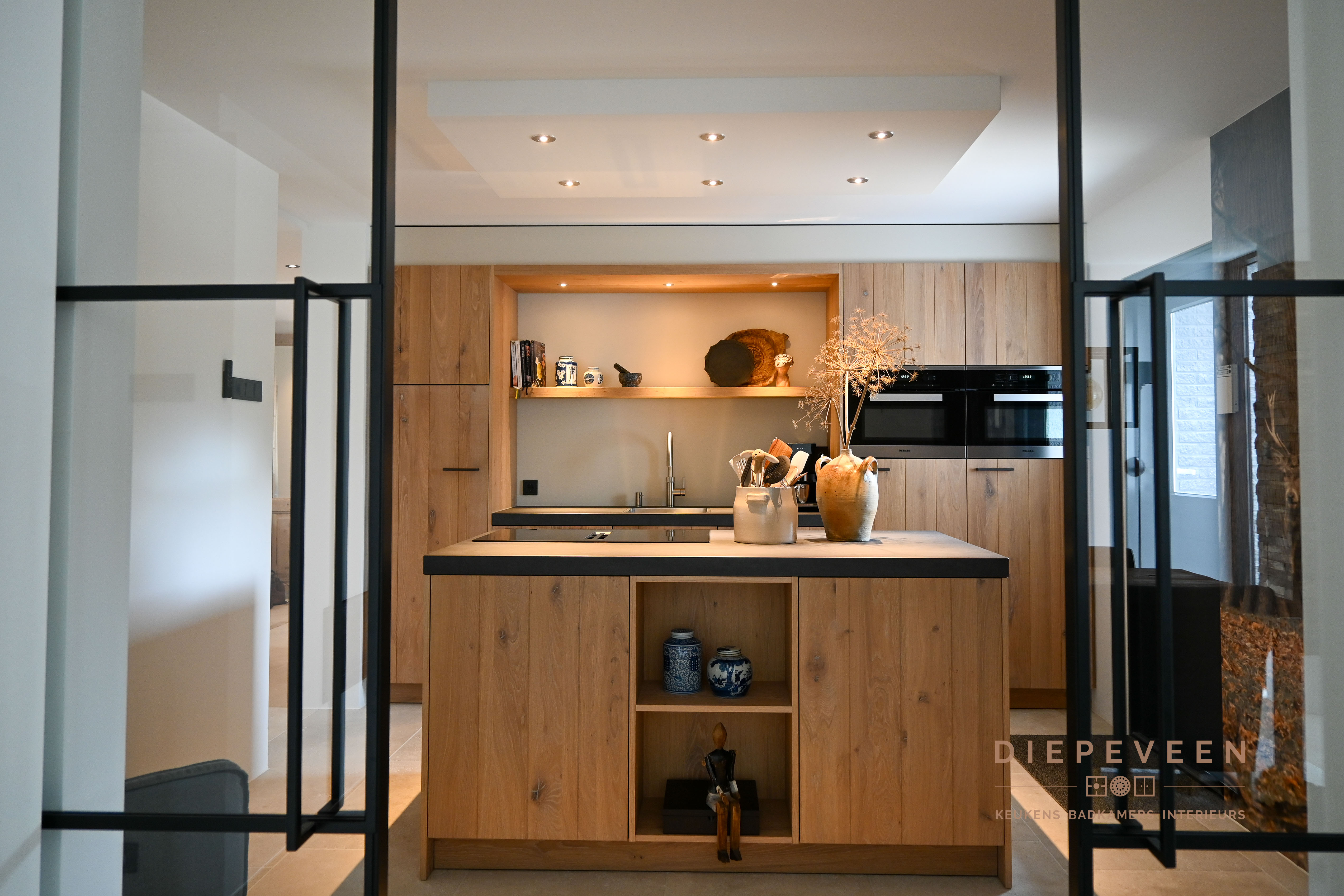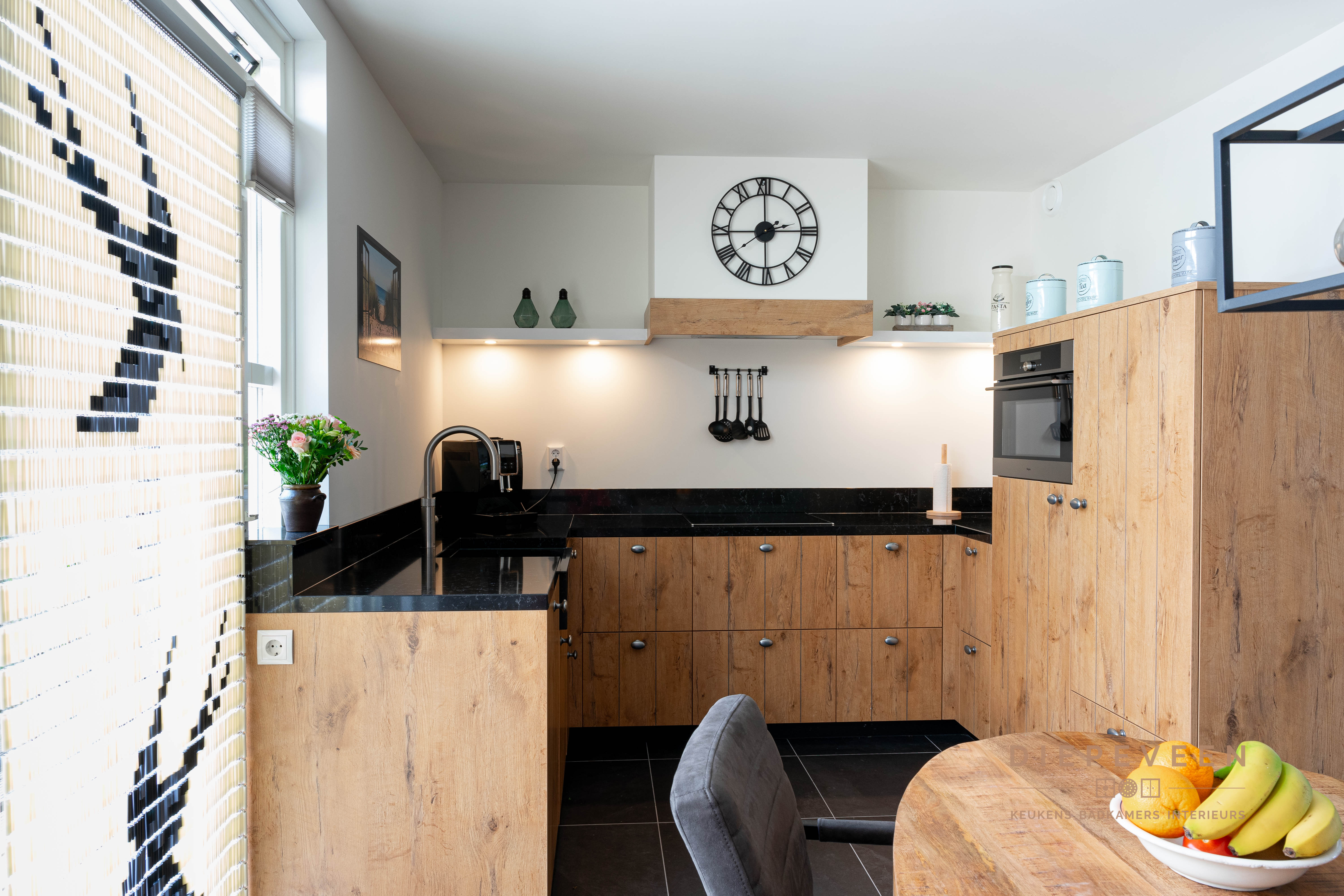 Een landelijke hoekkeuken uitgevoerd in hout. Leuk afgemaakt met de tegelstjes achter de schouw.