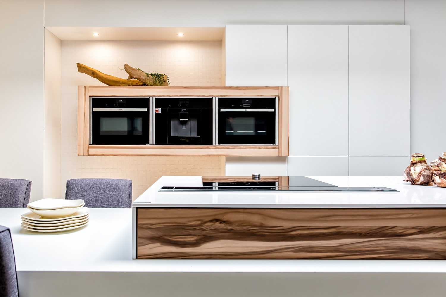 De fronten lopen door tot op de vloer: geen zichtbare plinten dus. Van hetzelfde hout is een ombouw voor de apparaten gemaakt, die zweven in de nis. De hoge kasten zijn voorzien van pushopen fronten. Door de nieuwste techniek is het zelfs mogelijk de koelkast en vaatwasser door middel van pushopen te openen!