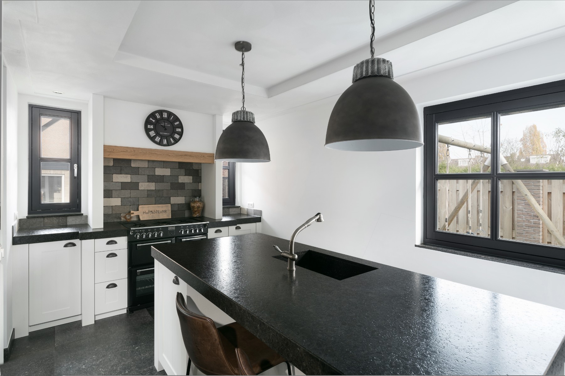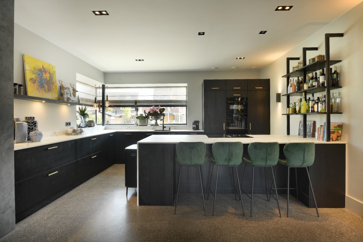Deze fjordgroene keuken is een echte eyecatcher! De groene kastenwand wordt gecombineerd met eiken fineer. Het geplankte eiken fineer komt terug in het kookeiland en in de nis naast de kastenwand. Het zwarte apparatuur is met zorg uitgezocht en past goed bij elkaar. De keuken is compleet greeploos waardoor deze minimalisme en rust uitstraalt.