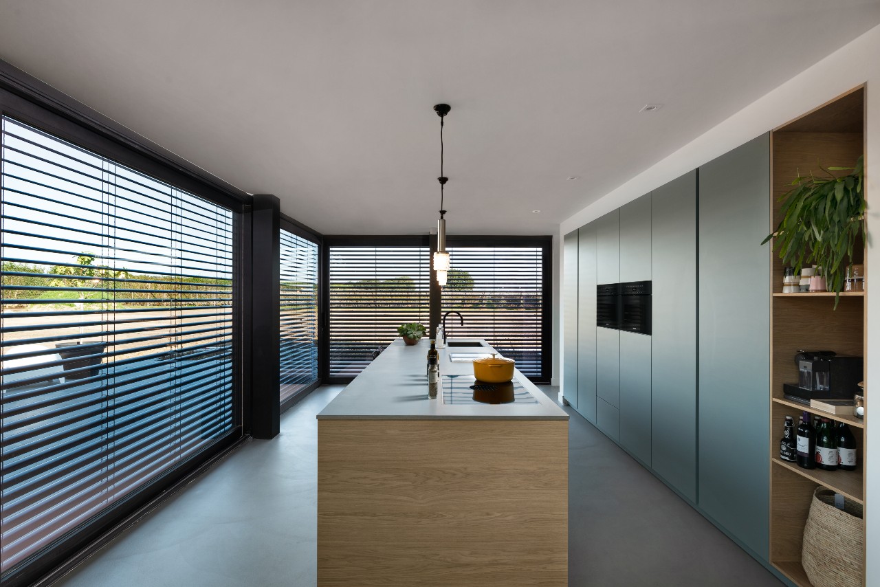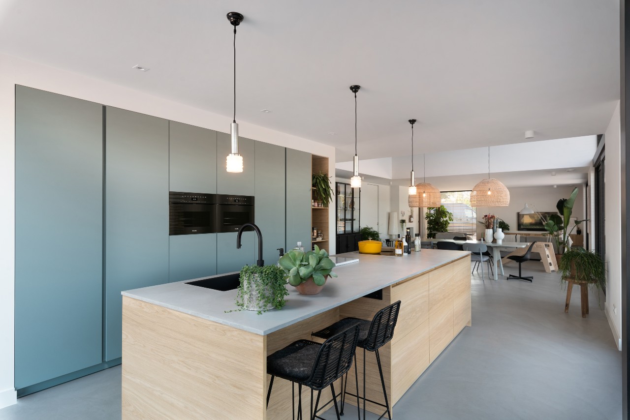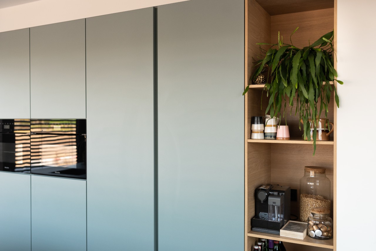 Deze fjordgroene keuken is een echte eyecatcher! De groene kastenwand wordt gecombineerd met eiken fineer.