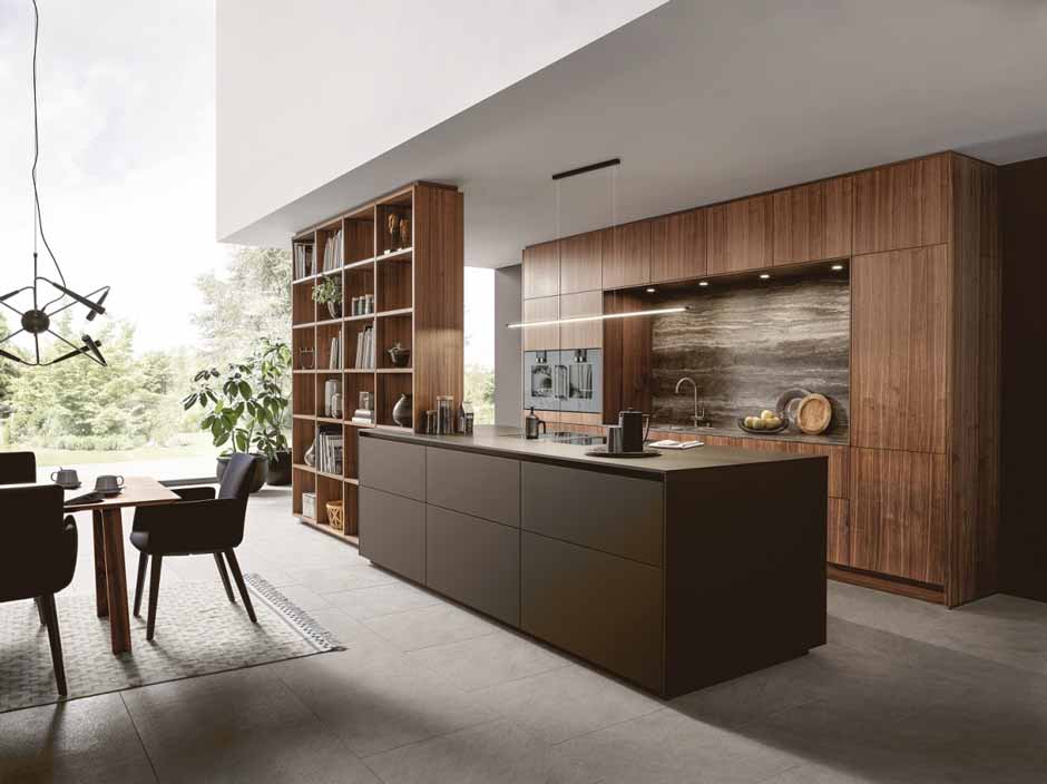 Amerikaans walnoothout heeft een lichtrode en warme gloed. Het is een stijlvolle houtsoort die vanwege de harmonieuze uitstraling veel wordt gebruikt bij het inrichten van woningen. Dankzij de combinatie van NX 620 walnoothouten fronten met homogene, mokkabruine oppervlakken wordt de structuur van het hout mooi uitgelicht en komt de keuken tot leven.