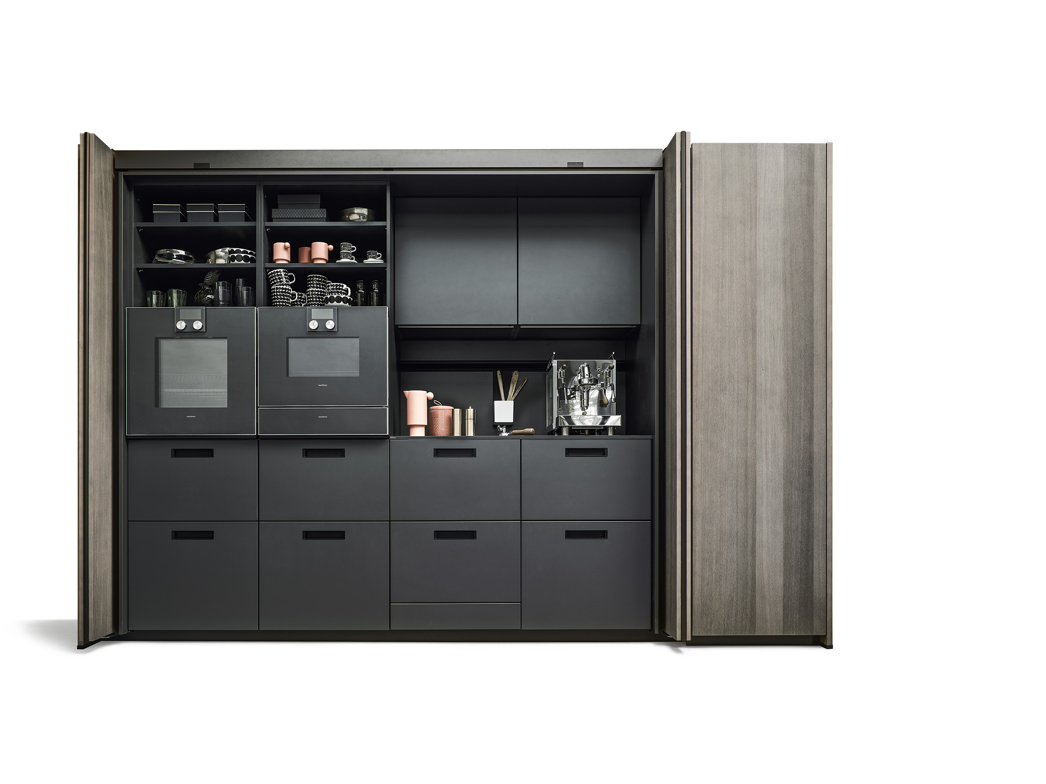 Een mooi en handig detail in deze keuken is de kast met inschuifbare deuren. De deuren kunnen op verschillende manieren geopend staan. Alleen de rechterkant open of alleen de linkerkant open, maar ook beide kanten kunnen helemaal open gedaan worden. Alle apparatuur verbergen? Dan kan de gehele kast dicht gedaan worden. De kast is niet alleen een mooie manier om de keukenapparatuur te verbergen, het is tegelijkertijd ook een architectonische blikvanger.