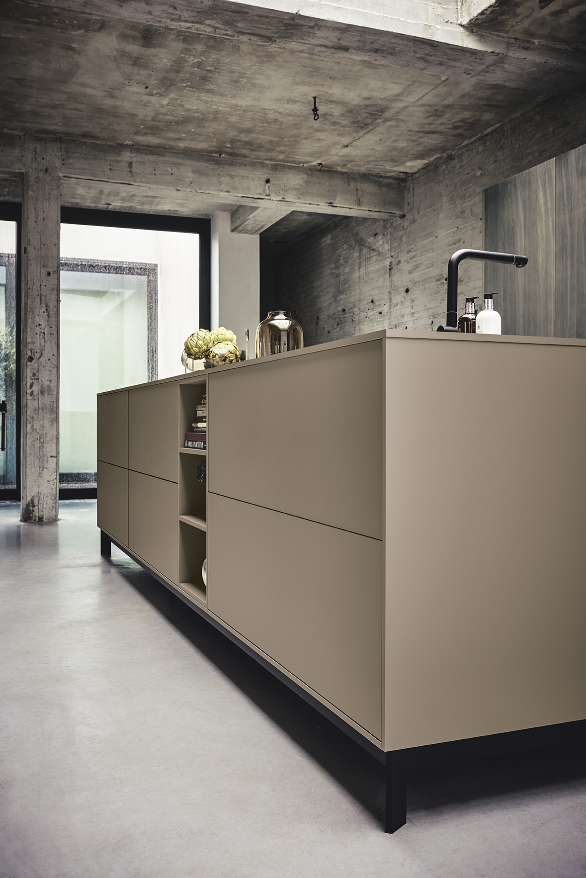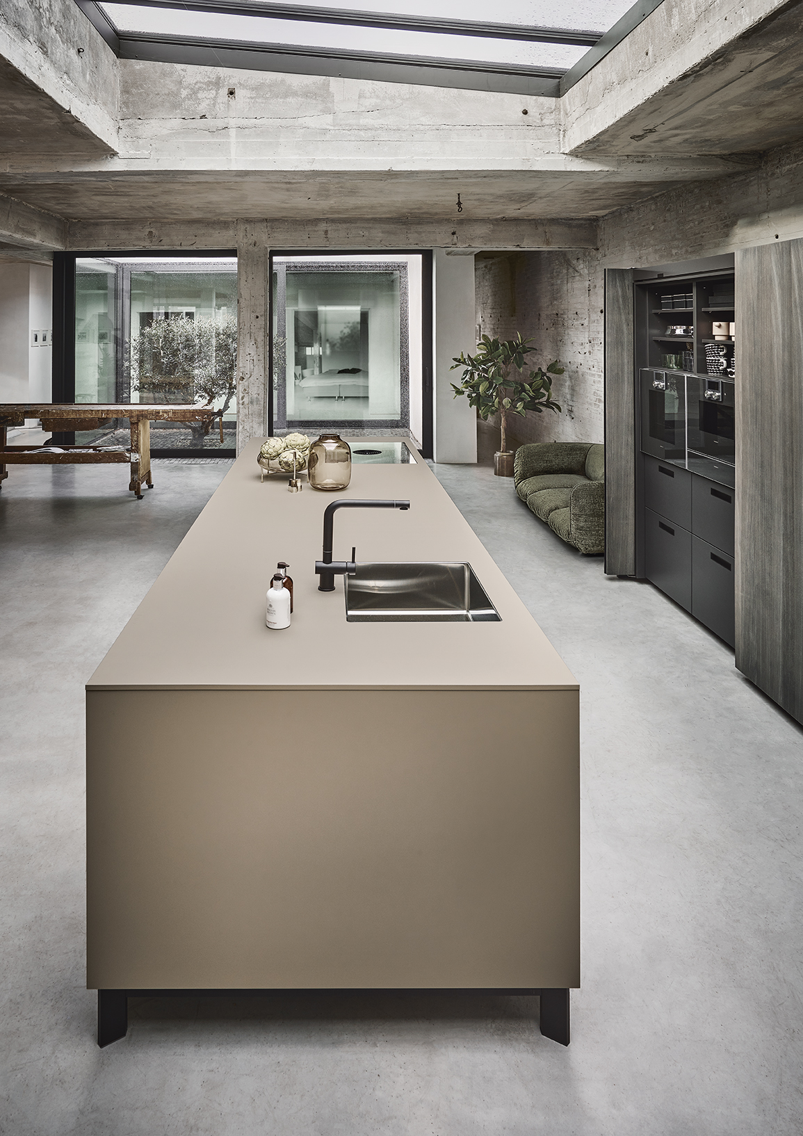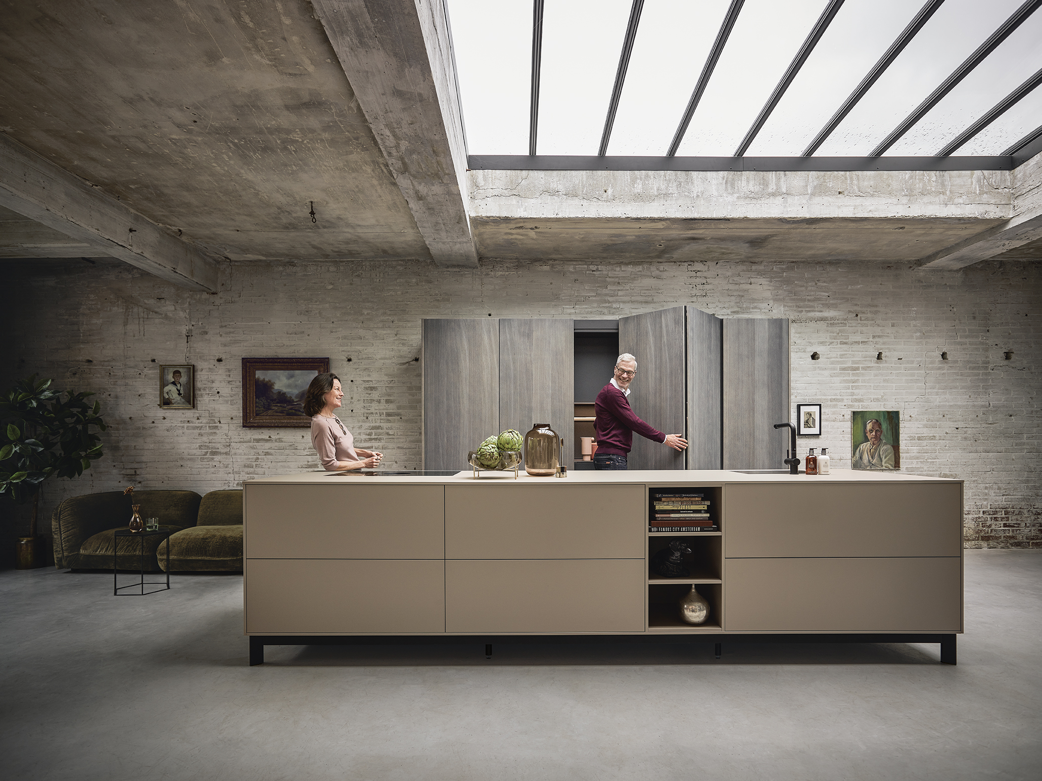 Het monochrome kookeiland in sahara-beige zijdemat lijkt wel op zijn pootjes te zweven. Het greeploze ontwerp heeft een minimalistische uitstraling. Achter het kookeiland bevindt zich een kast met vouwdeuren, die de keukenapparatuur op een slimme manier verbergt. Met gesloten deuren heerst er een aangename rust in de kamer.
