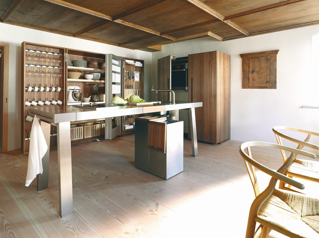 Koken heeft eigenlijk veel weg van een perfect passend meubel in elkaar zetten. Met de juiste gereedschappen en materialen schroef je alle elementen in elkaar tot één product dat nooit lijkt te hebben bestaan uit losse stukjes. Met dat idee in het achterhoofd namen de ontwerpers van het Weense E00S de keuken onder de loep. Als een werkplaats waar je je gereedschap overzichtelijk kunt opbergen en altijd binnen handbereik hebt. De inspiratie van een ambachtelijke timmermanswerkplaats is duidelijk terug te zien in de keukenkasten, die net als gereedschapskasten een vast plekje, haakje of bakje bieden voor alle keukentools. Ook de werkbank, die net als de originele houten werktafel bestaat uit schuine poten met daarop een stevig blad, verwijst naar het verleden. Maar dan wel in een uiterst modern jasje.