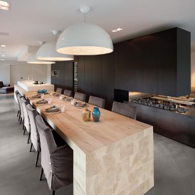 Dit concept is gerealiseerd in samenwerking met Architectenbureau WillemsenU. Deze stijlvolle keuken kenmerkt zich door een robuust eiland met geïntegreerde tafel en een achterwandkastensysteem met open haard waar een uitgekiend metalen draagconstructie in is verwerkt. Hierdoor is het mogelijk de open haard zwevend te maken. Tevens functioneert deze haard als roomdivider tussen keuken en woonkamer.