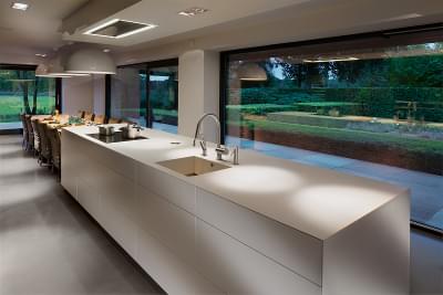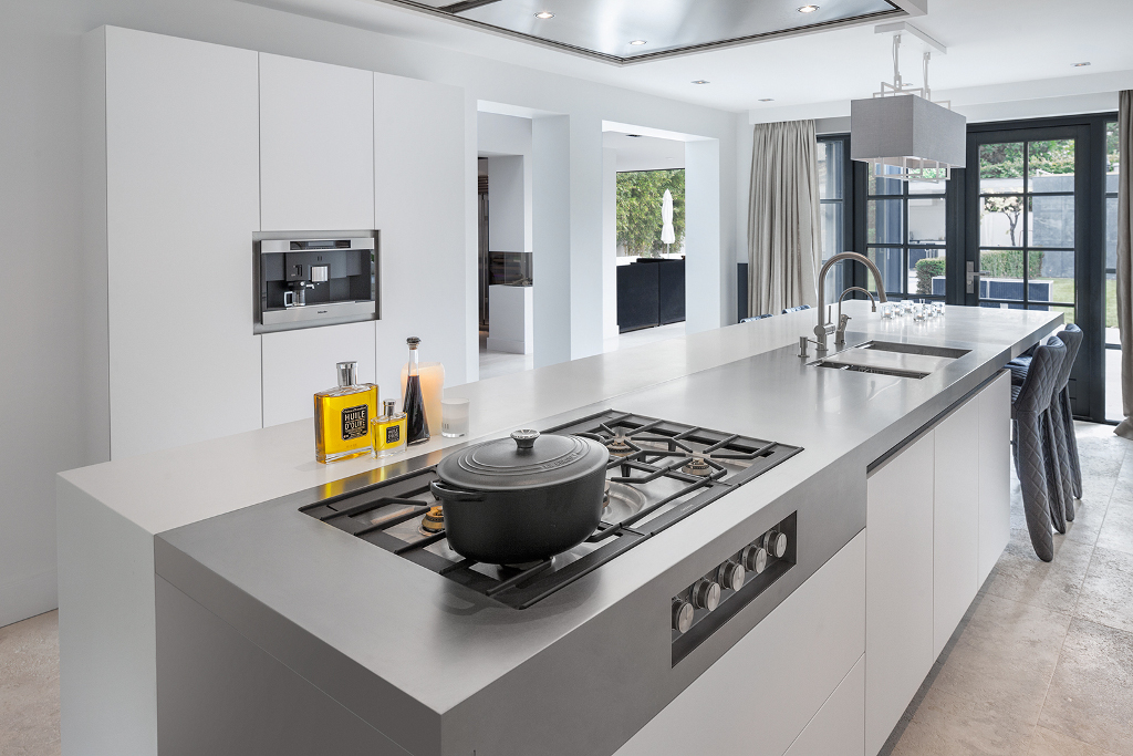 De doordachte details verfijnen deze keuken en geeft het een moderne uitstraling. De zijwanden, fronten en het blad van het eiland zijn vervaardigd uit Corian. Om de keuken zo strak mogelijk te houden, zijn de fronten elektronisch te openen zonder zichtbare grepen.