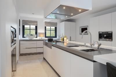 Deze stijlvolle keuken kenmerkt zich door een spannend lijnenspel tussen het subtiel vormgegeven strakke roestvaststaal en de meer gematigde vormen van de gelakte onderdelen, waardoor een uitgebalanceerde keuken ontstaat.