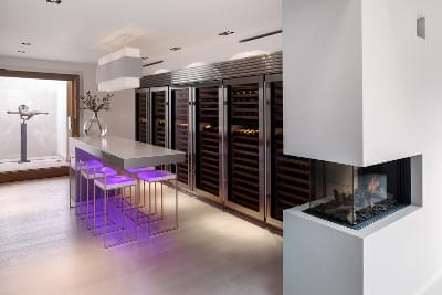 Dit keukenontwerp heeft een aparte wijnruimte met daarin apparatuur van Sub-Zero. De proeftafel is gerealiseerd uit een metalen vrijhangende constructie, die mogelijk gemaakt wordt door een contragewicht in de vloer. Uitgevoerd met een inlegblad van Solid Surface.