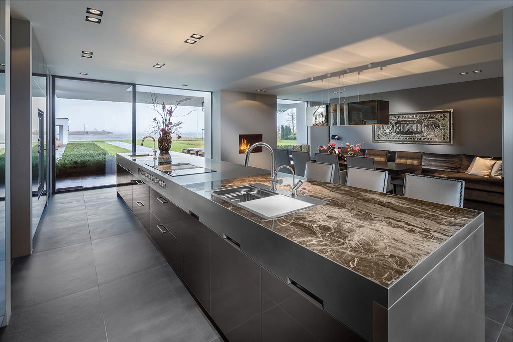 Het karakteristieke, zes meter lange kookeiland is een ware eyecatcher. Dankzij het dikke stalen frame en de twee elementen van marmer aan beide zijden ontstaat een unieke optiek. Door dit stalen frame kan er gespeeld worden met de dikte van het werkblad. Het marmer is op gelijke hoogte ingelegd in het frame, wat het geheel een uiterst verfijnde look verleent. Ook de spoelbakken aan beide zijden zorgen voor symmetrie.