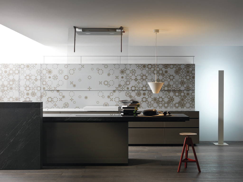 Voor Artematica Vitrum Arte heeft Valcucine een speciale techniek ontwikkeld om decoraties op glas te creëren. De motieven zijn gesneden uit gekleurde folie en worden met de hand aangebracht op de gehard glazen panelen. Deze procedure maakt elke keuken uniek en persoonlijk.