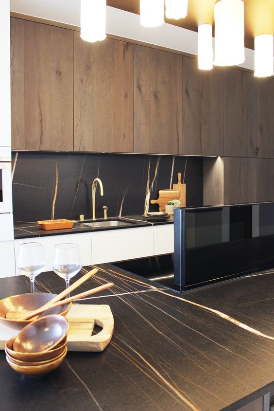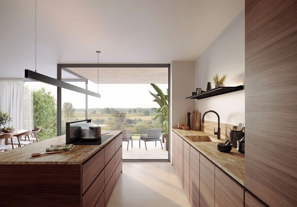 Strakke kookplaten met geïntegreerde afzuiging, uitgevoerd in glans, mat en prestige.