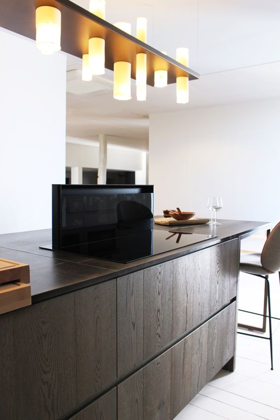 Functionaliteit en stijl worden gecombineerd in deze werkbladafzuiging. De afzuigkap achteraan de kookplaat is verstelbaar in hoogte en afgewerkt in glas.