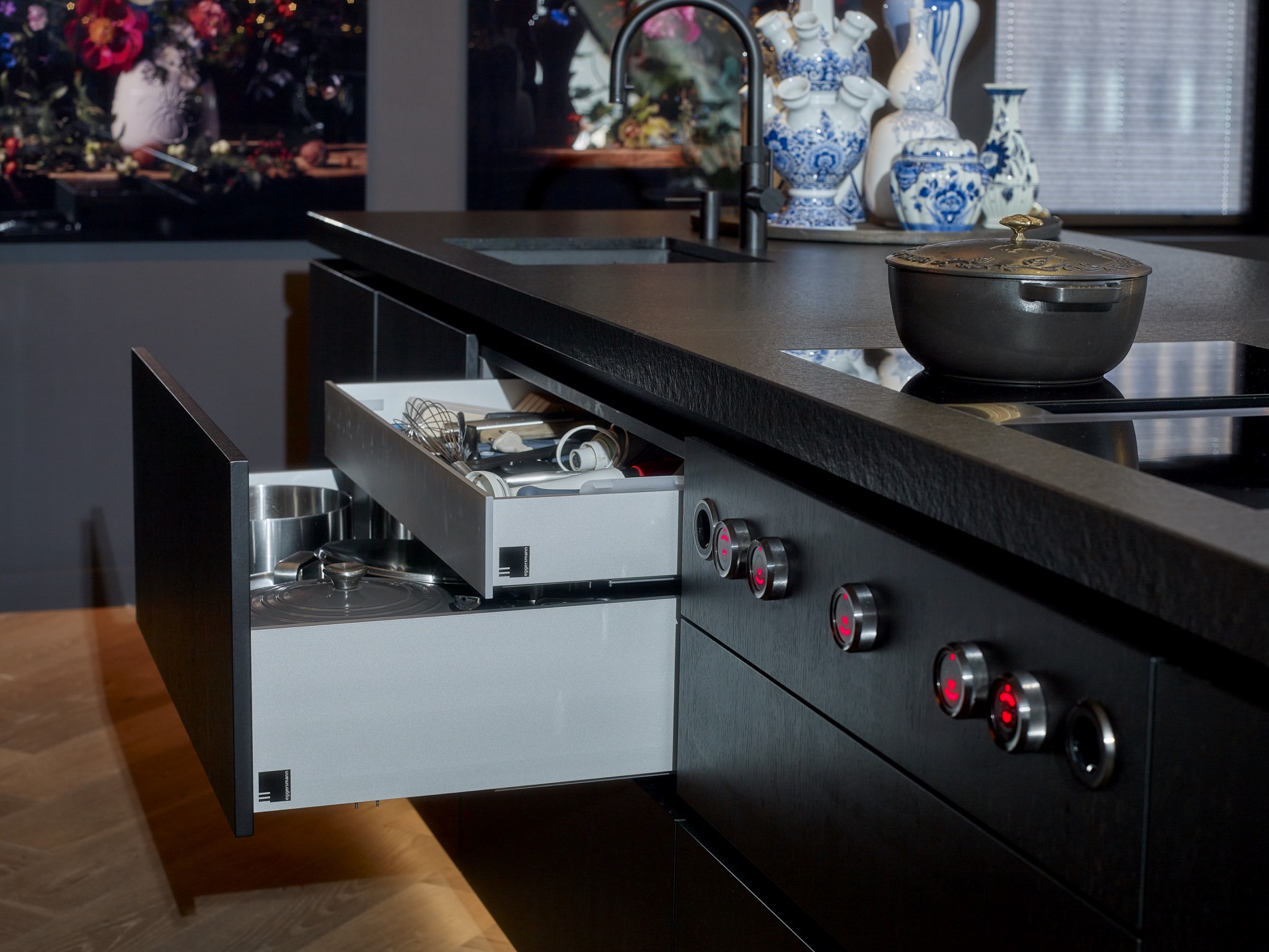 Tieleman Keukens binnenkijker: prachtige zwarte Eggersmann keuken met apparatuur van Miele, Siemens, Bora, Quooker en granieten aanrechtblad van Van Gils.