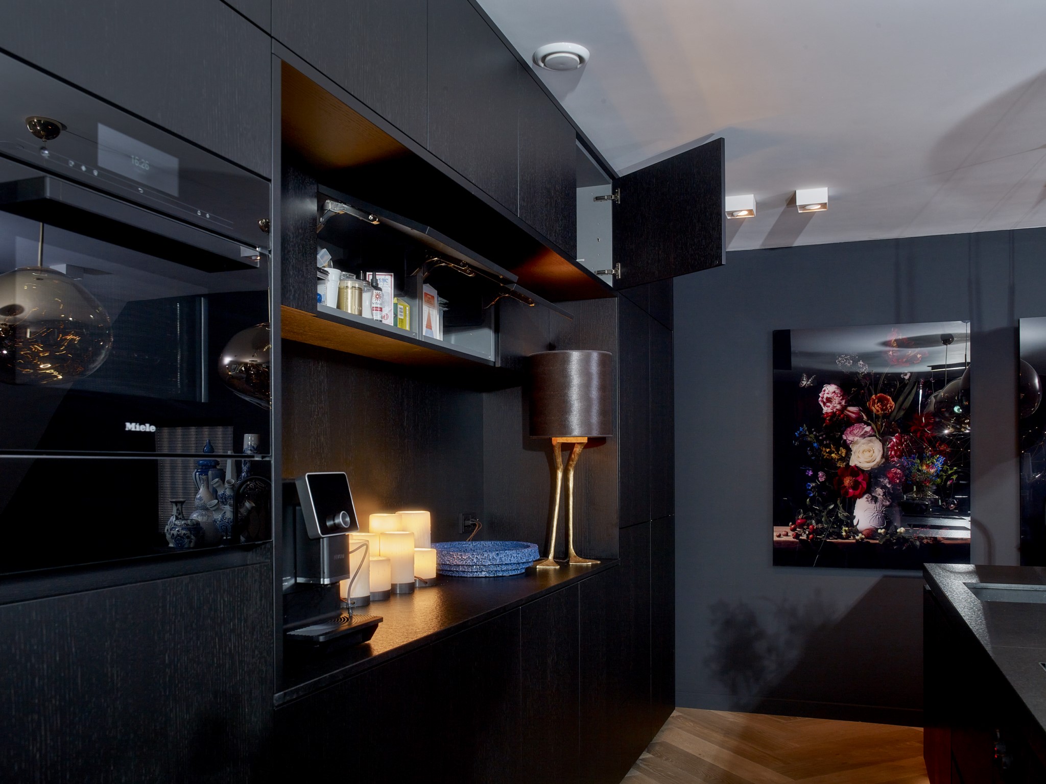 De juiste keuze maken is niet altijd even makkelijk, maar toch zijn de eigenaren erin geslaagd om een prachtige keuken samen te stellen. Het was al snel duidelijk dat de keuken helemaal zwart zou worden. De basis moest rustig worden en met accessoires, bloemen en lampen zou contrast gecreëerd worden in de keuken. Hoewel de keuken volledig zwart en greeploos is, hebben de fronten wel een houtnerf.