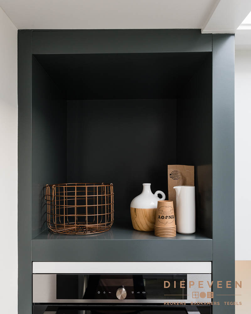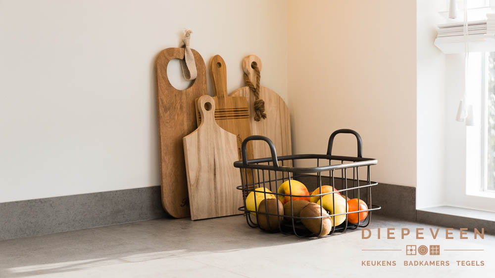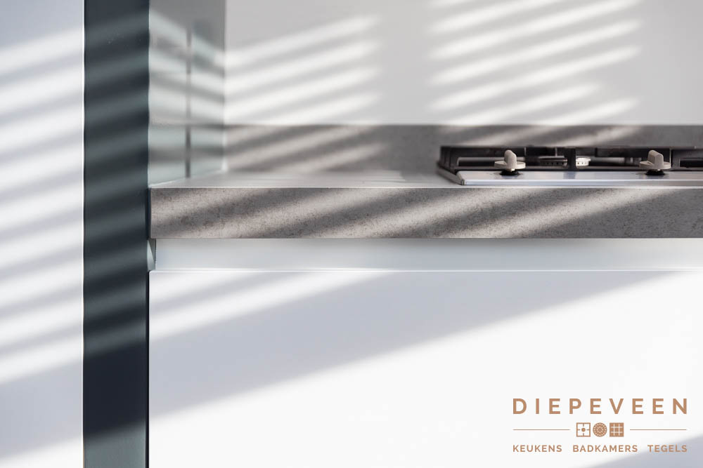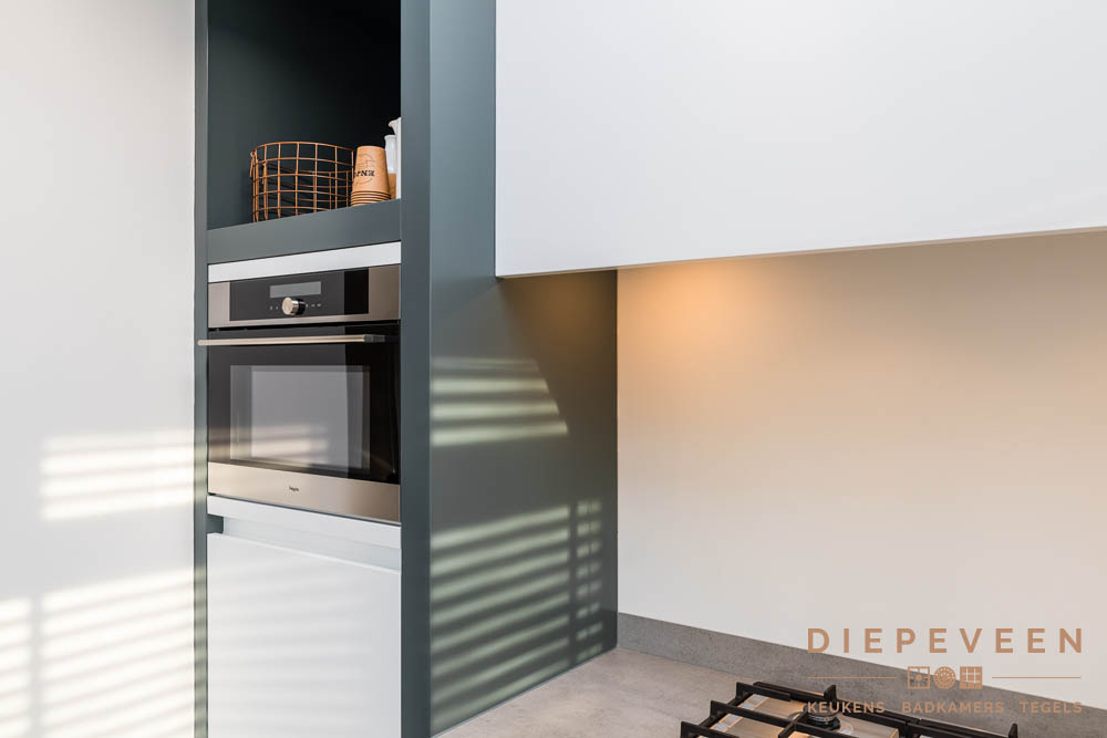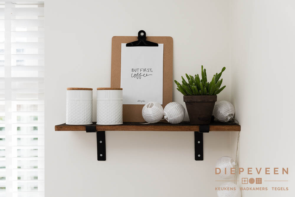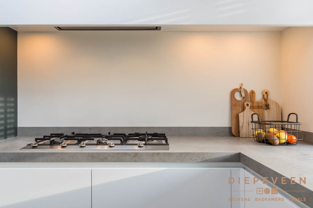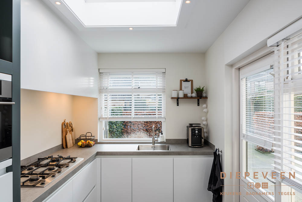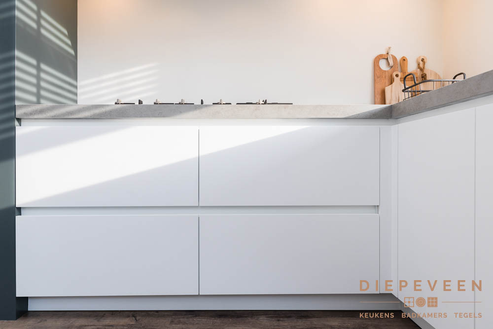 Een prachtige witte greeploze keuken. Tijdloos door de lichte kleuren en prachtig aangekleed met accessoires.