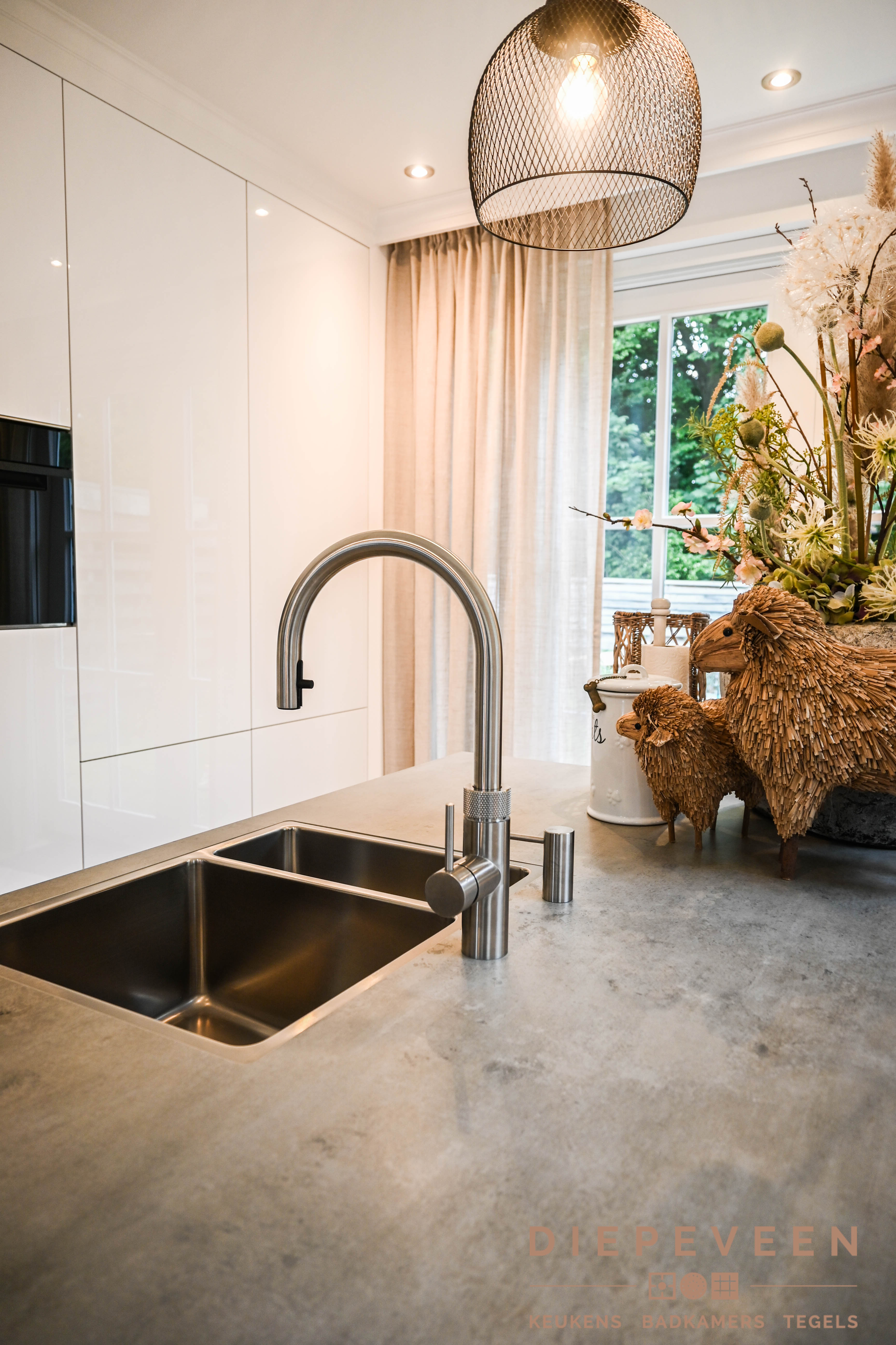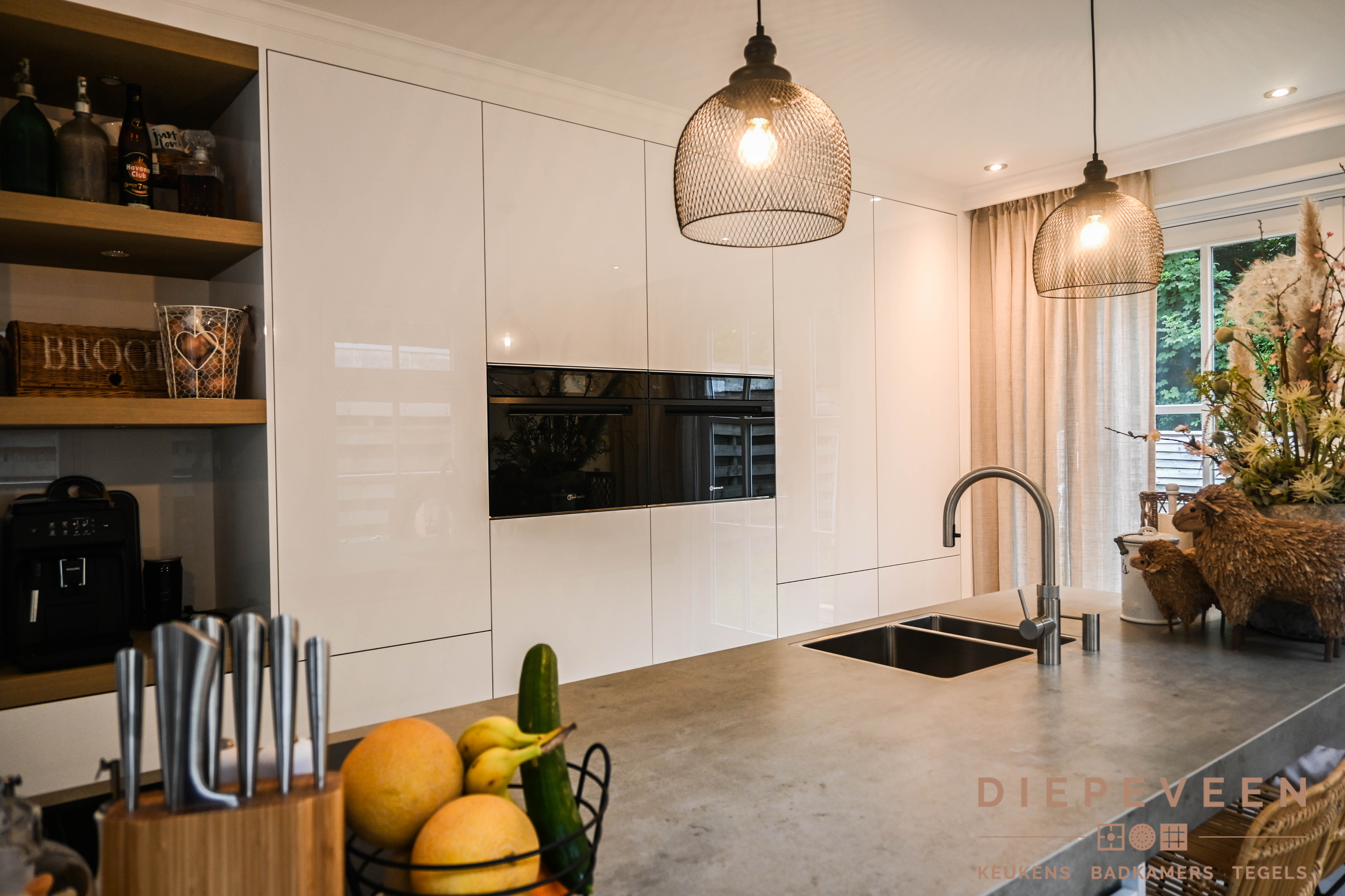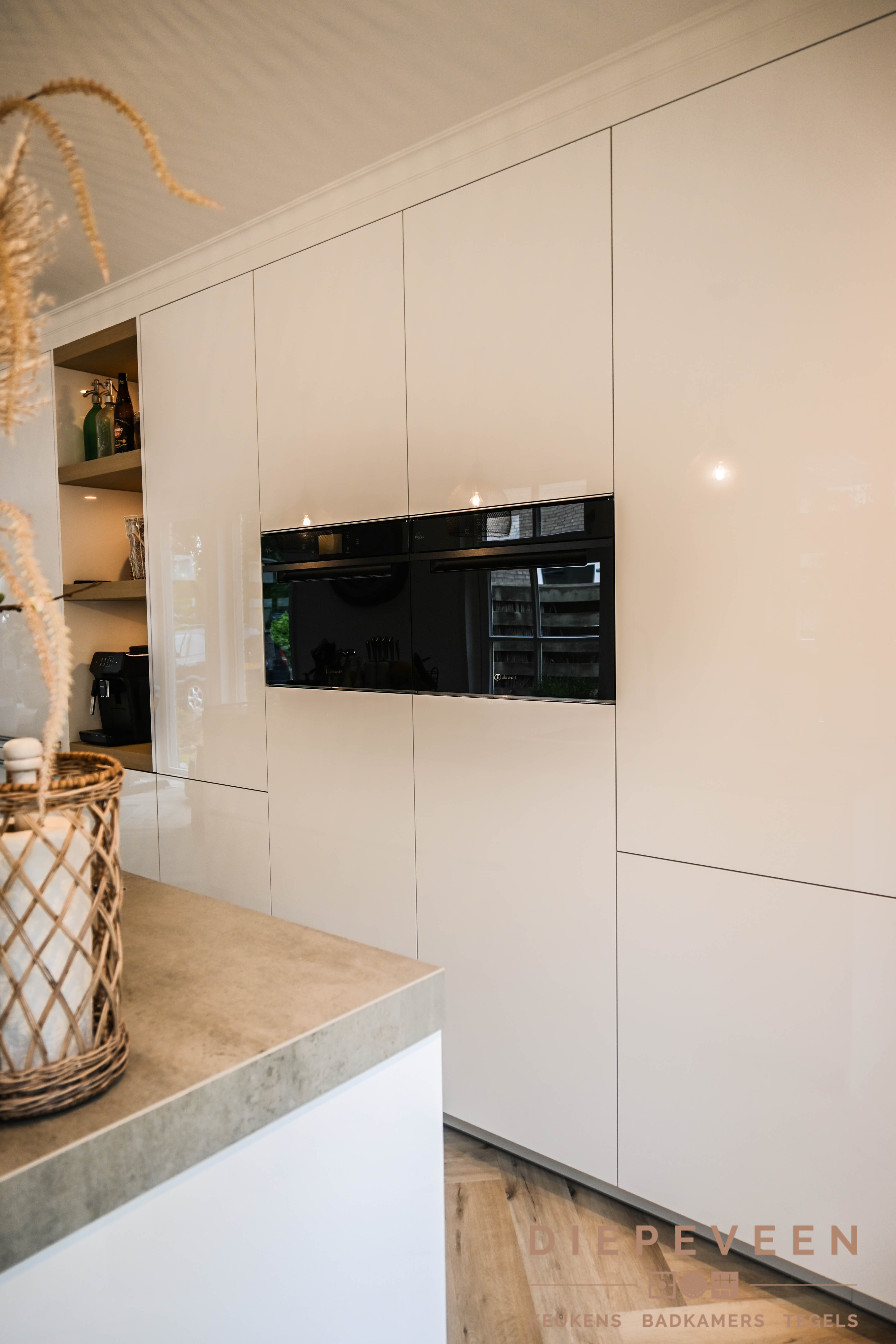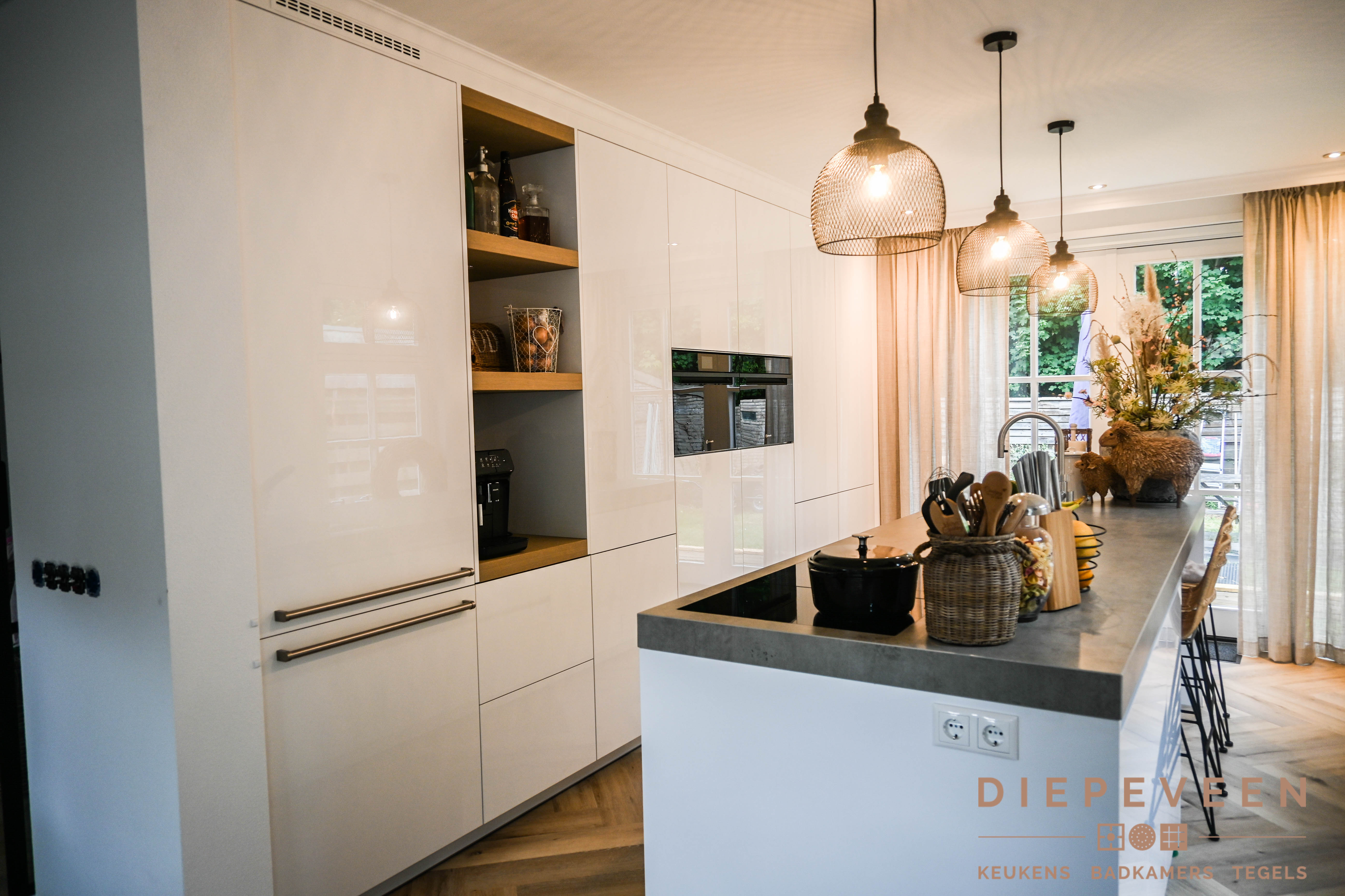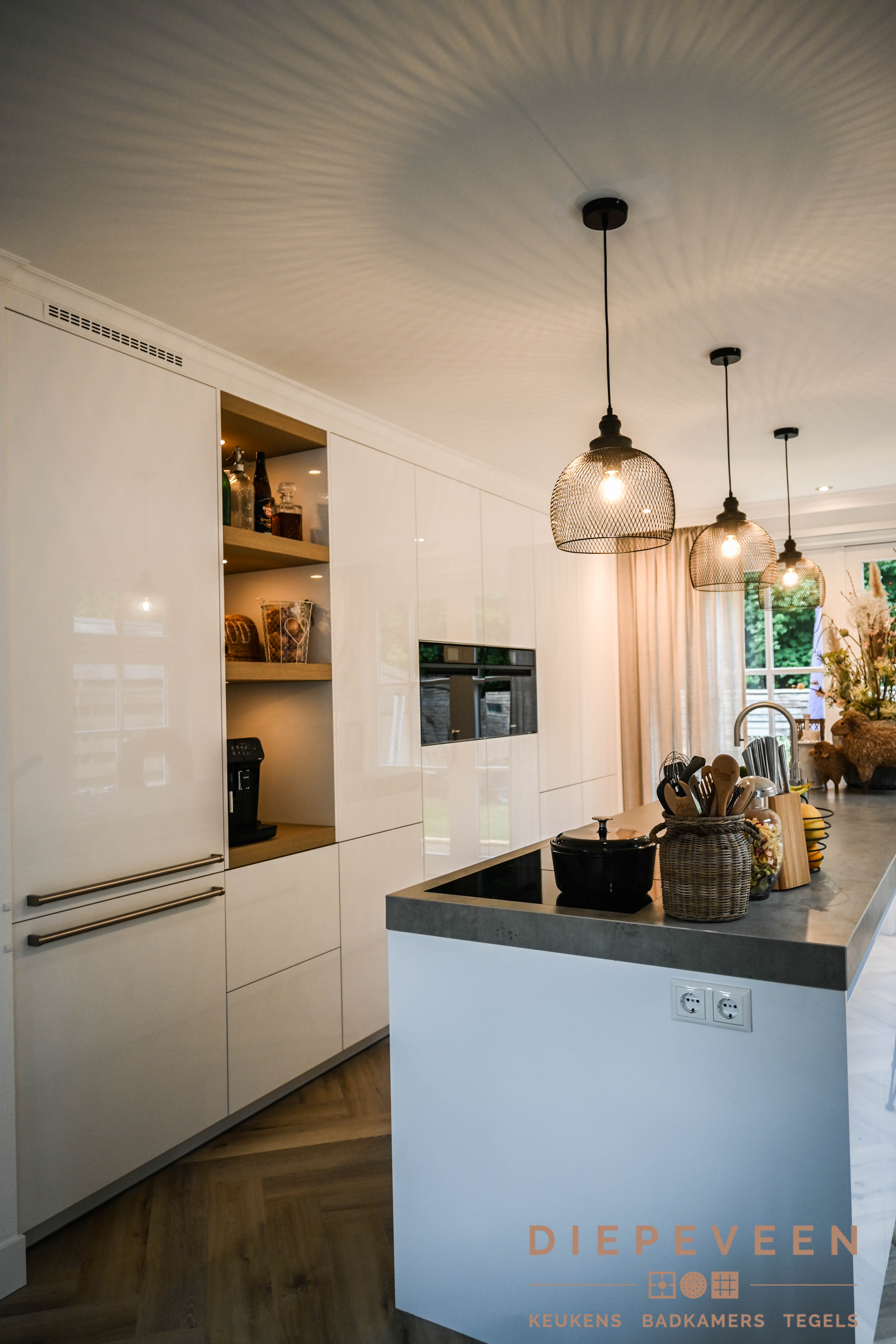 Een sfeervolle keuken. De opstelling bestaat uit een eiland en een kastenwand met een nis voor wat spulletjes als bijvoorbeeld een koffiezet automaat. De fronten zijn uitgevoerd in hoogglans wit en het werkblad in een betonlook. Het greeploze apparatuur van het merk Bauknecht valt heel mooi weg in de hoge kasten.