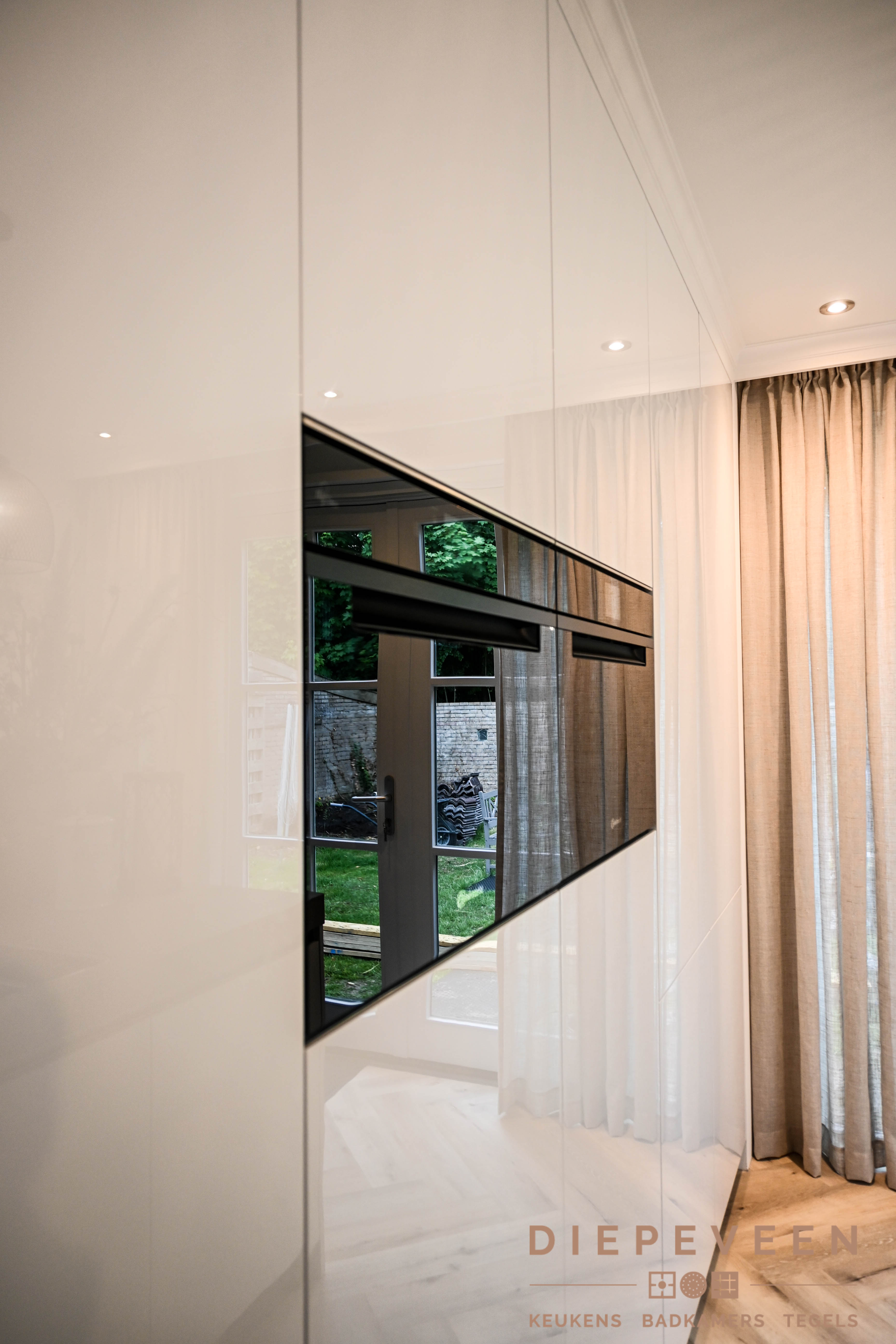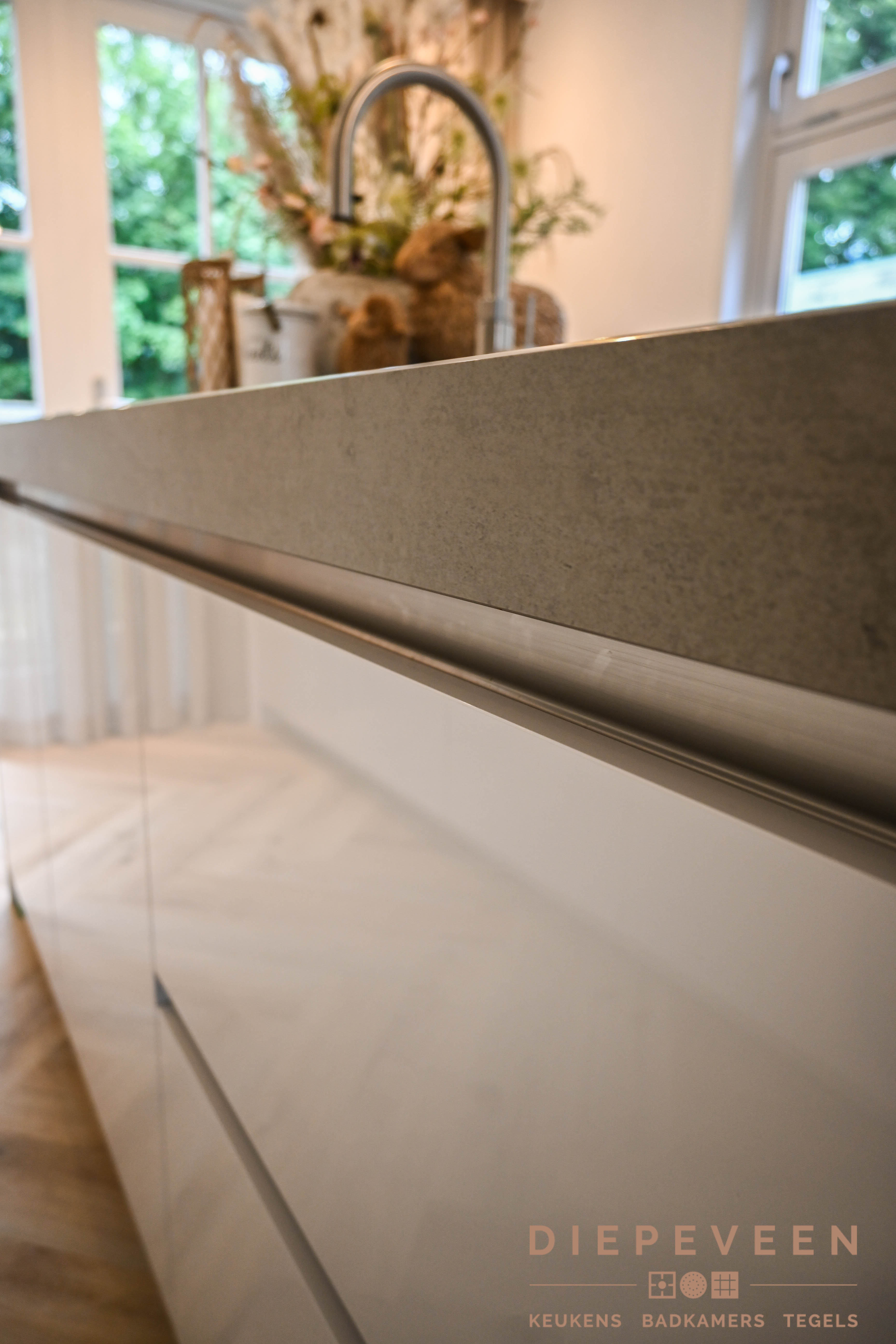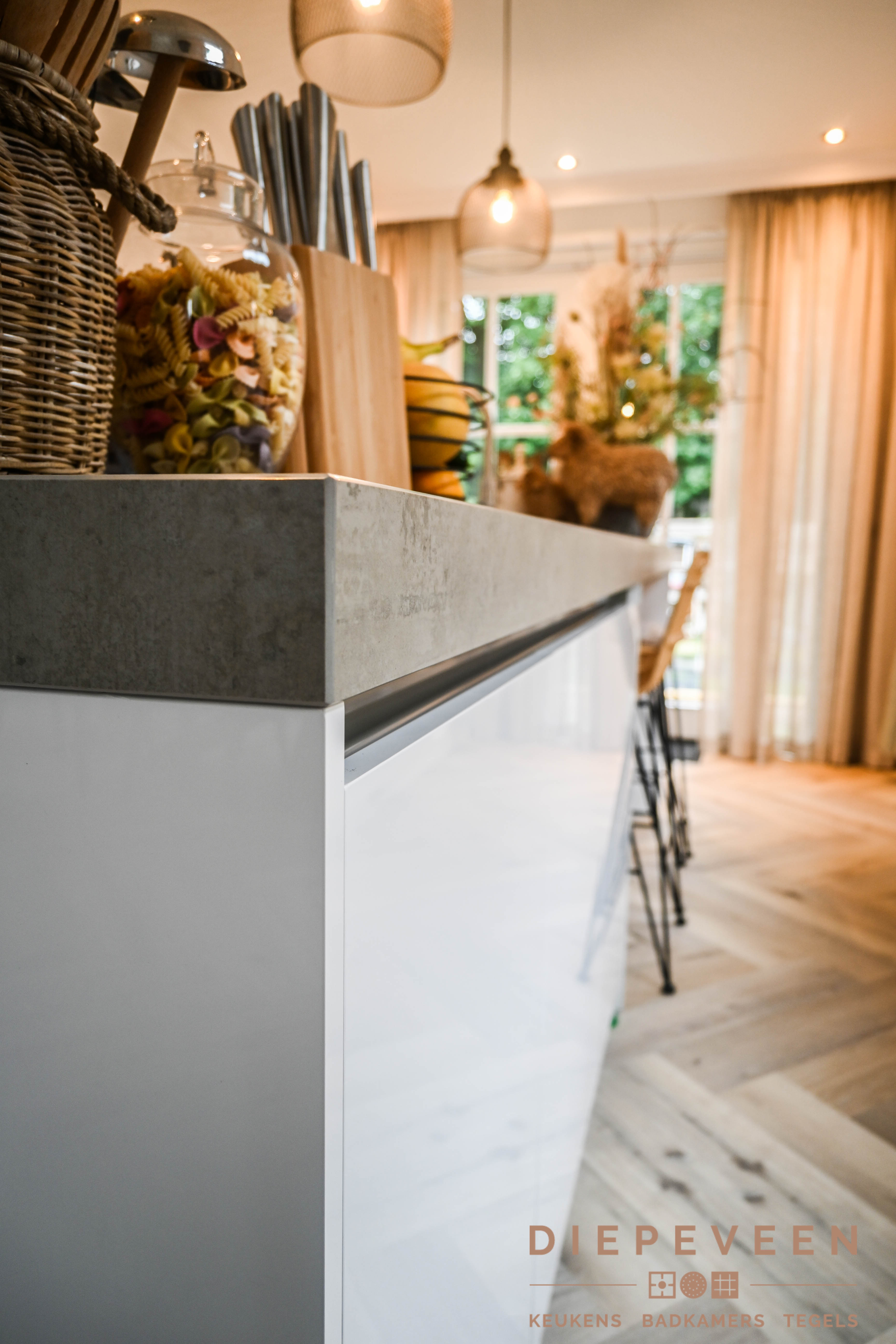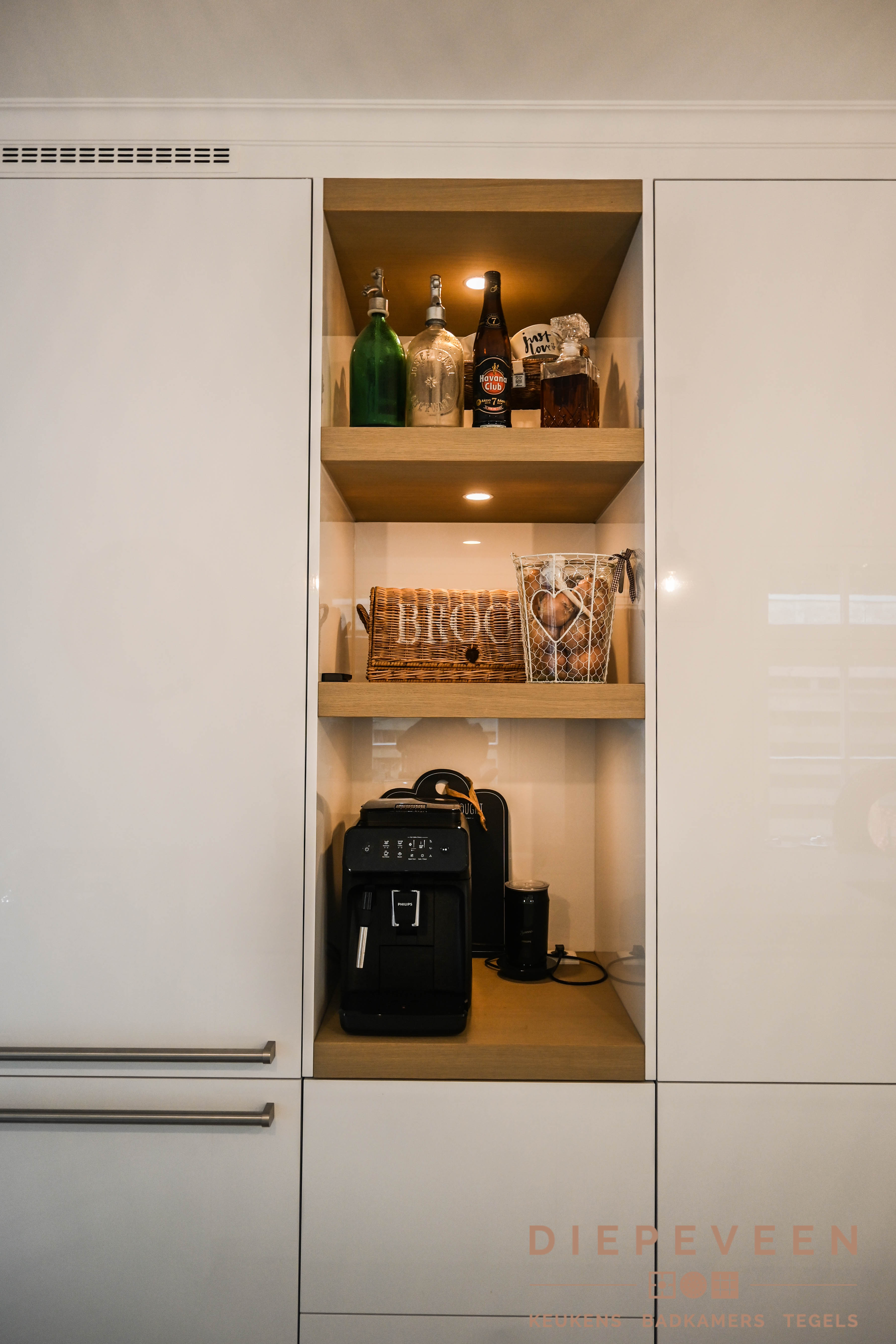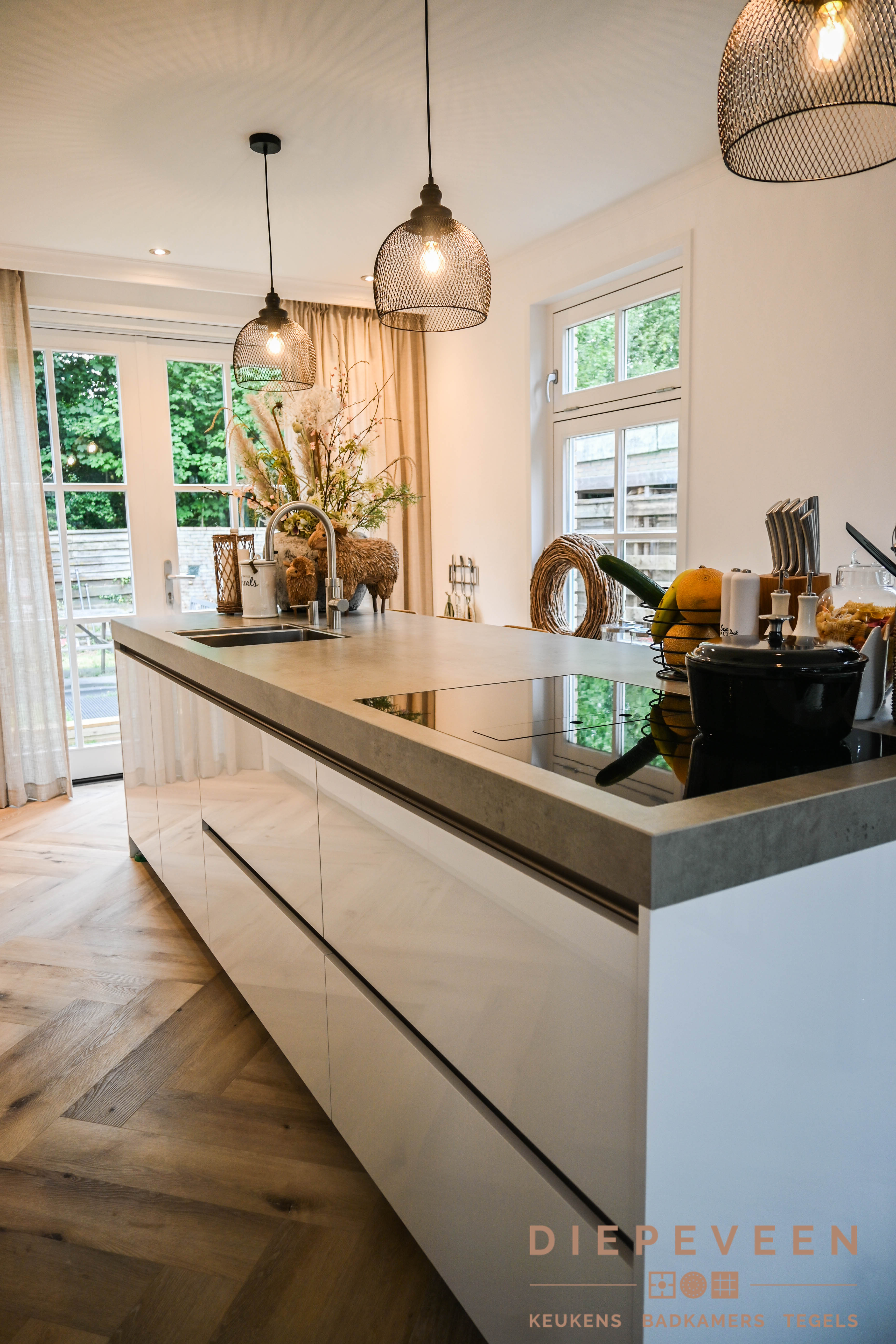 Een sfeervolle keuken. De opstelling bestaat uit een eiland en een kastenwand met een nis voor wat spulletjes als bijvoorbeeld een koffiezet automaat. De fronten zijn uitgevoerd in hoogglans wit en het werkblad in een betonlook. Het greeploze apparatuur van het merk Bauknecht valt heel mooi weg in de hoge kasten.