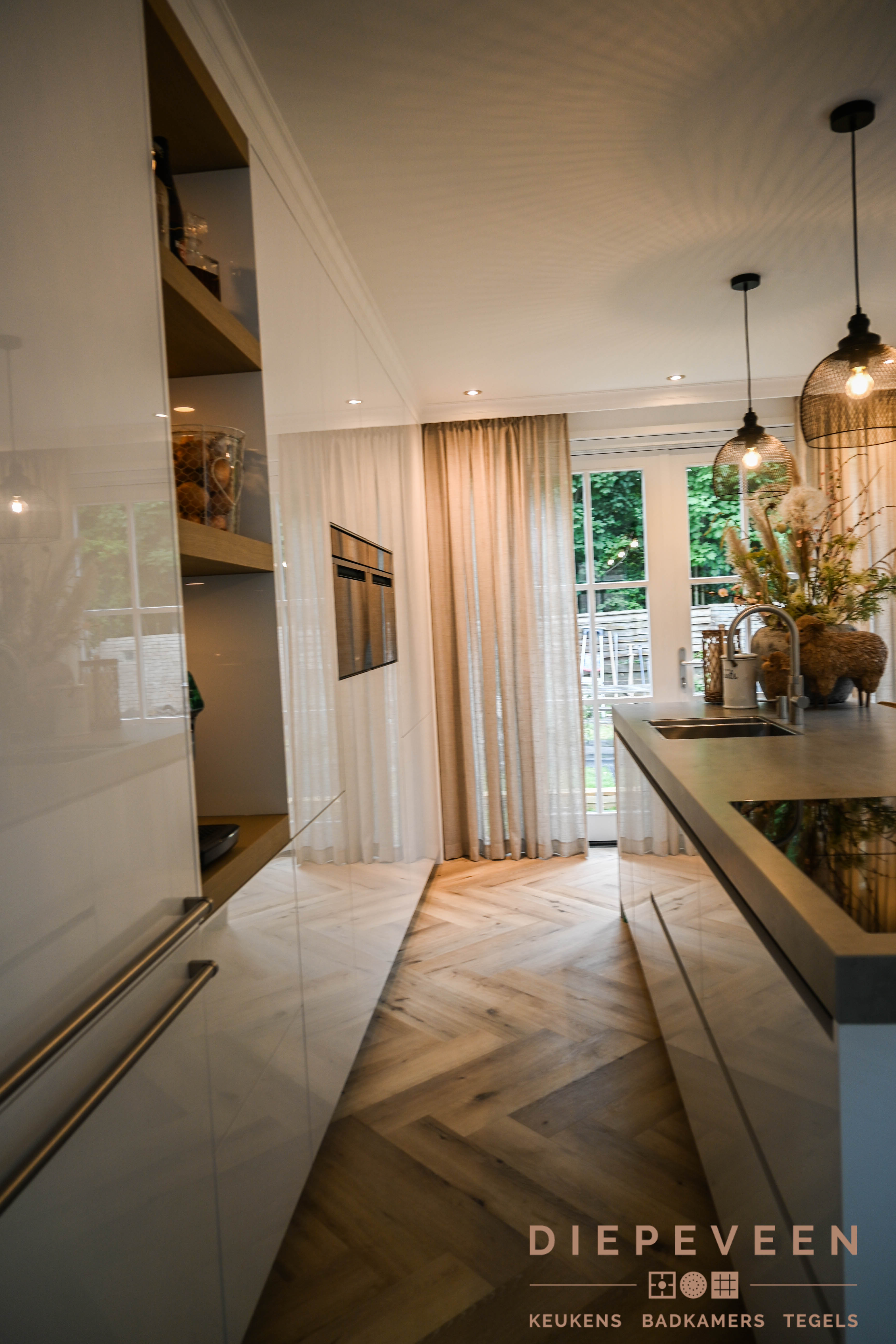 Een moderne keuken die sfeervol is ingericht. Kijk hoe mooi hoogglans wit combineerd met eiken!