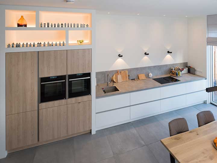 En zo verrijst er een greeploze keuken met een kastenwand tot aan het 3,20 meter hoge plafond. Het werkblad is betonlook, de bijpassende vloertegels zijn ook in betonlook. Houten en witte fronten vormen met elkaar een warm en fris geheel.