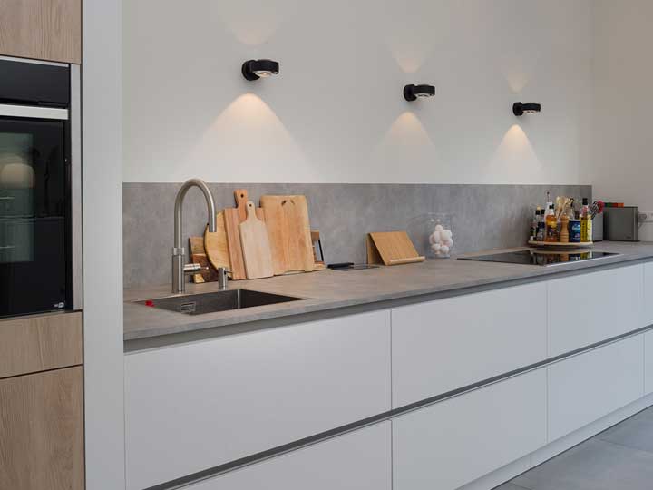 “We hebben een tint wit gekozen passend bij de keuken en het harmonieert perfect. Een speciaal accent krijgt deze keuken ook nog door de grijsgroene lambrisering en de petrolgroene muur. Dit sluit weer mooi aan op het grijs,” zegt Melinda.