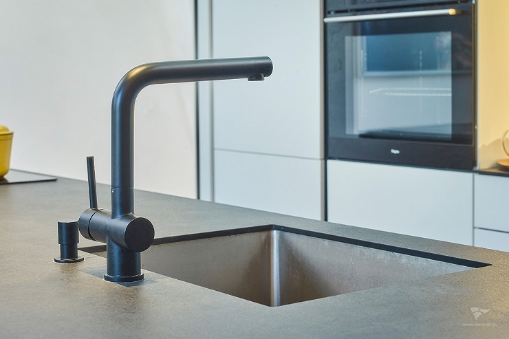 De kraan is zwart natuurlijk. In deze keuken kan het bijna niet anders. Heel modern en eigentijds en zwart harmonieert ook prachtig met roestkleuren en het werkblad. De witte keukenkasten maken het geheel fris, licht en ruimtelijk.