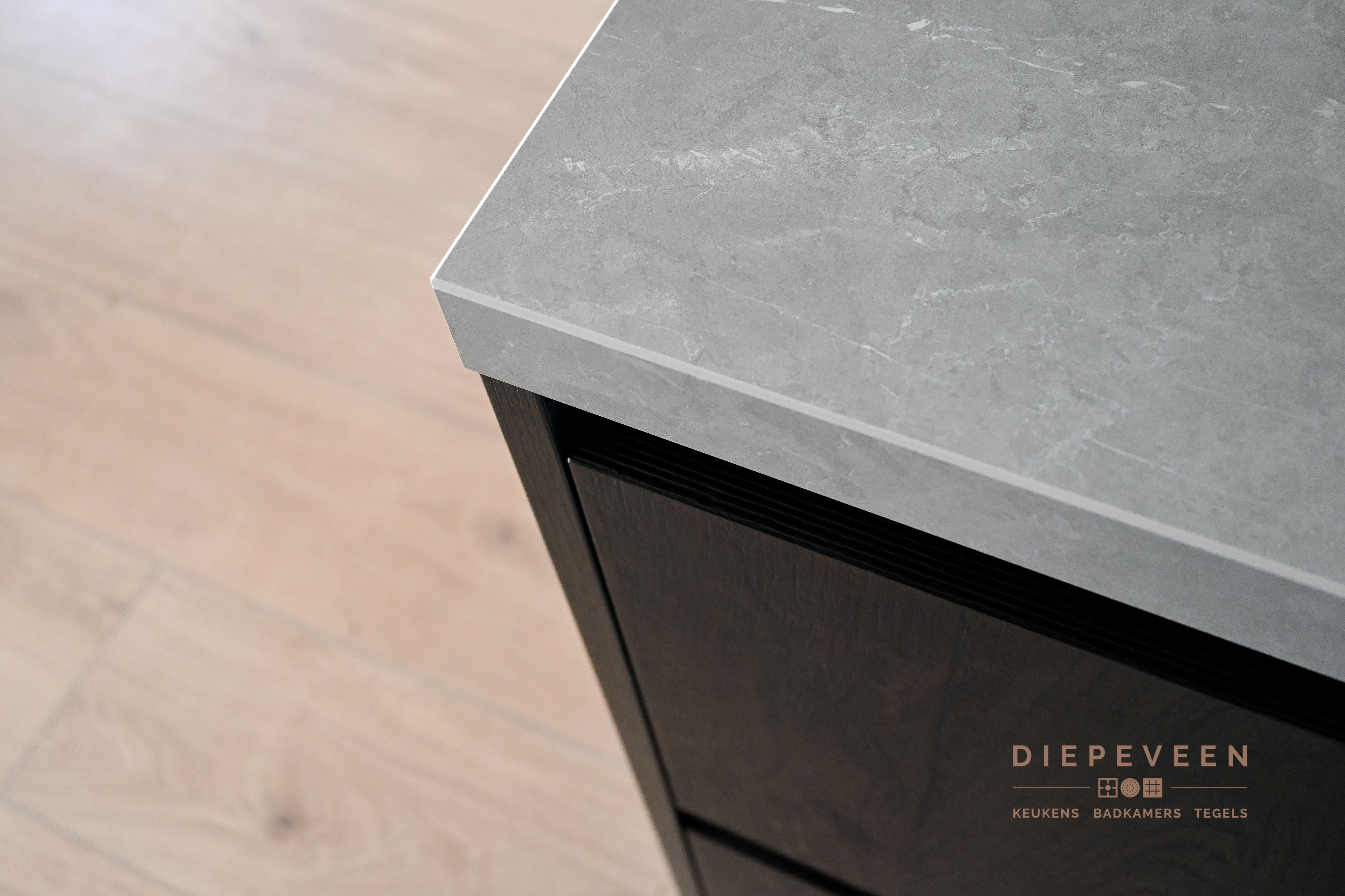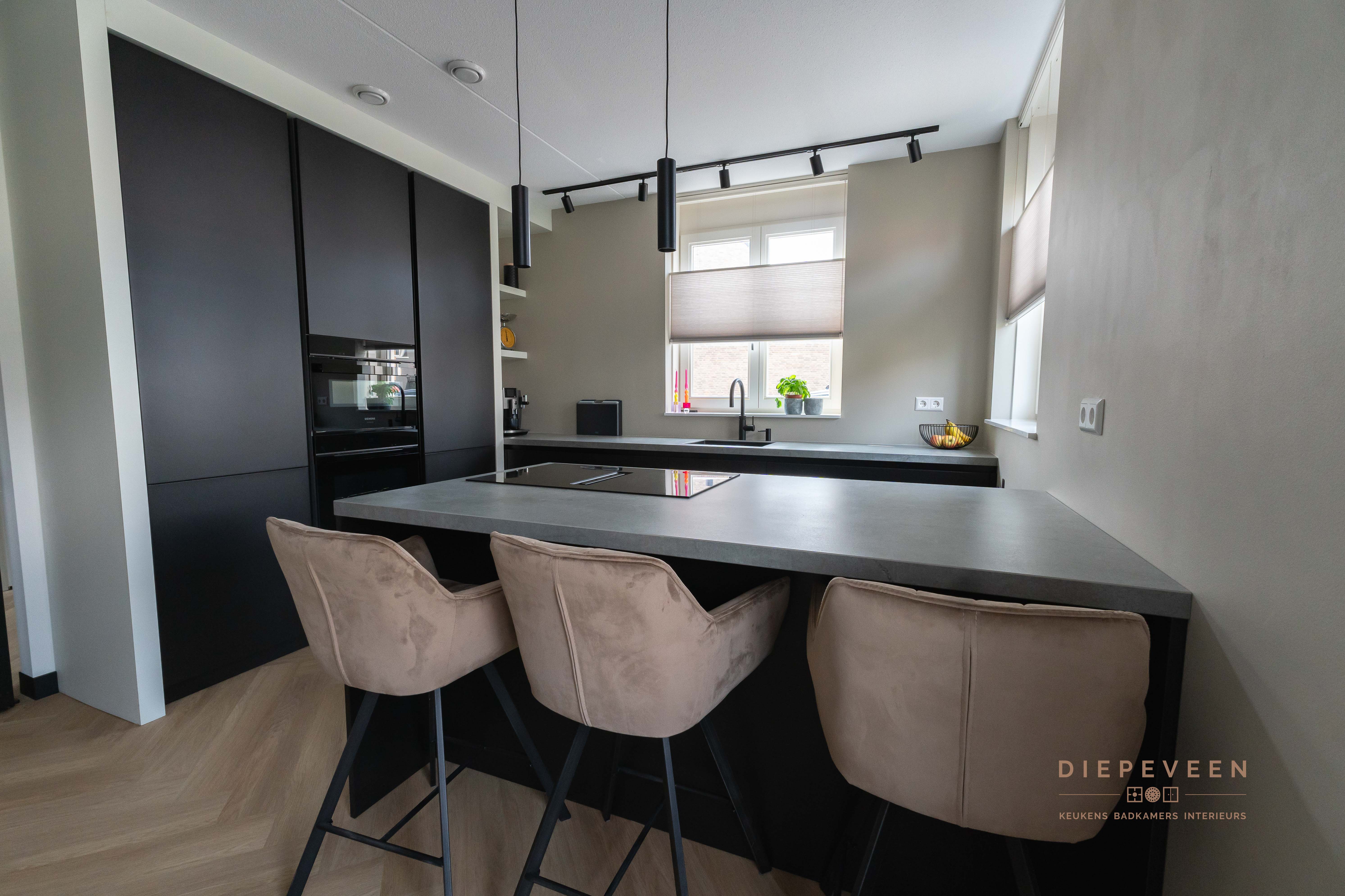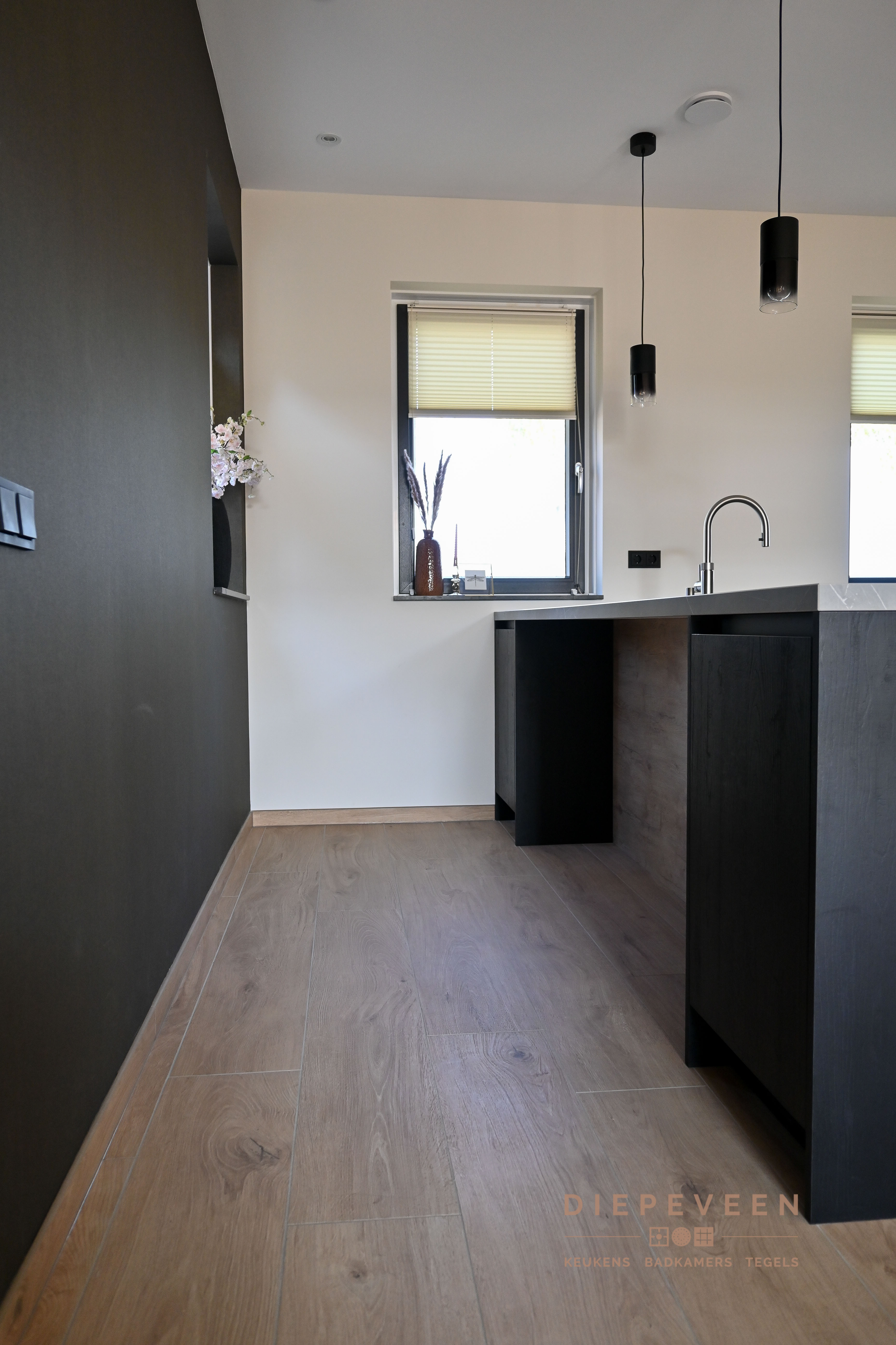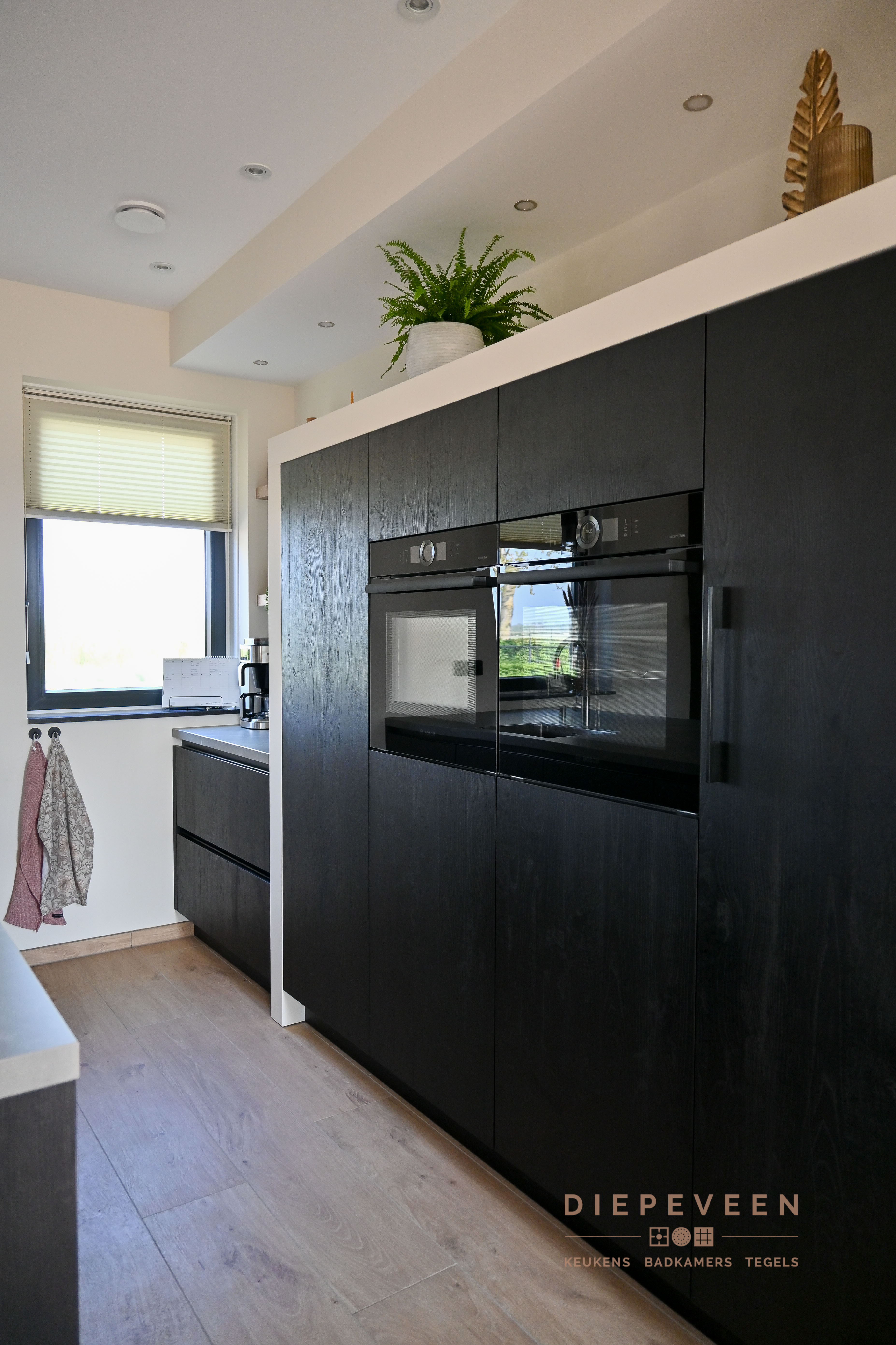 Hoe breng ik rust in mijn keuken? De vraag die bij veel mensen speelt. Genoeg opbergruimte is 1 van de belangrijke onderwerpen. Wat je in deze keuken gelijk terug ziet door de houtlook kastenwand. Ook de kleur speelt een grote rol. Zo is er bij deze keuken gekozen voor een rustiek betonlook werkblad met een verfijnd zwart houtlook front. Een prachtige match!