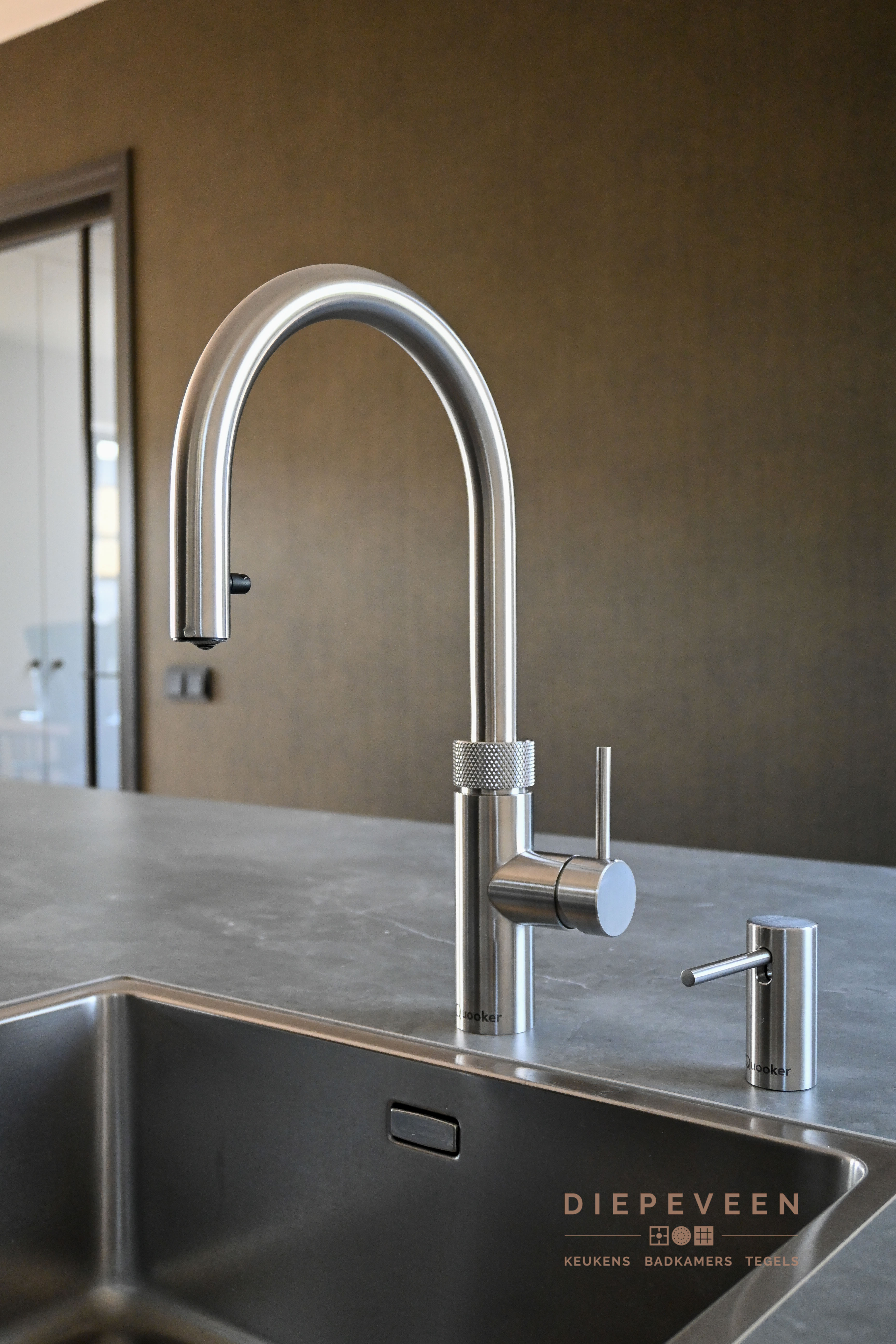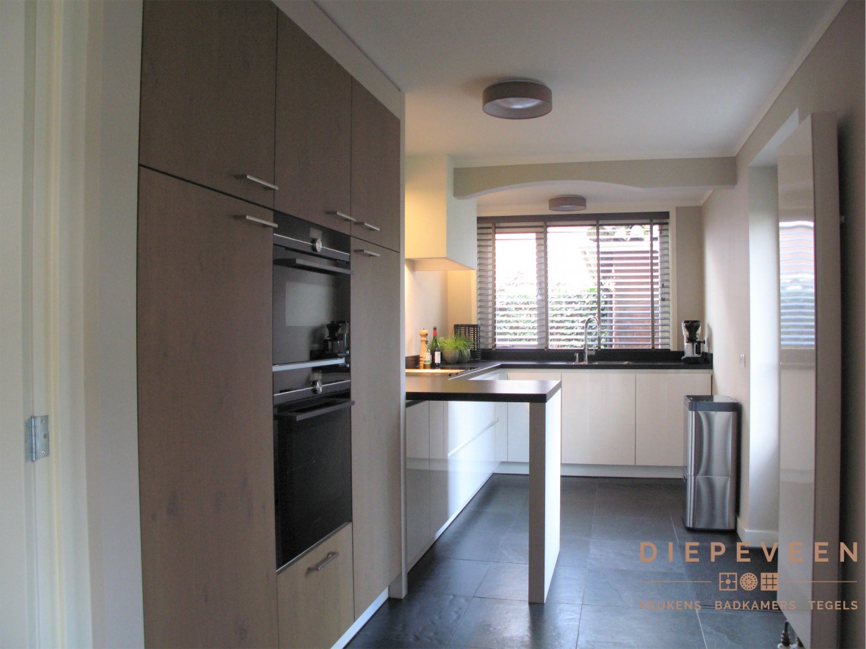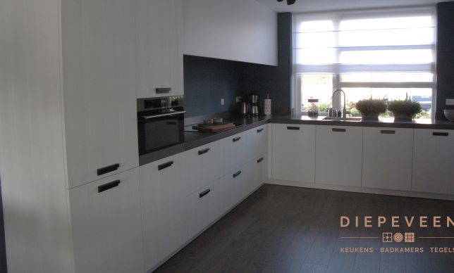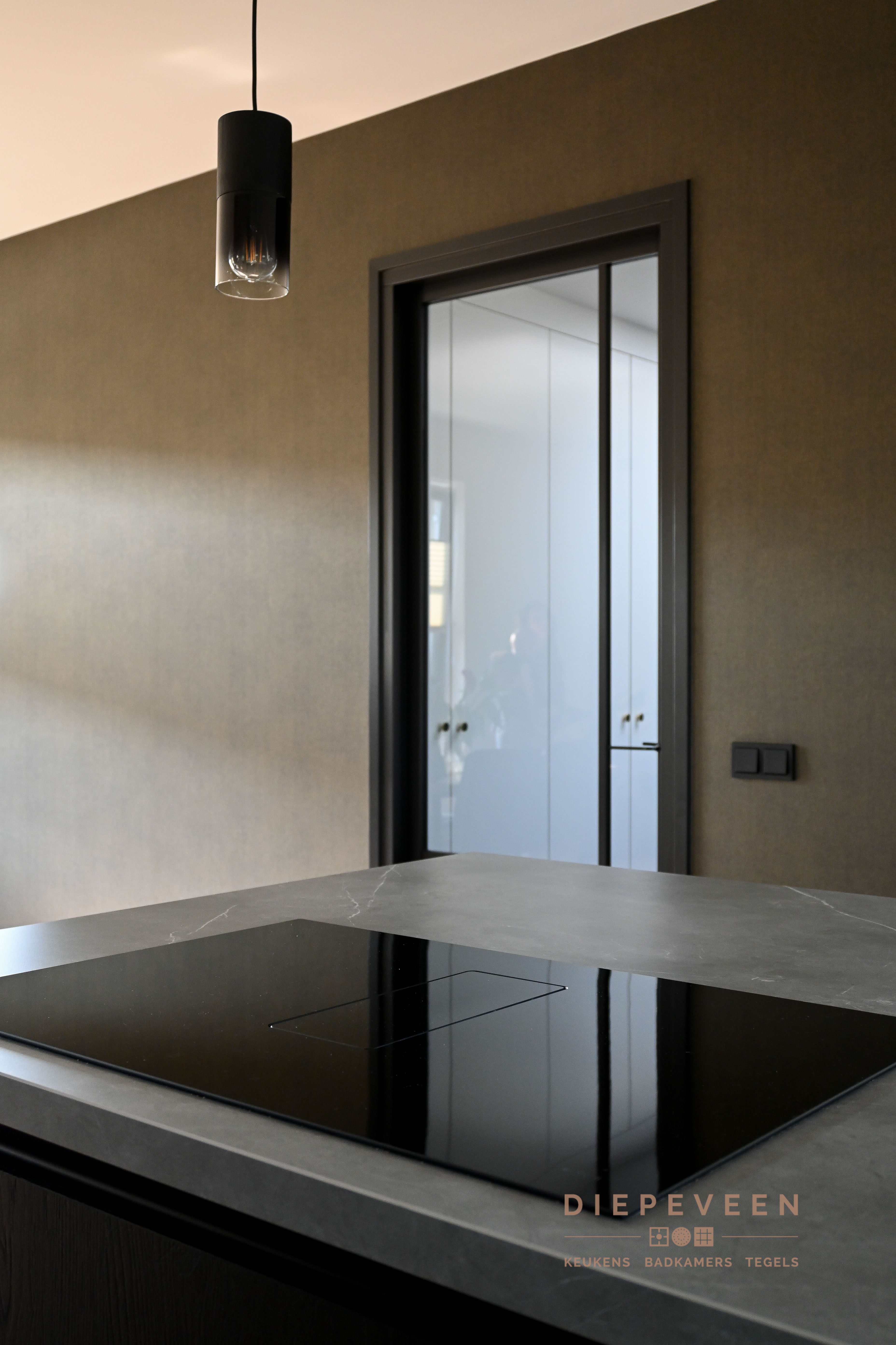 Hoe breng ik rust in mijn keuken? De vraag die bij veel mensen speelt. Genoeg opbergruimte is 1 van de belangrijke onderwerpen. Wat je in deze keuken gelijk terug ziet door de houtlook kastenwand. Ook de kleur speelt een grote rol. Zo is er bij deze keuken gekozen voor een rustiek betonlook werkblad met een verfijnd zwart houtlook front. Een prachtige match!