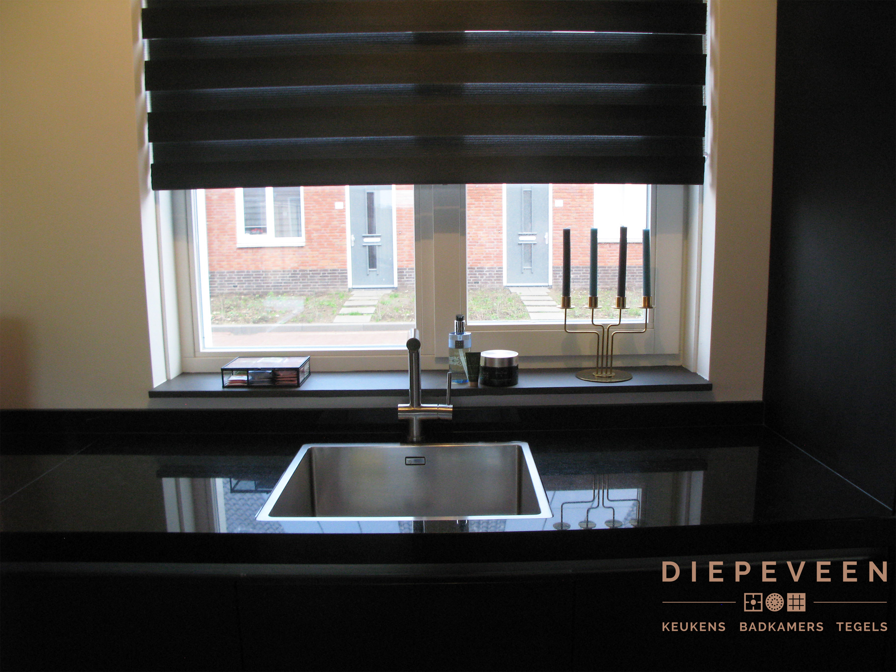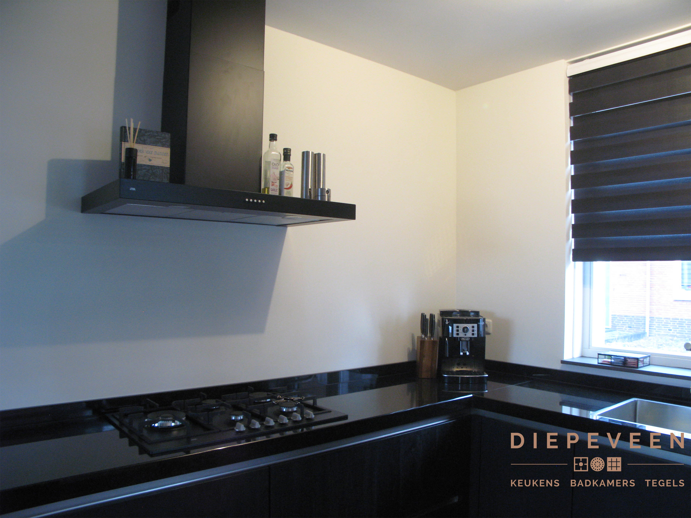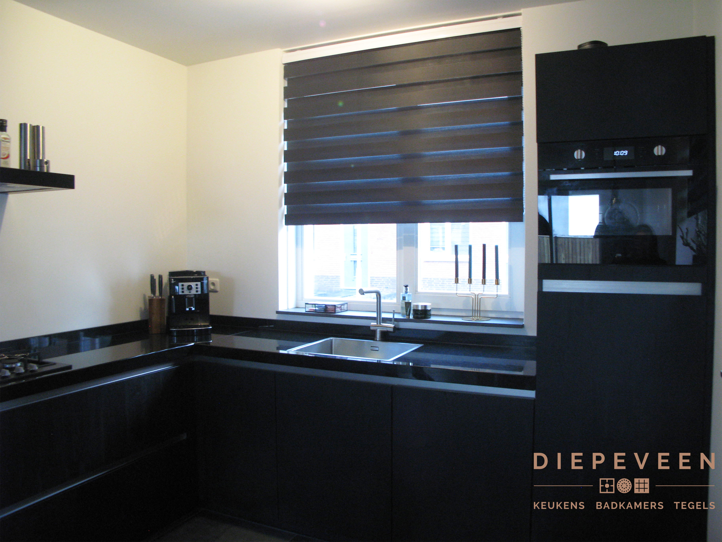 Een gezellig woonkeuken met de combinatie van wit en hout. Afgemaakt met zwarte greepjes.