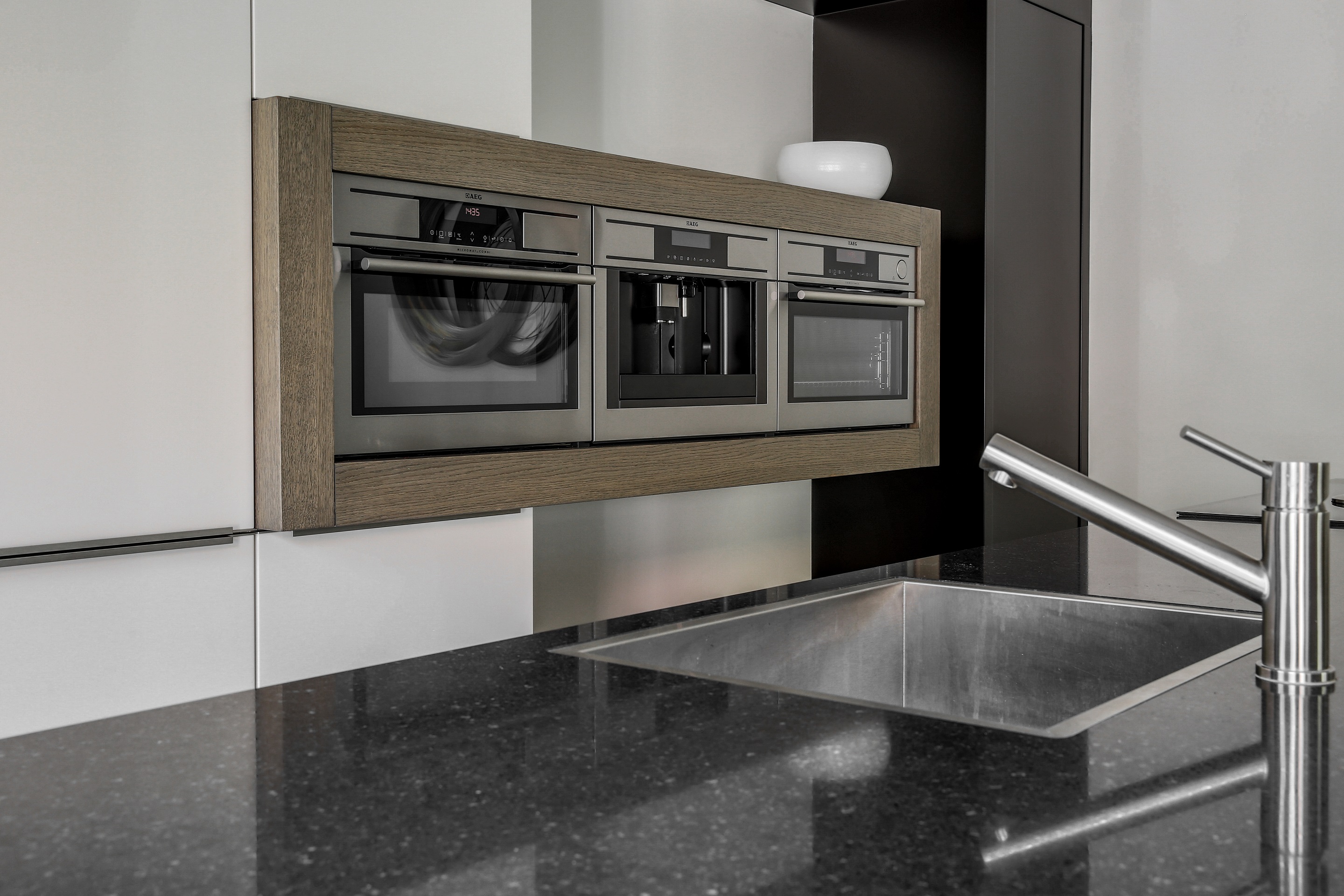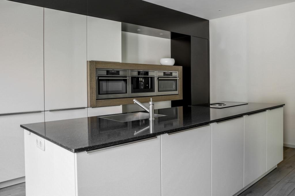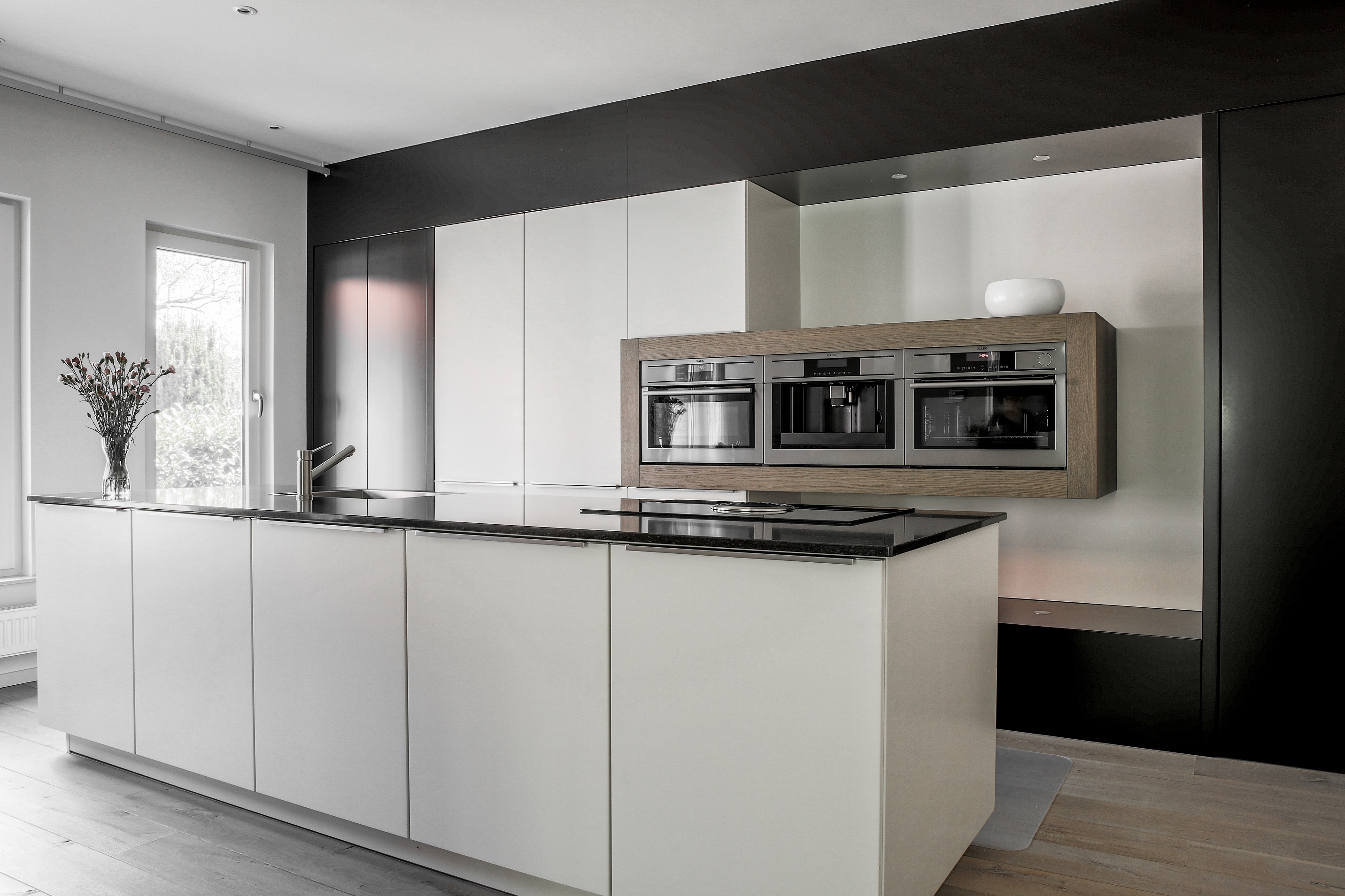 Deze mooie moderne keuken heeft een composieten werkblad van slechts 2cm dik. Dit past binnen het minimalistische karakter van de moderne keuken, net zoals de Bora kookplaat, die een opzichtige afzuigkap overbodig maakt. De zwarte kastenwandombouw met muurkasten en het blad vormen een mooi contrast met de witte, semi-greeploze, fronten. Moderne keukens worden namelijk vaak geassocieerd met greeploze fronten, maar niet iedereen vindt dat praktisch; een greepje is vaak fijner hanteerbaar en ook op schoonmaaktechnisch vlak verkiest men een greep vaak boven een greeploos front.