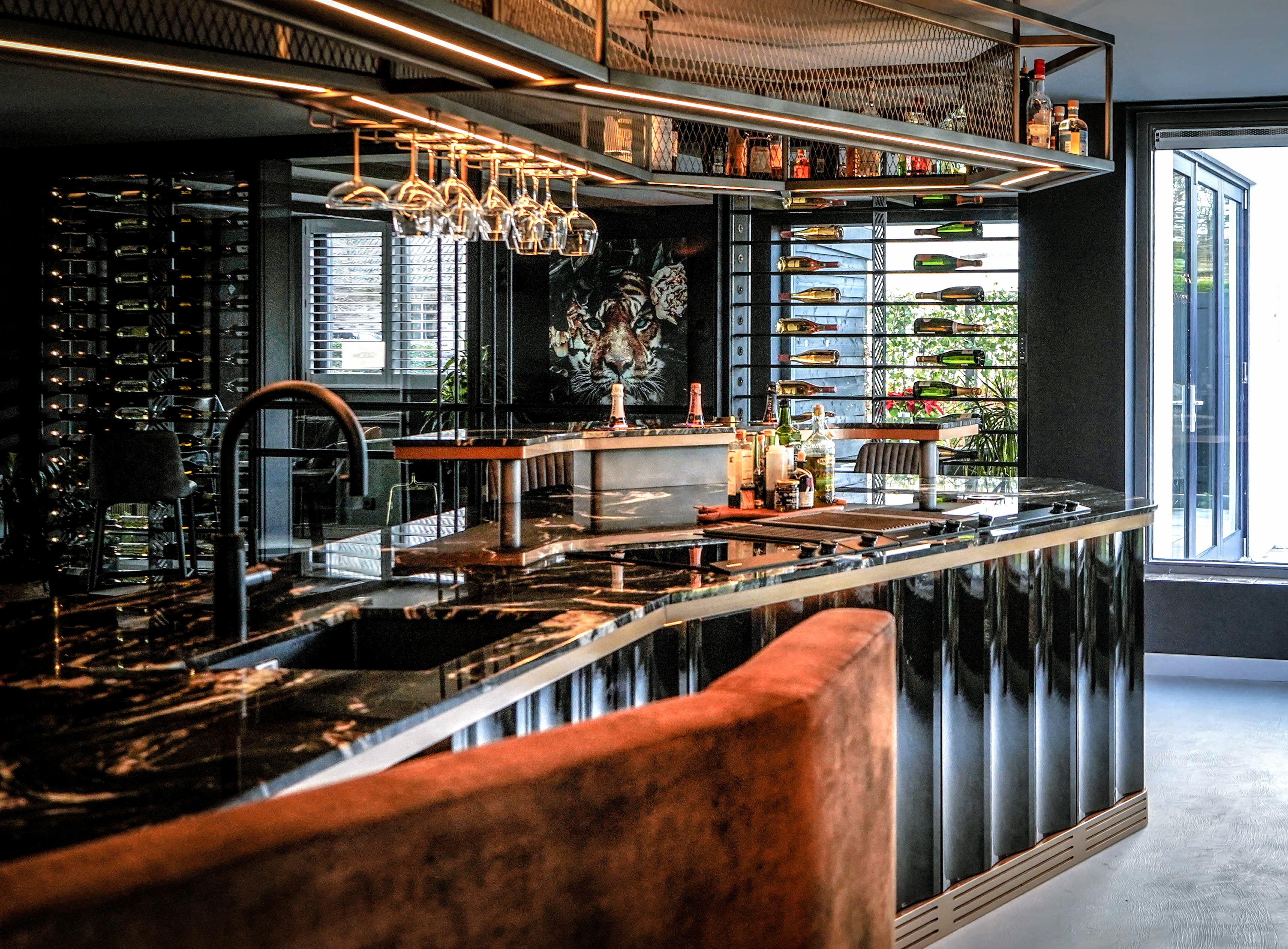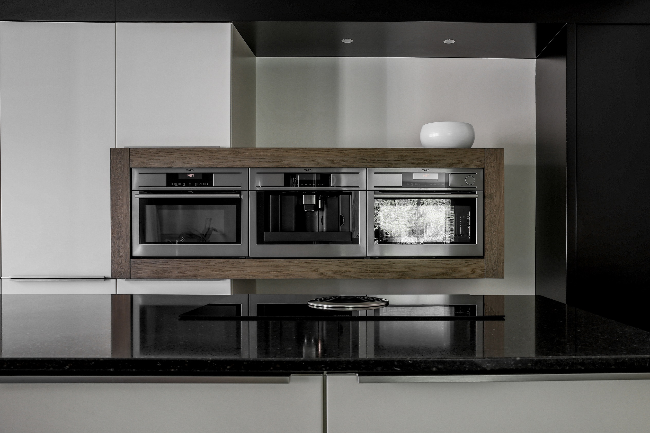 De met hout omlijste apparaten, die op een speelse manier in de kastenwand zijn verwerkt, doorbreken het contrast van de zwarte kastenwandombouw en het zwarte blad met de witte fronten. Een blikvanger, voor iedereen die uw keuken binnenstapt.