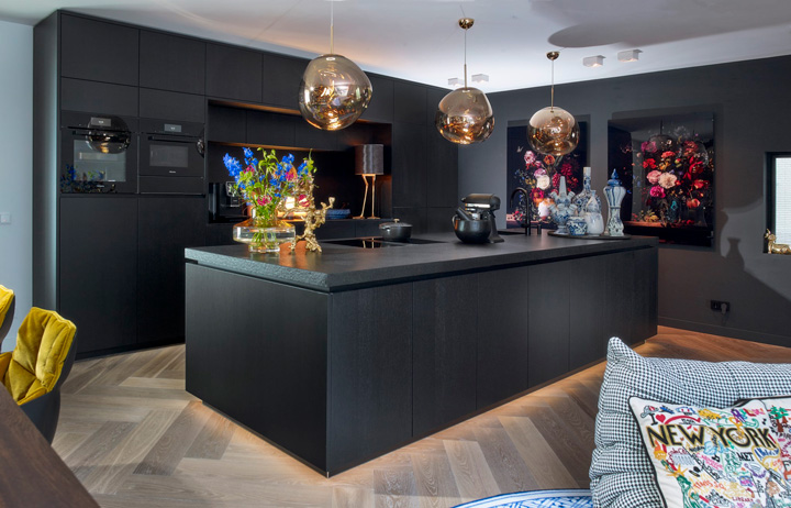 Het was al snel duidelijk dat de keuken helemaal zwart zou worden. De basis moest rustig worden en met accessoires, bloemen en lampen zou contrast gecreëerd worden in de keuken. Hoewel de keuken volledig zwart en greeploos is, hebben de fronten wel een houtnerf.