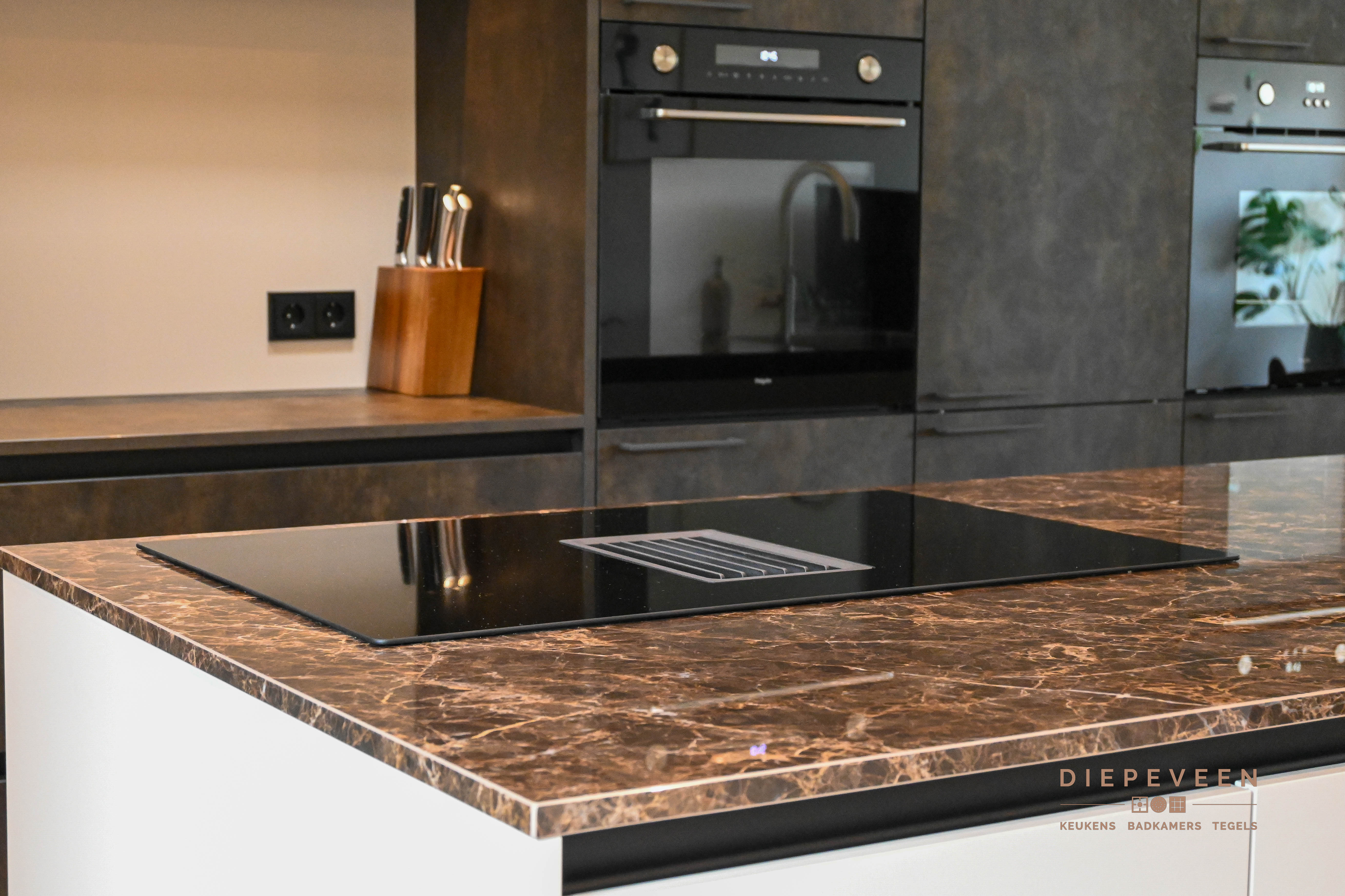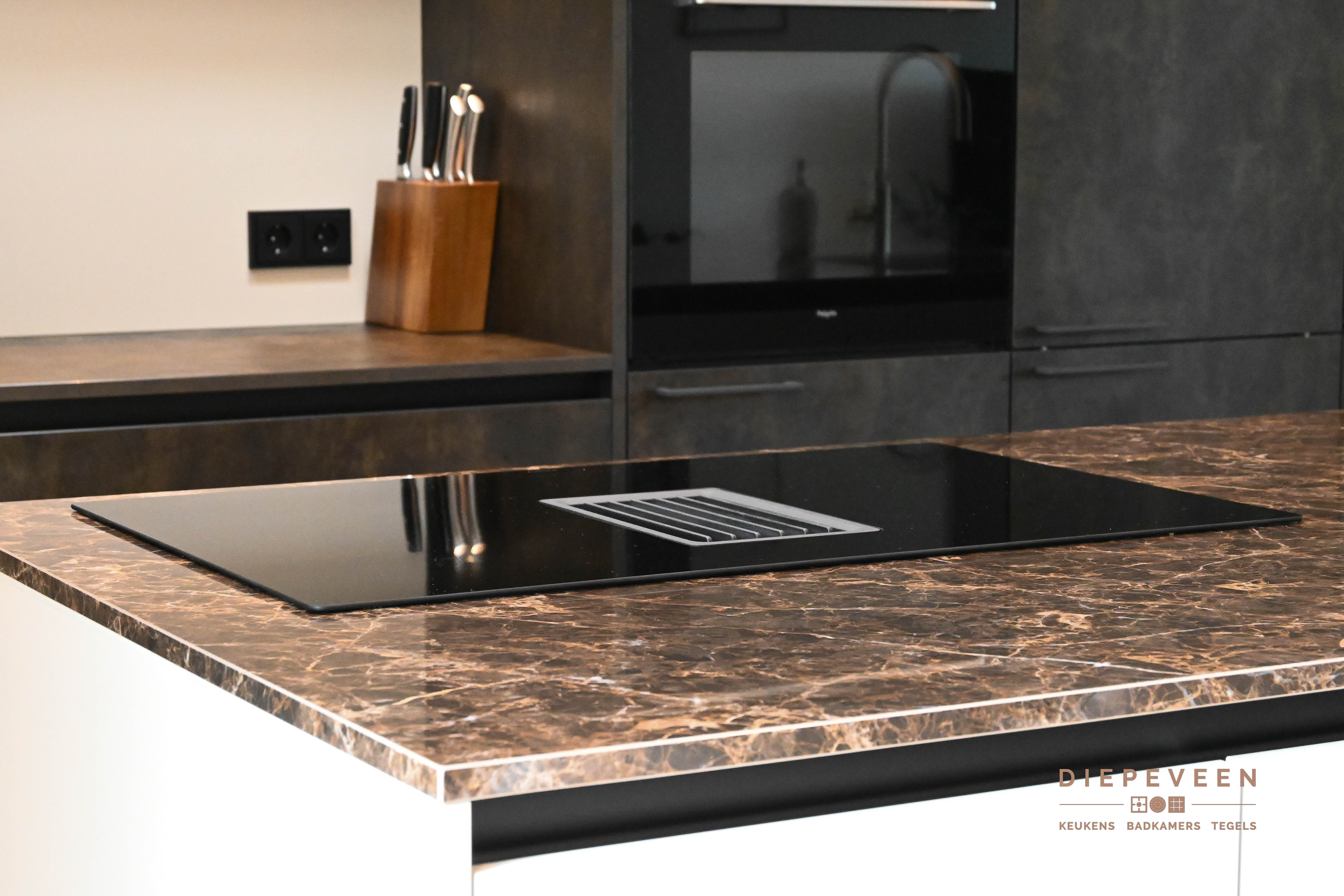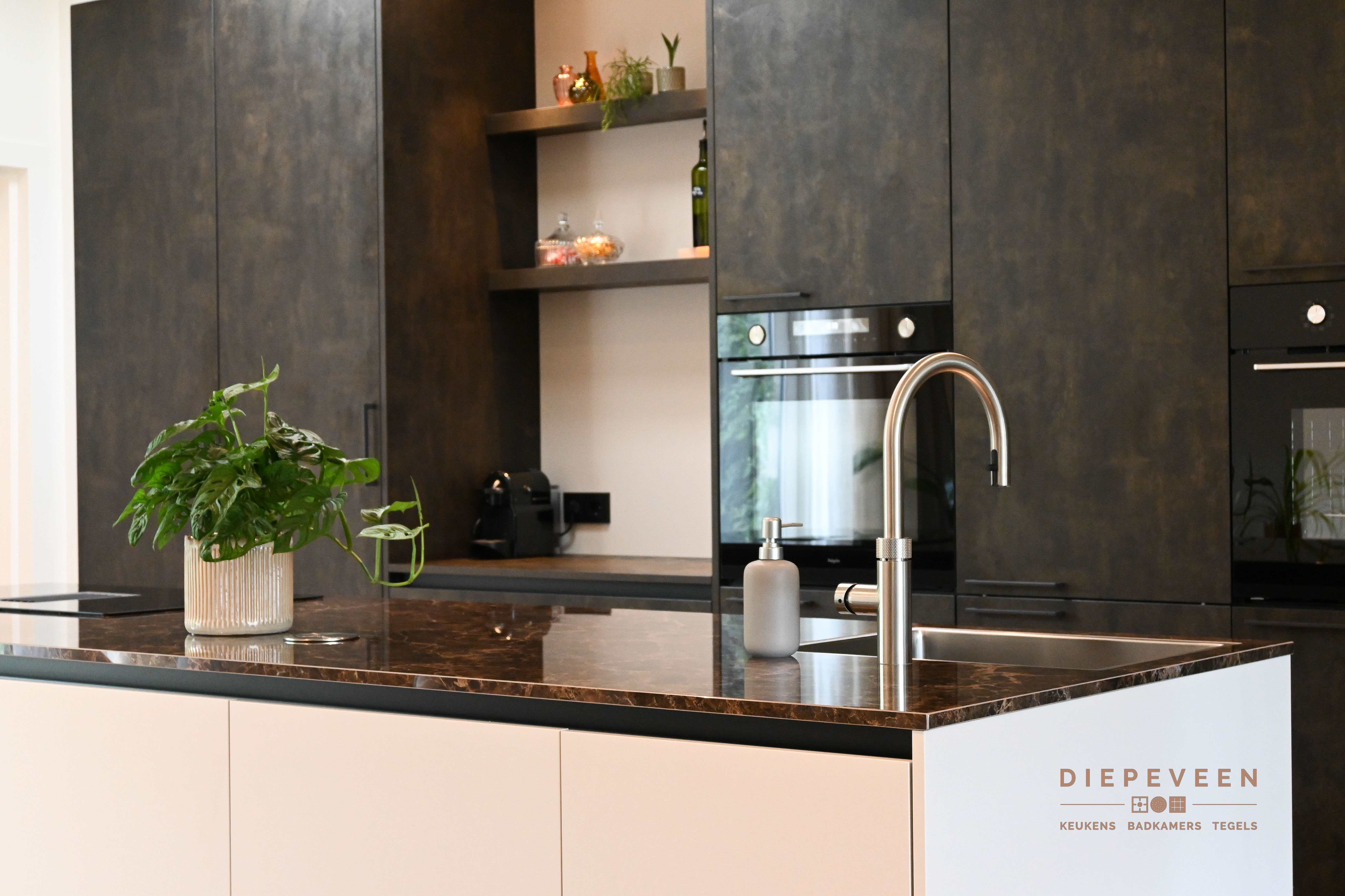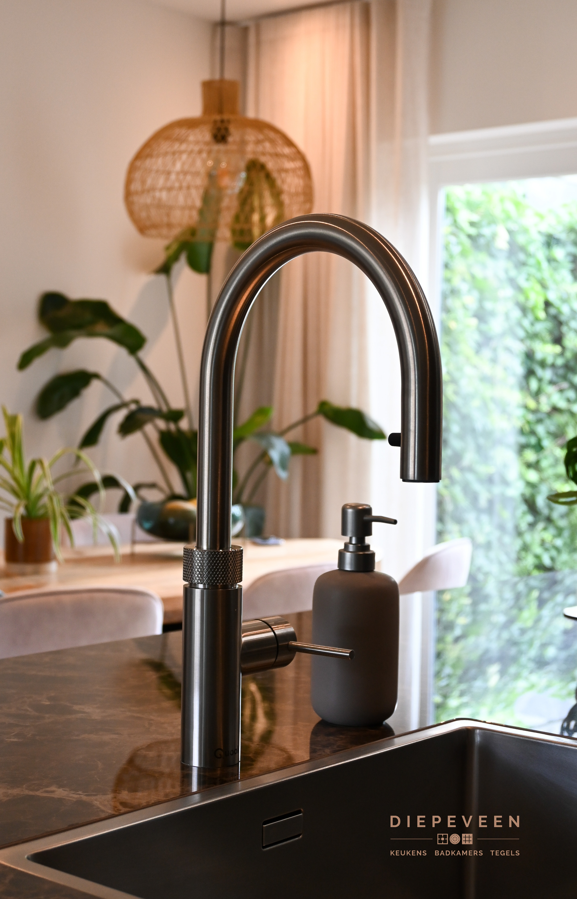 De eyecatcher van deze keuken zijn de lederlook fronten en het prachtige werkblad “Alliste gepolijst”. Deze kleuren matchen perfect en creëren een mooie levendige uitstraling. In de kastenwand creëerde we een nis, ideaal voor je koffieapparaat of andere keukenapparatuur. Een waterkoker is in deze keuken niet nodig want de “Quooker kraan” zorgt in een mum van tijd voor kokend water. Is de wasbak vies? Doordat deze “Quooker kraan” ook is voorzien van een uittrekbare perlator maak je de wasbak extra makkelijk schoon. Koken is een feestje met het moderne keuken apparatuur en van nare geurtjes heb je geen last door de ingebouwde afzuiging in de kookplaat. Eetsmakelijk!