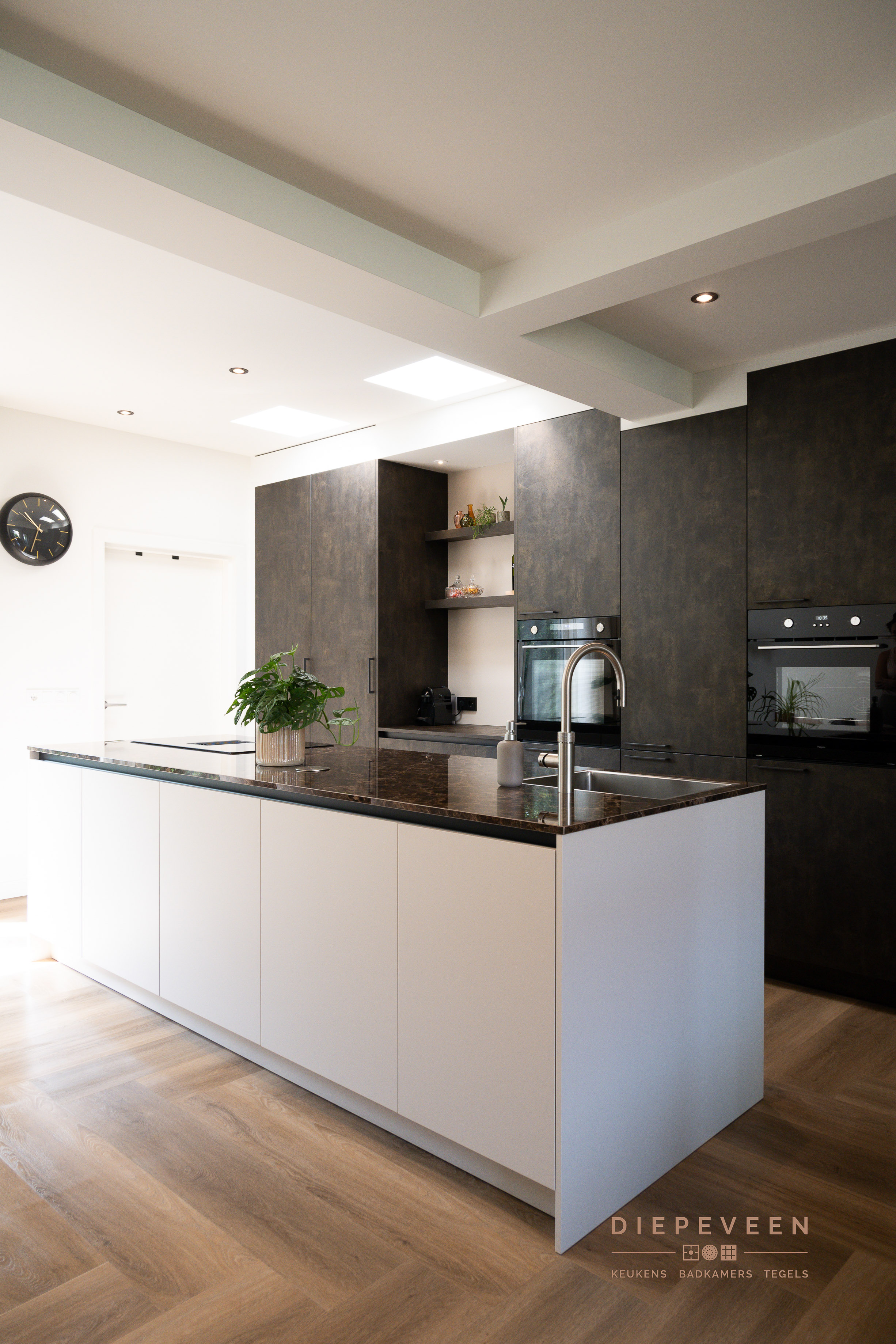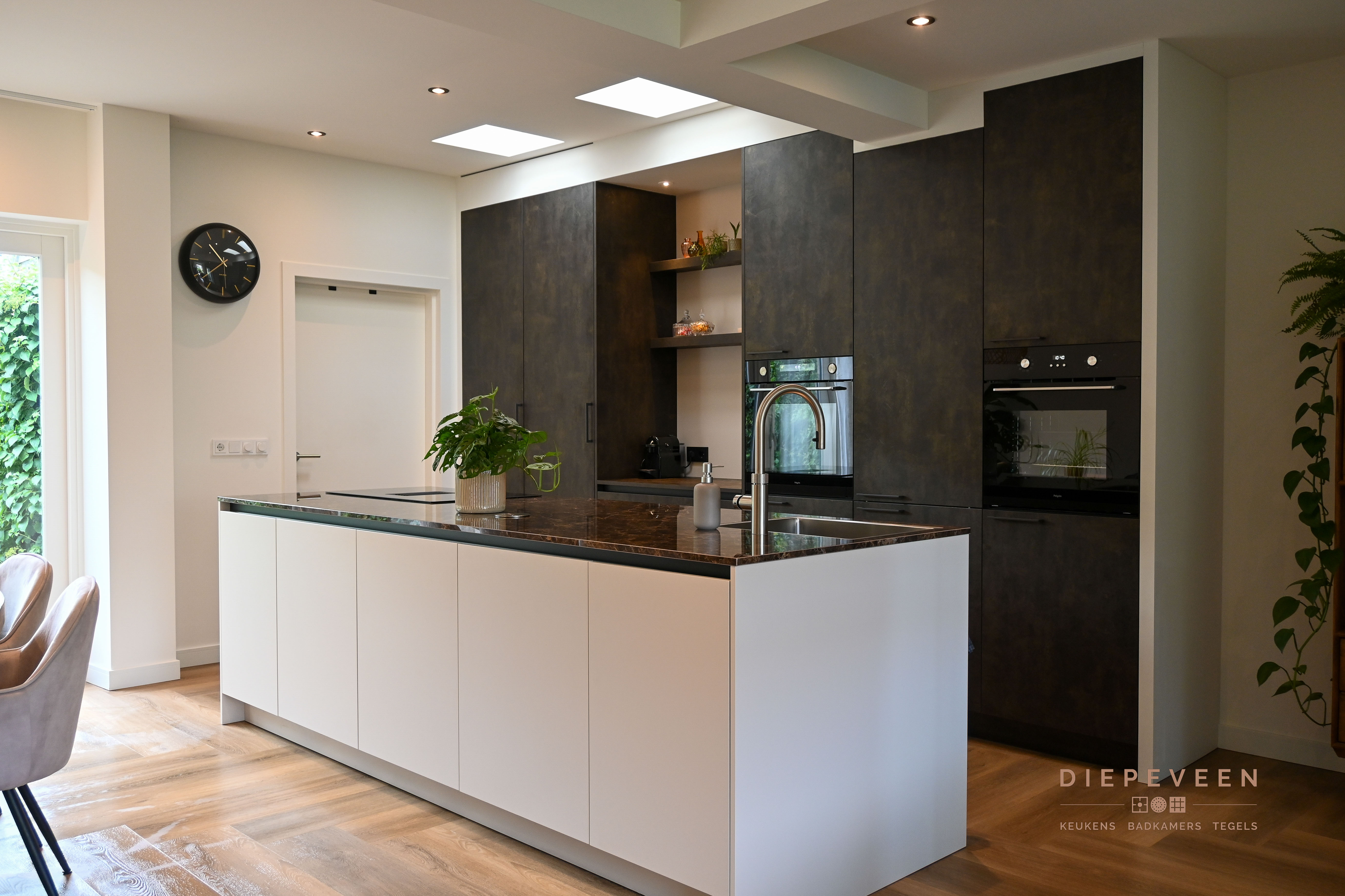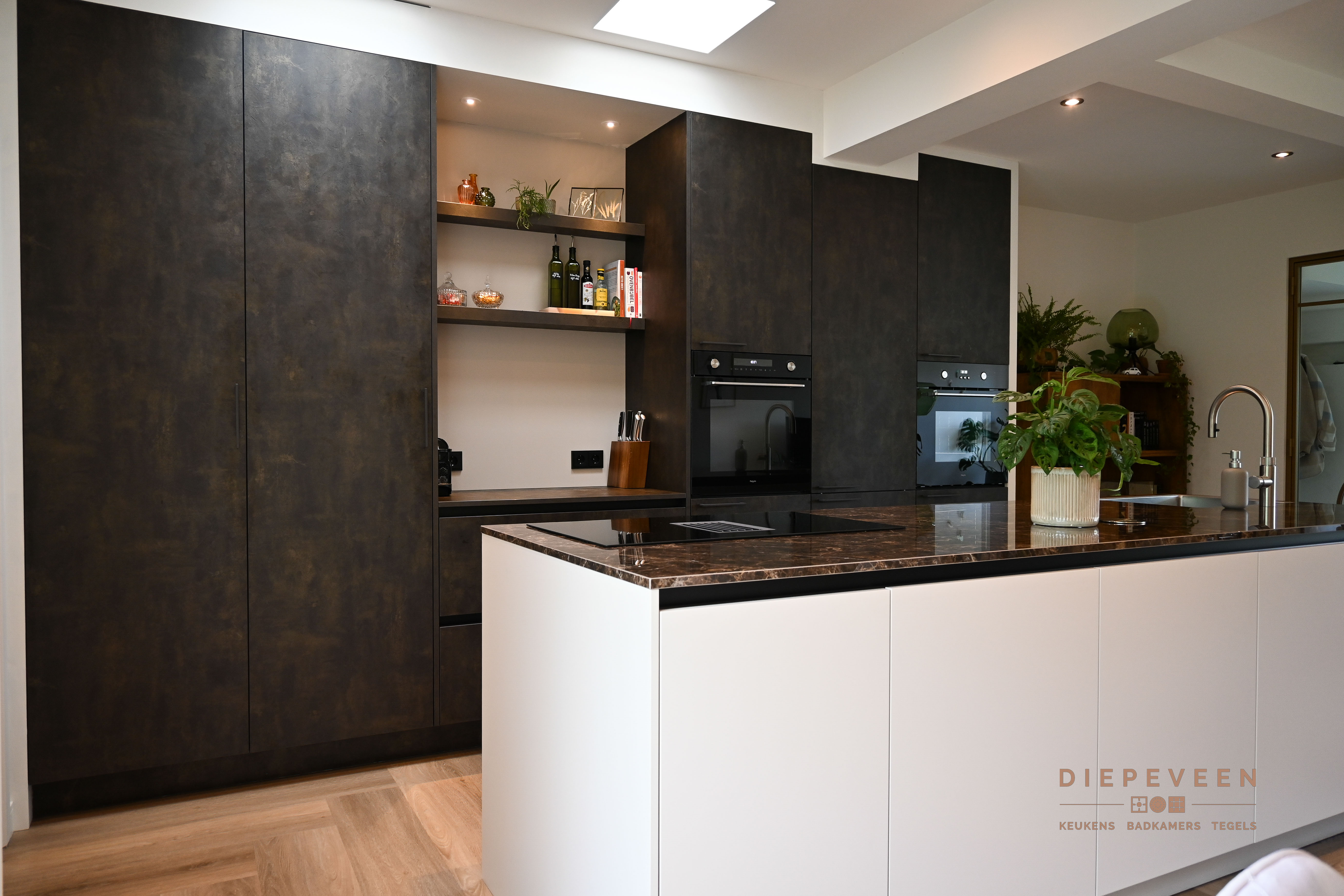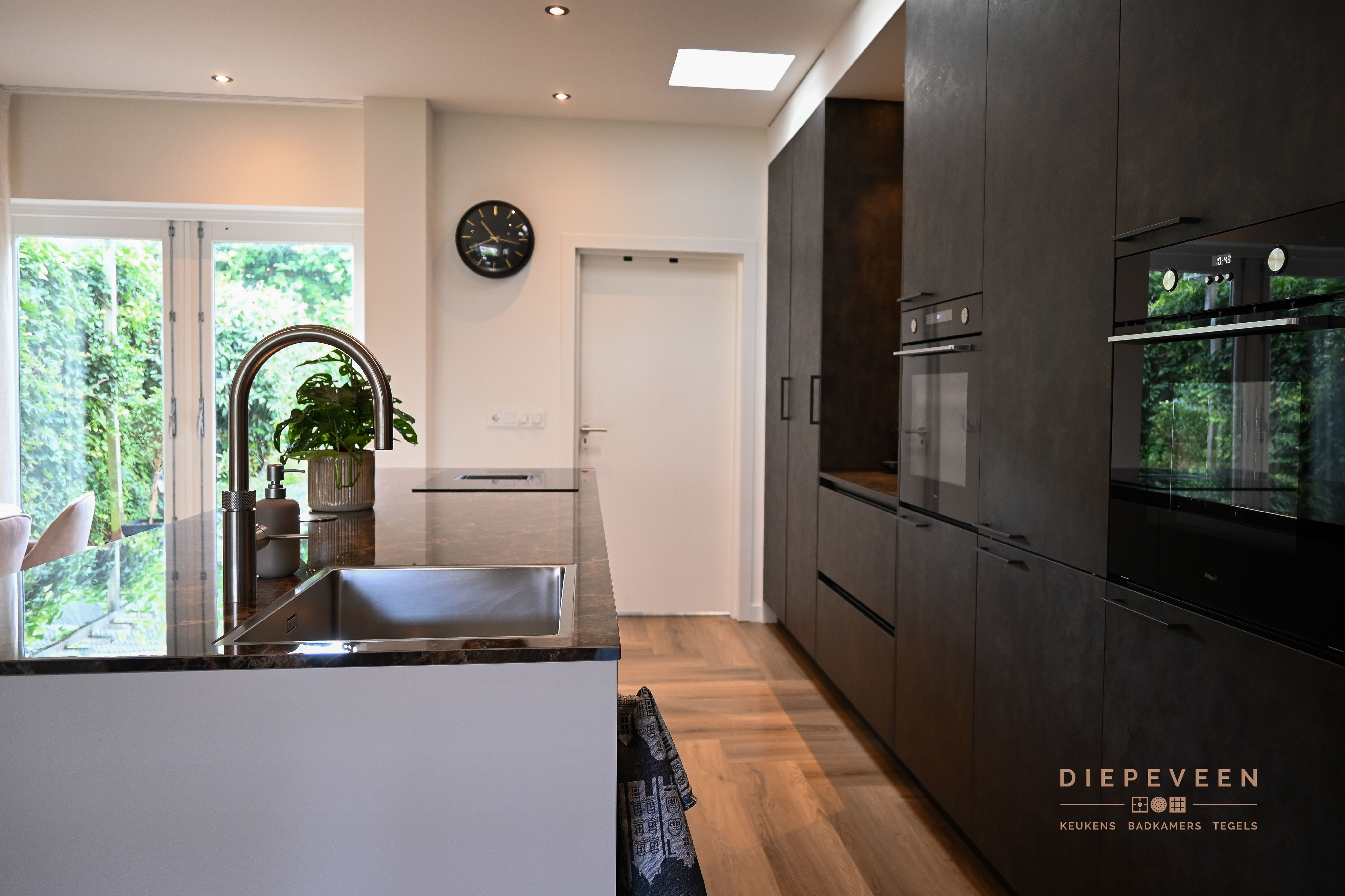 De eyecatcher van deze keuken zijn de lederlook fronten en het prachtige werkblad “Alliste gepolijst”. Deze kleuren matchen perfect en creëren een mooie levendige uitstraling. In de kastenwand creëerde we een nis, ideaal voor je koffieapparaat of andere keukenapparatuur. Een waterkoker is in deze keuken niet nodig want de “Quooker kraan” zorgt in een mum van tijd voor kokend water. Is de wasbak vies? Doordat deze “Quooker kraan” ook is voorzien van een uittrekbare perlator maak je de wasbak extra makkelijk schoon. Koken is een feestje met het moderne keuken apparatuur en van nare geurtjes heb je geen last door de ingebouwde afzuiging in de kookplaat. Eetsmakelijk!