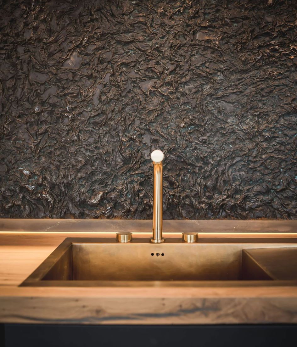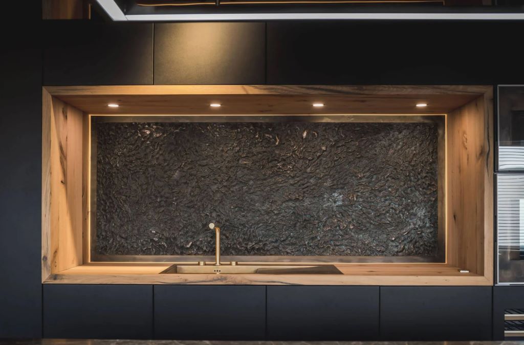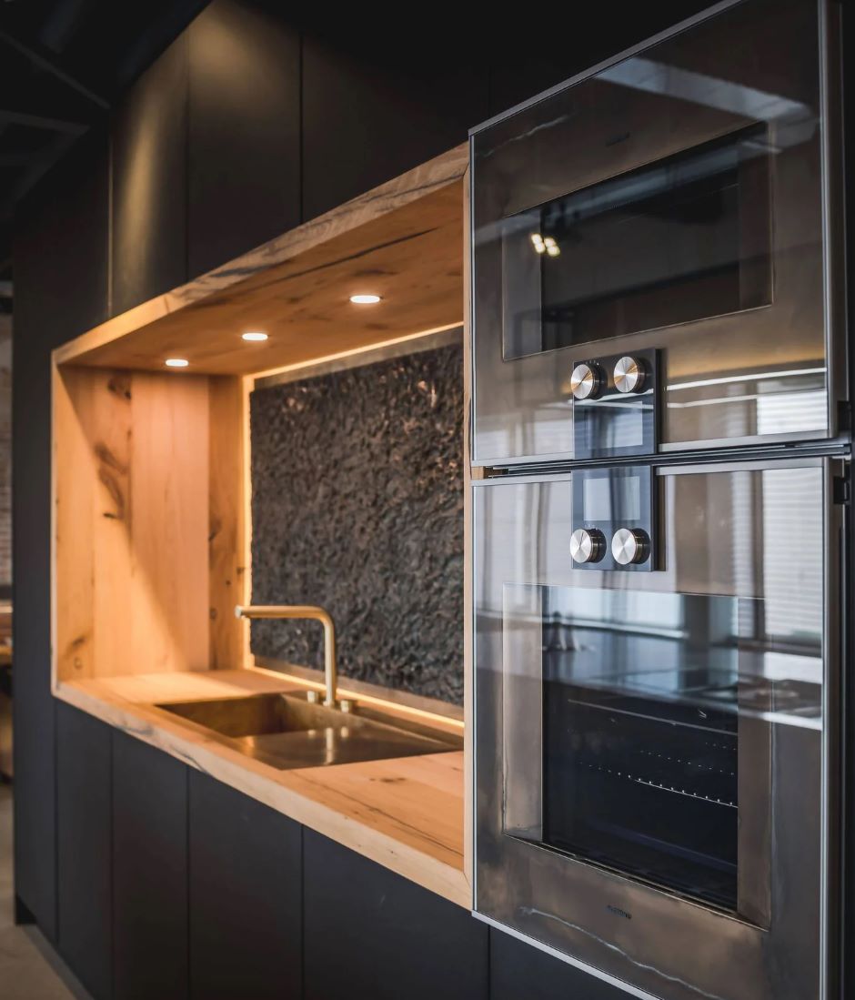Oud iepenhout, robuust keramiek en zwarte accenten samengebracht in een keuken op maat