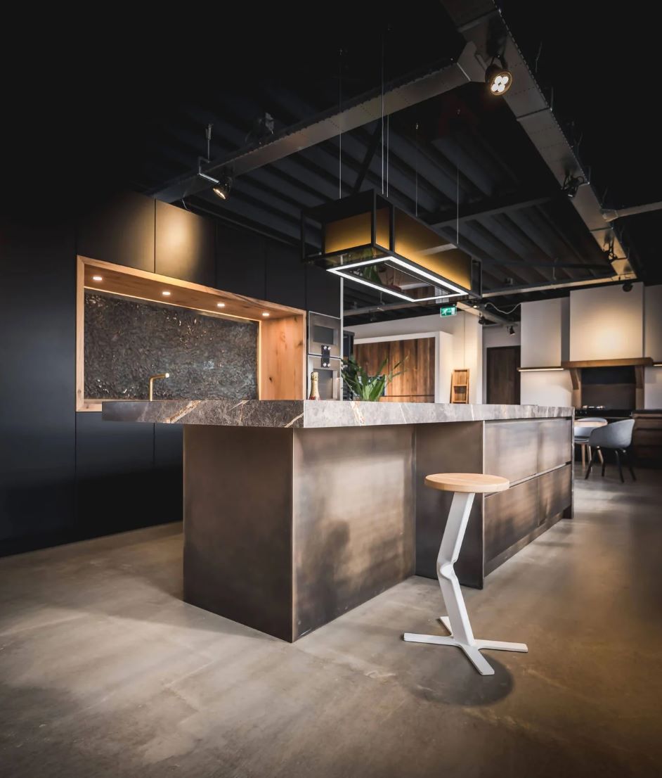 Sfeervolle landelijke keuken met industrieel tintje door blauwstaal en eikenhout.