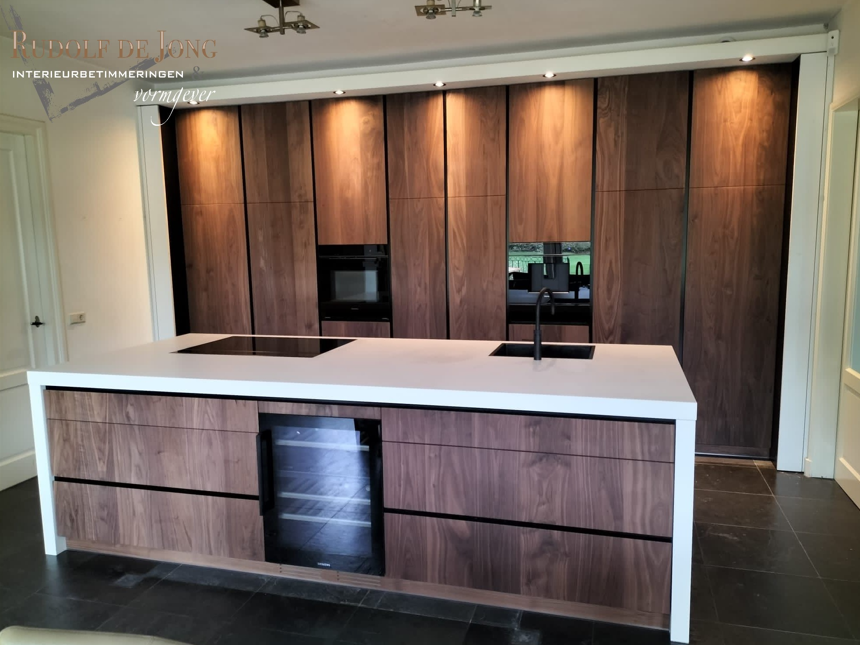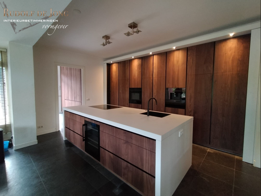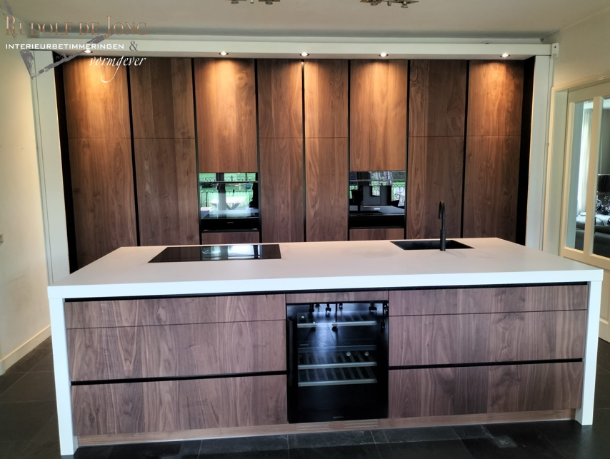 Moderne, notenhouten keuken met kastenwand en kookeiland met in de bijkeuken een bijpassende kastenwand. Ontworpen en gerealiseerd.