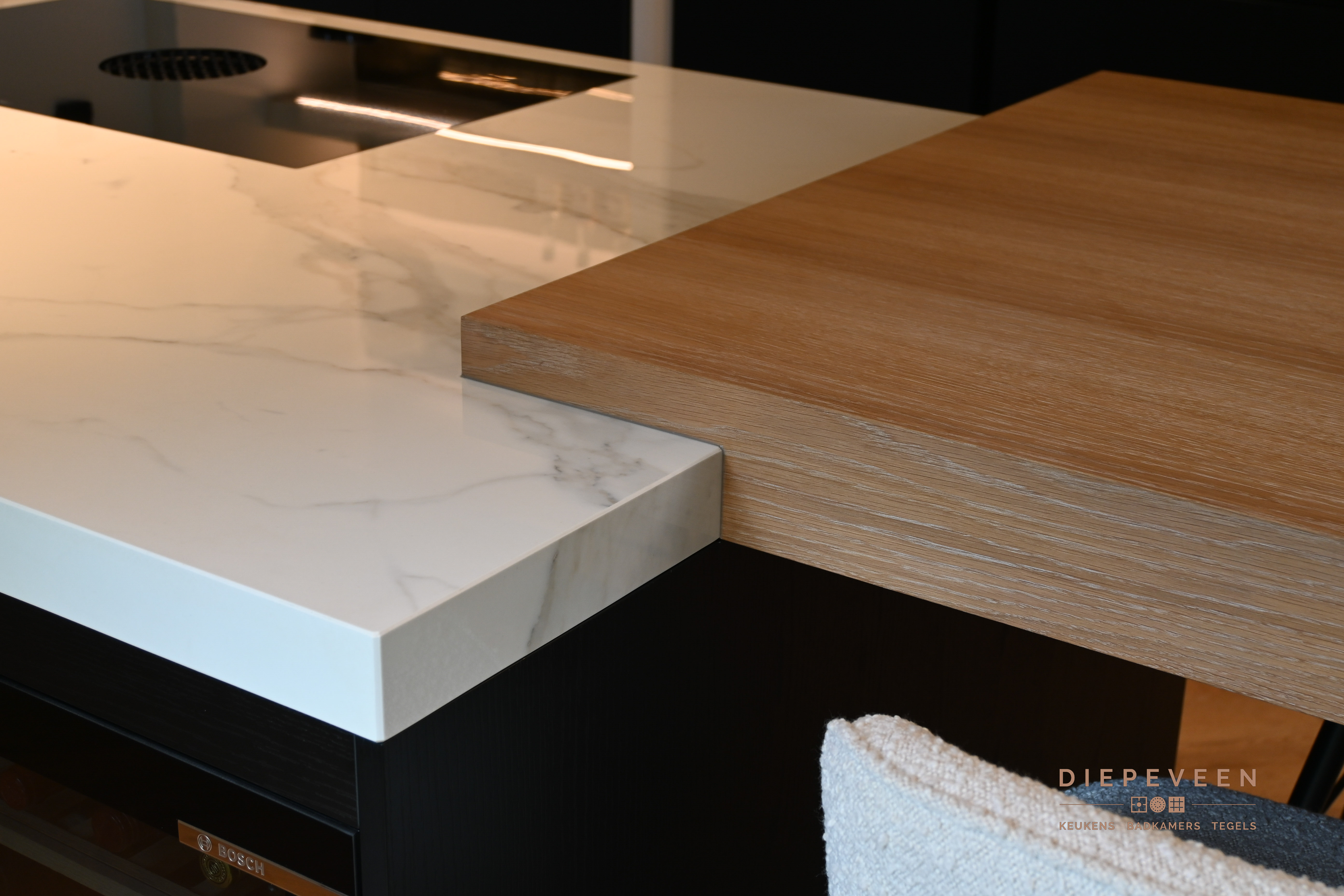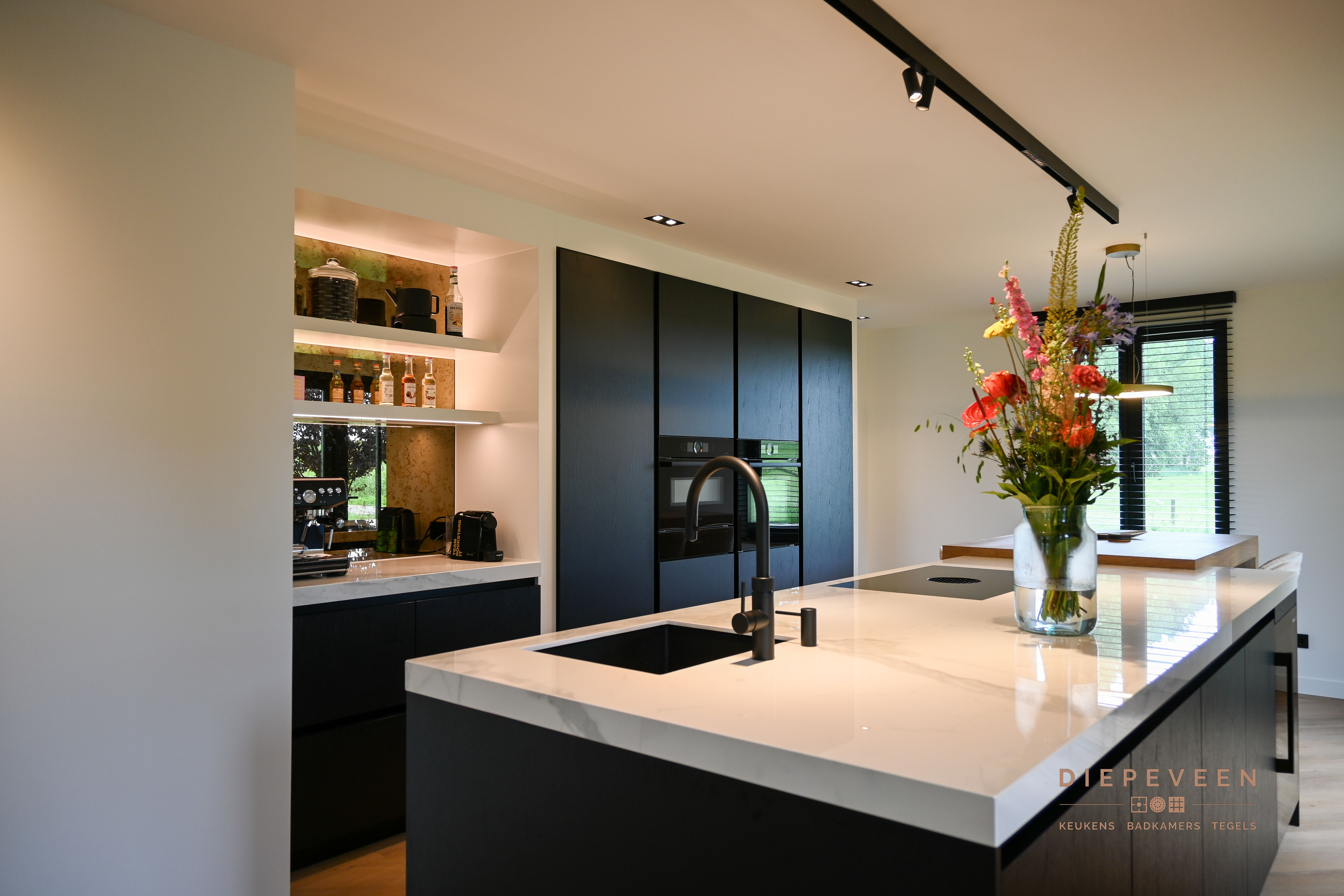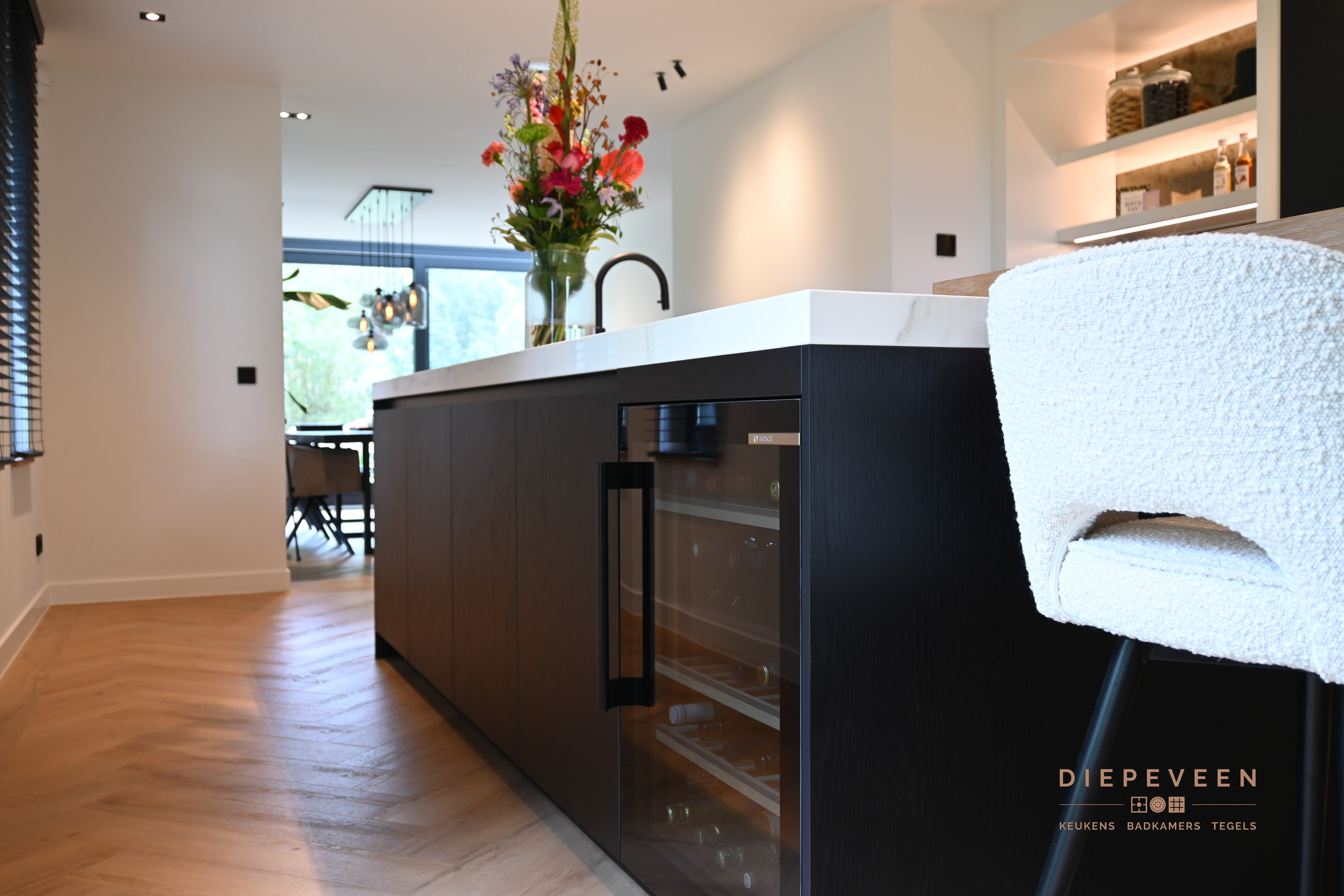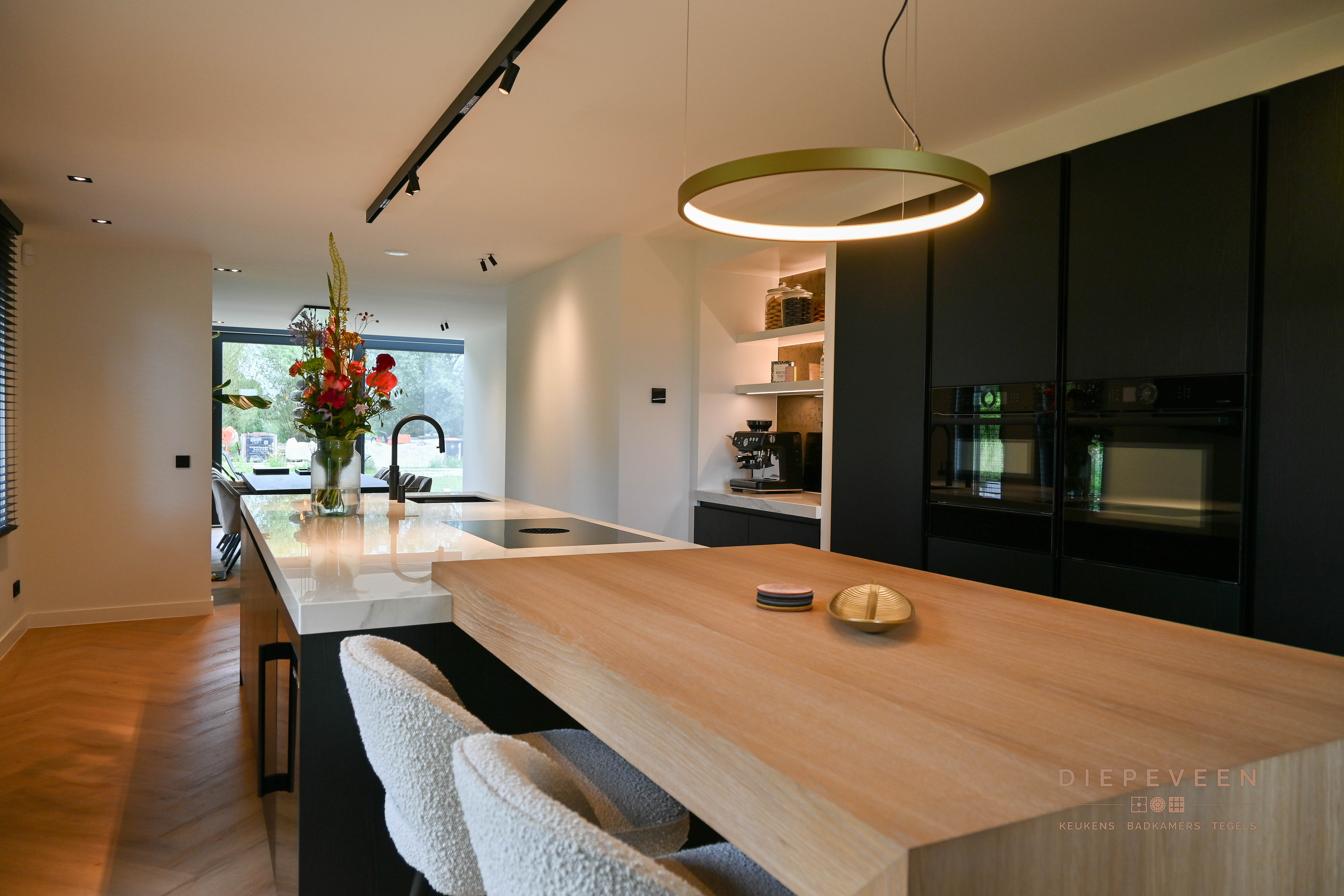 Geniet van de perfecte styling, details, moderne apparatuur en praktische indeling in deze schitterende keuken. De keuken wordt gekenmerkt door de unieke nis. Deze is voorzien van prachtige details, zoals het werkblad tegen de achterwand en de ledverlichting. Hierbij werd er gekozen voor zwarte fronten in combinatie met witte stollen en een licht werkblad. Zo oogt de keuken absoluut niet donker en vormt zich een karakteristiek geheel. Het eiland is voorzien van een houten zitelement met daarnaast een wijnklimaatkast. Oftewel, een lekker wijntje staat altijd binnen handbereik.