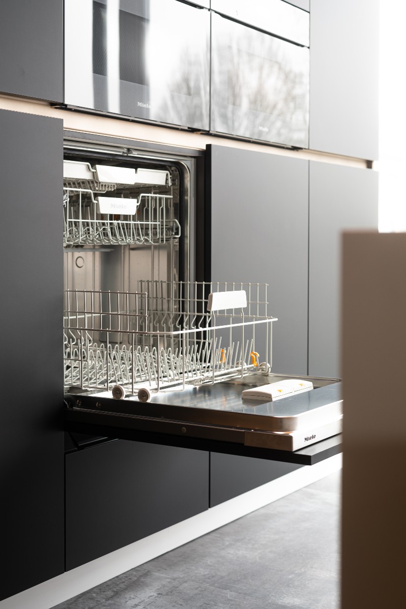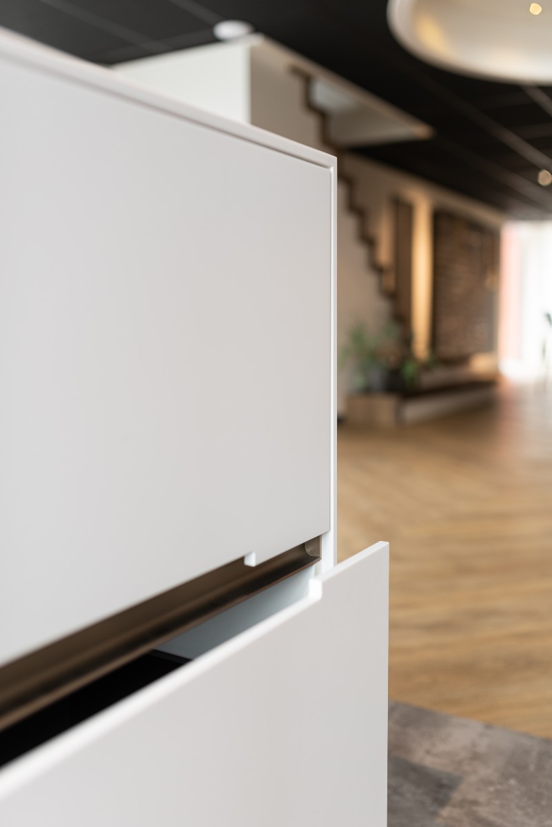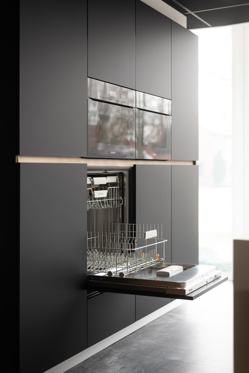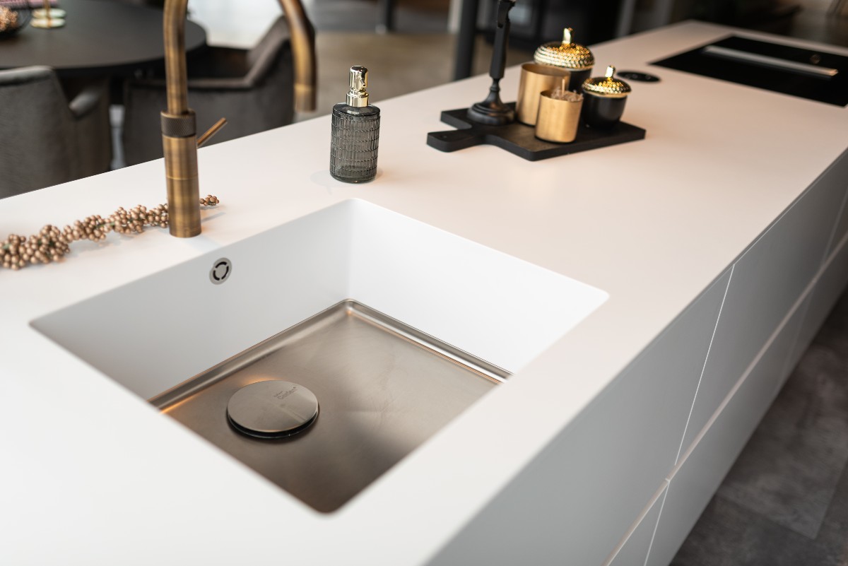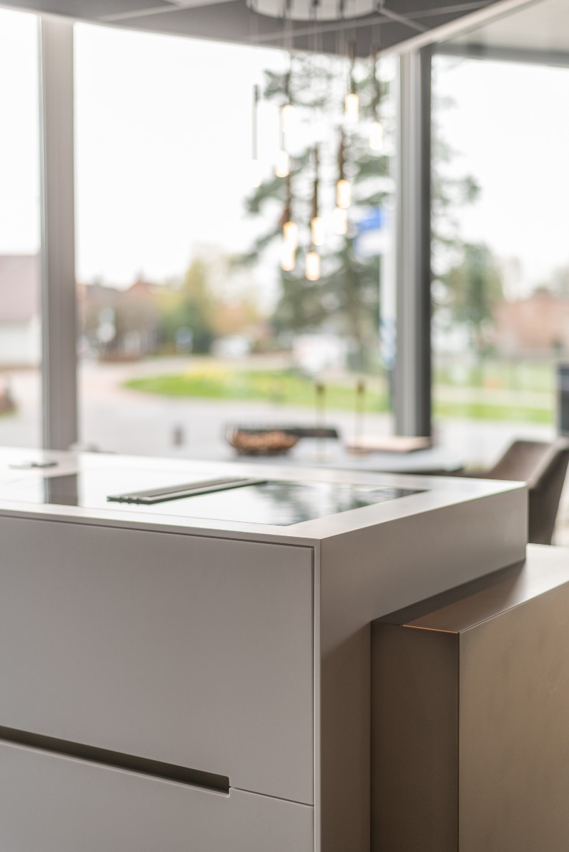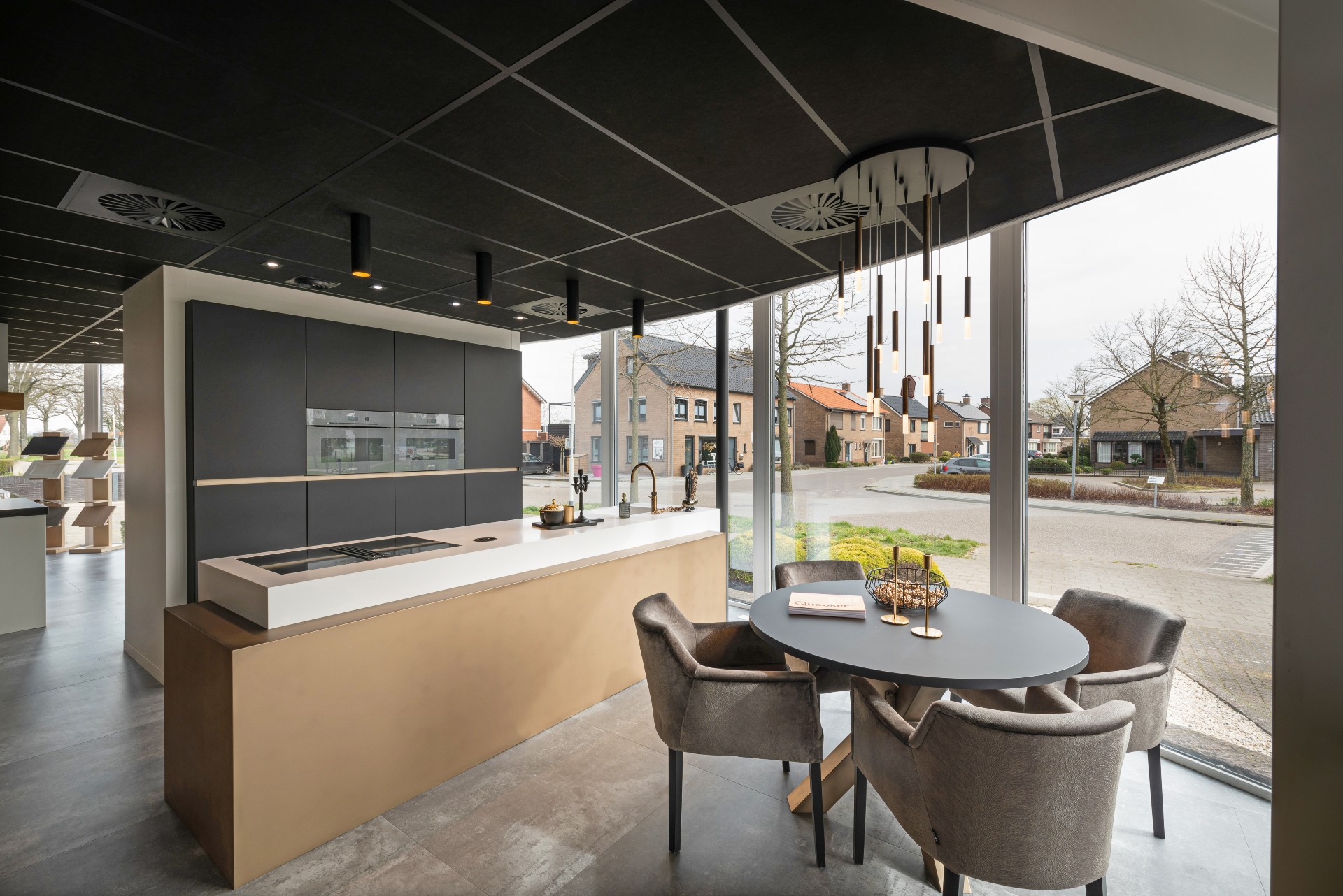 In deze strakke, moderne showroomkeuken zijn materialen en kleuren perfect gecombineerd.