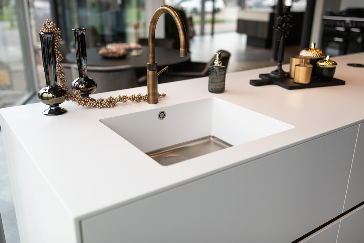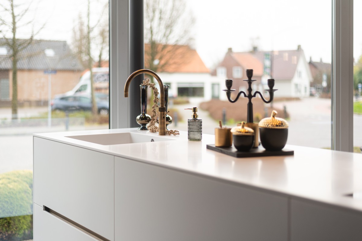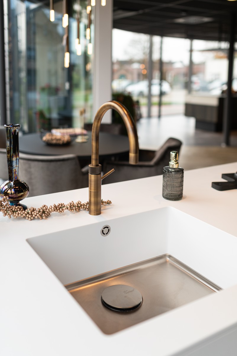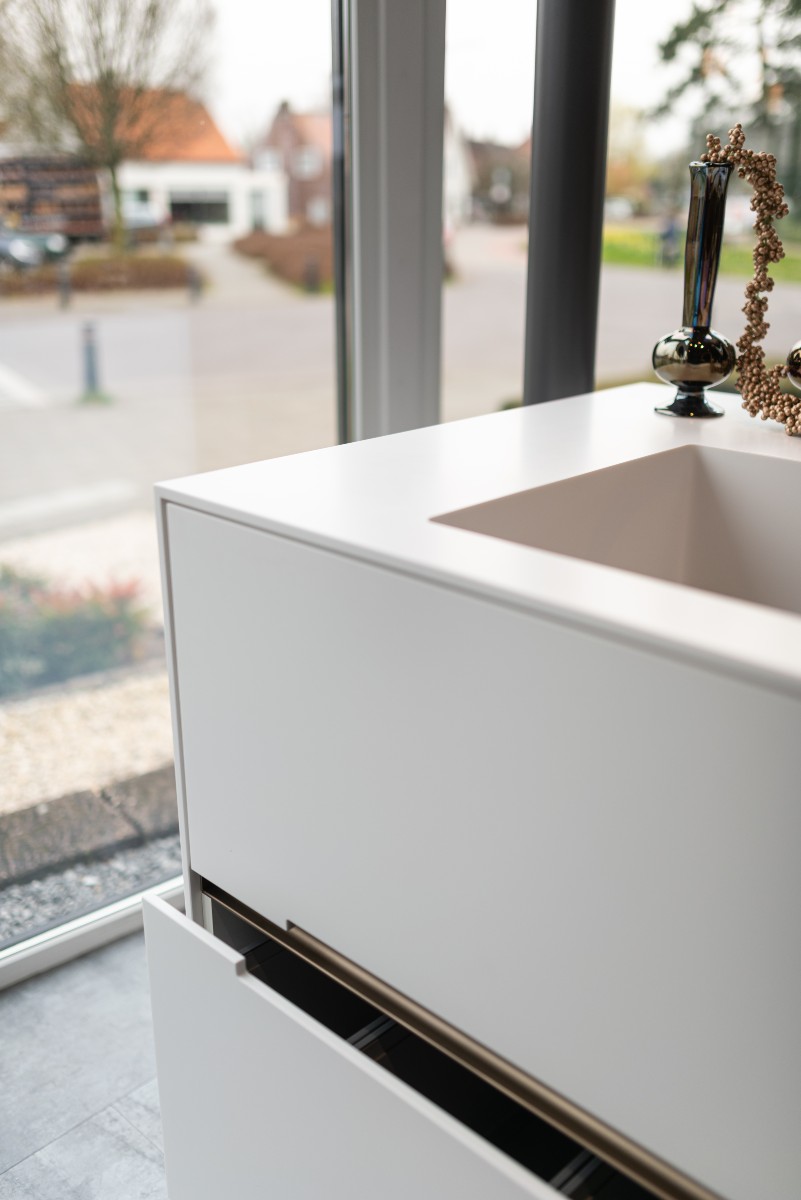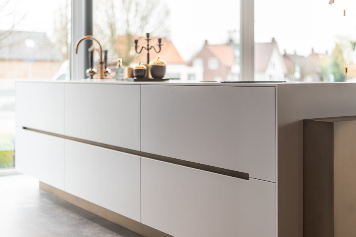 In deze strakke, moderne keuken zijn materialen en kleuren perfect gecombineerd. De kastenwand heeft fenix fronten in een matzwarte kleur en greeplijsten in een bronskleur. Deze zelfde bronskleur komt weer terug in het eiland en in de tafelpoot. Het kook- en spoeleiland is gemaakt van Corian, waardoor het eiland één geheel is en geen naden heeft. In het eiland komt de brozen kleur terug in de ombouw en de greeplijsten.