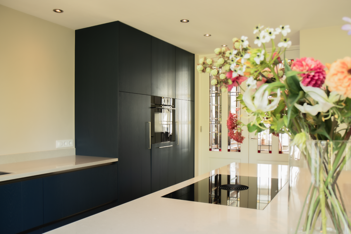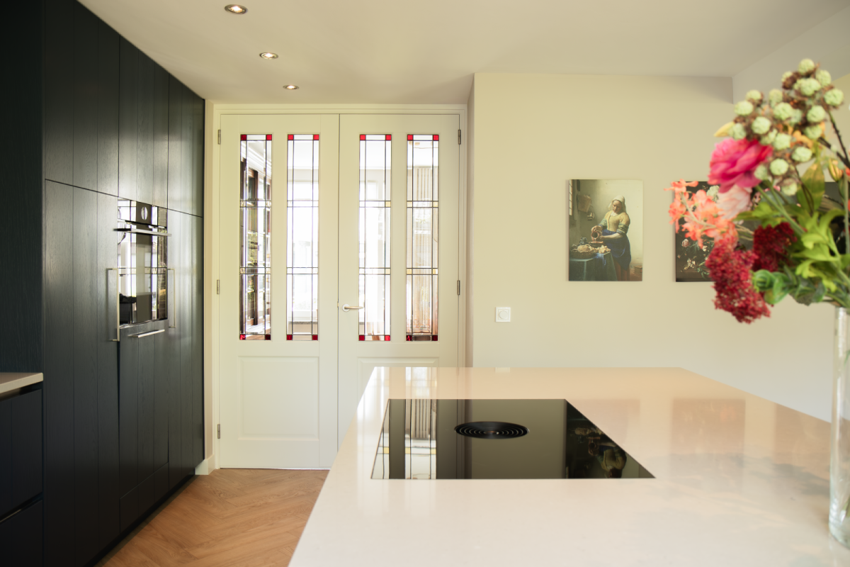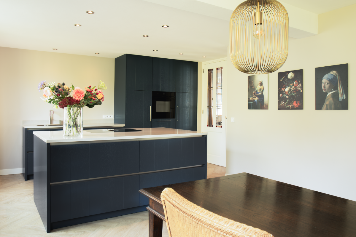 De bewoners hebben gekozen voor een schitterende donkerblauwe keuken, wat heeft geleid tot een moderne en stijlvolle inrichting die perfect samengaat met het prachtige glas-in-lood in de ruimte. De keuken is uitgevoerd met Manchester fronten met groef en in een diepe donkerblauwe tint. Het werkblad van wit composiet voegt een strak en modern element toe. Door de mix van verschillende stijlen, zoals klassiek, landelijk, vintage en modern, ontstaat een veelzijdige en tijdloze keuken die perfect inspeelt op diverse smaken en voorkeuren.