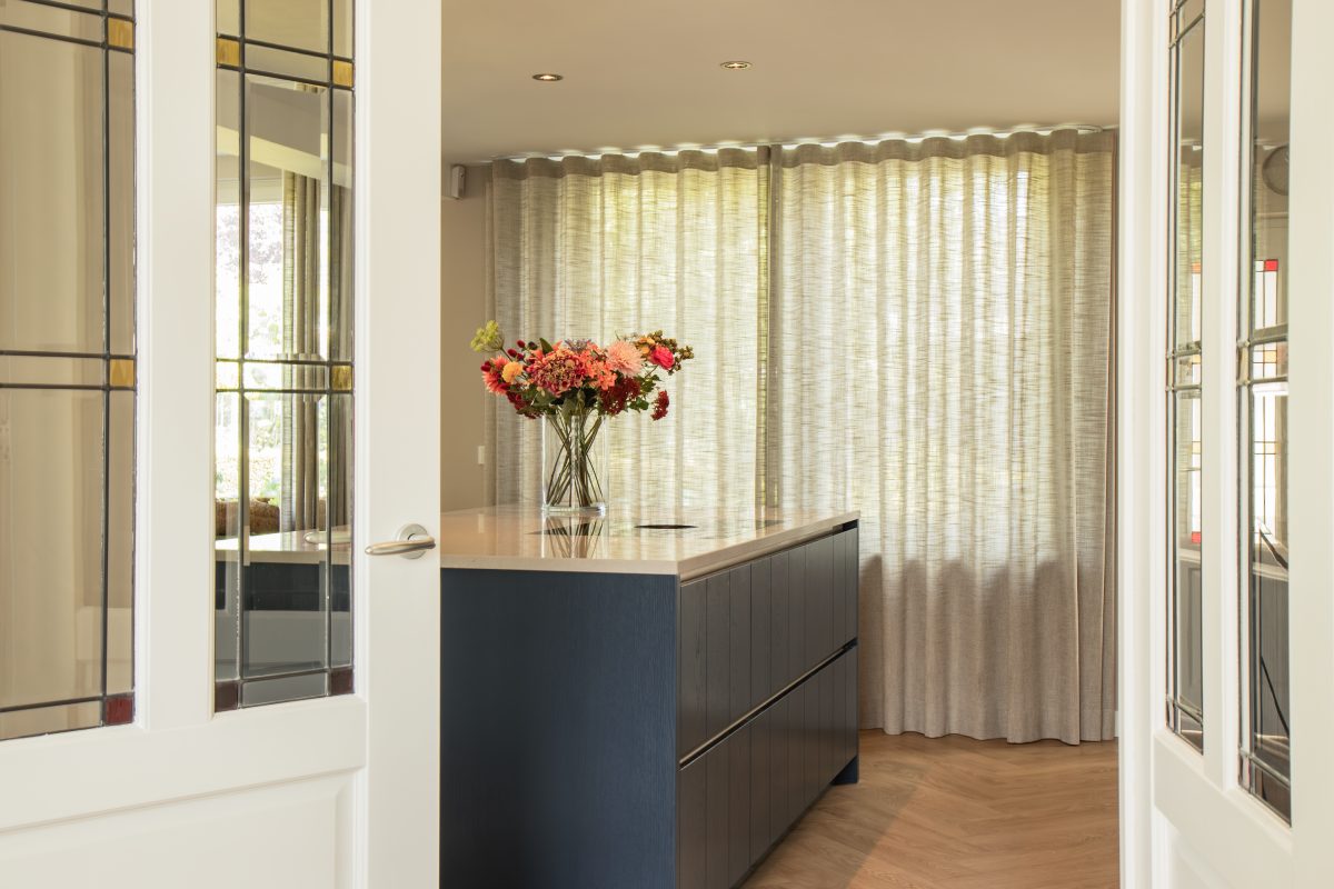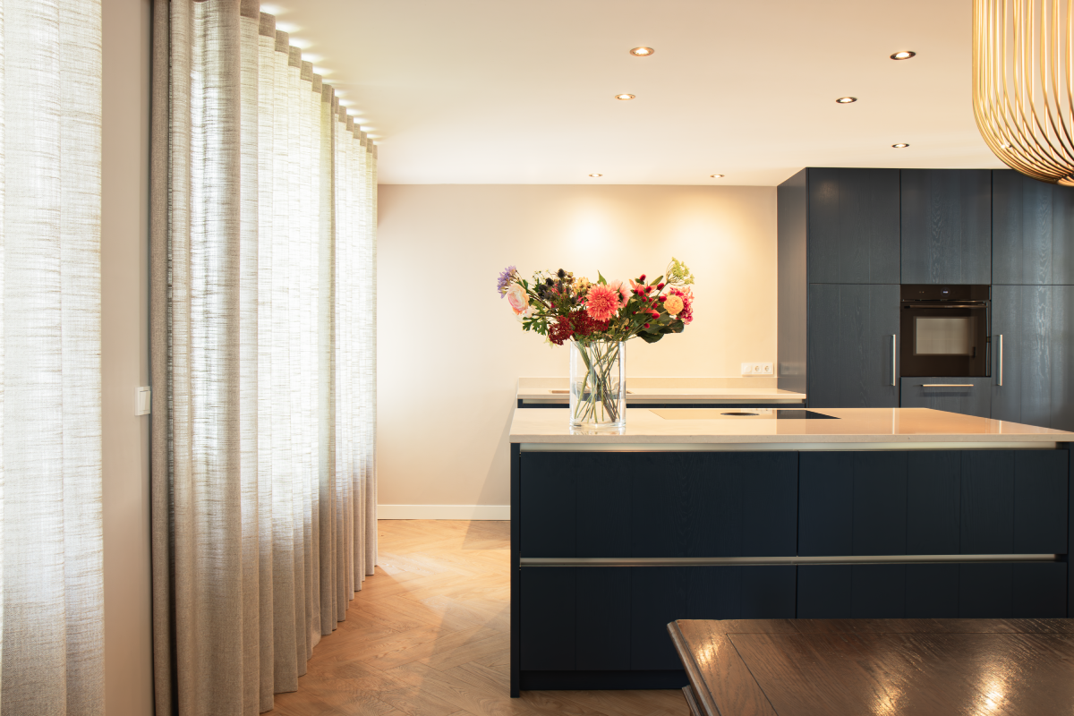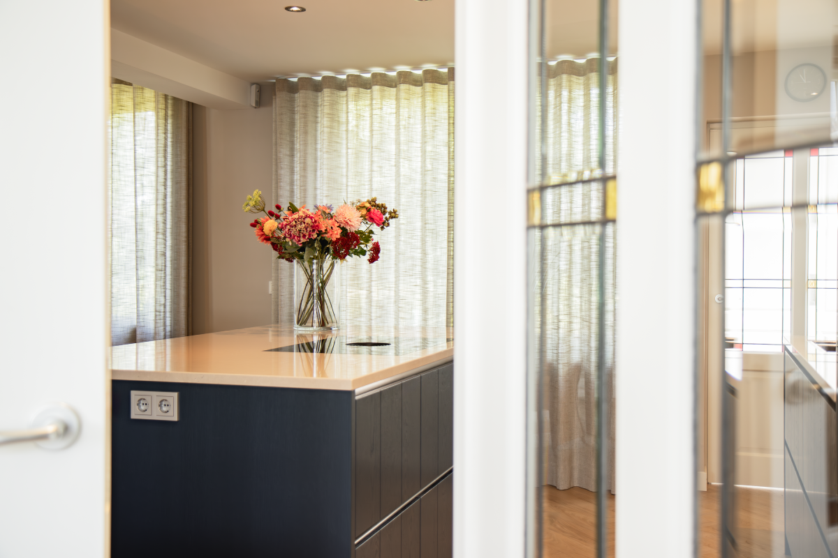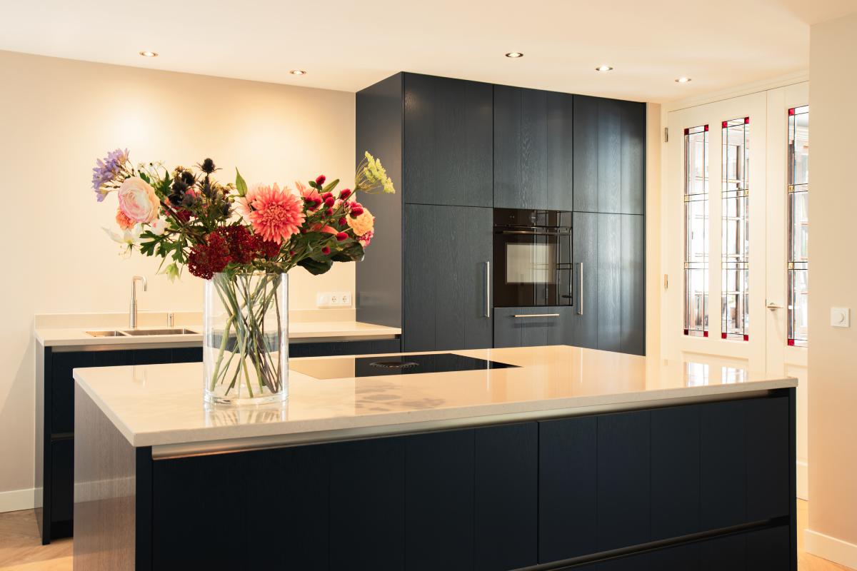 De bewoners hebben gekozen voor een schitterende donkerblauwe keuken, wat heeft geleid tot een moderne en stijlvolle inrichting die perfect samengaat met het prachtige glas-in-lood in de ruimte. De keuken is uitgevoerd met Manchester fronten met groef en in een diepe donkerblauwe tint. Het werkblad van wit composiet voegt een strak en modern element toe. Door de mix van verschillende stijlen, zoals klassiek, landelijk, vintage en modern, ontstaat een veelzijdige en tijdloze keuken die perfect inspeelt op diverse smaken en voorkeuren.