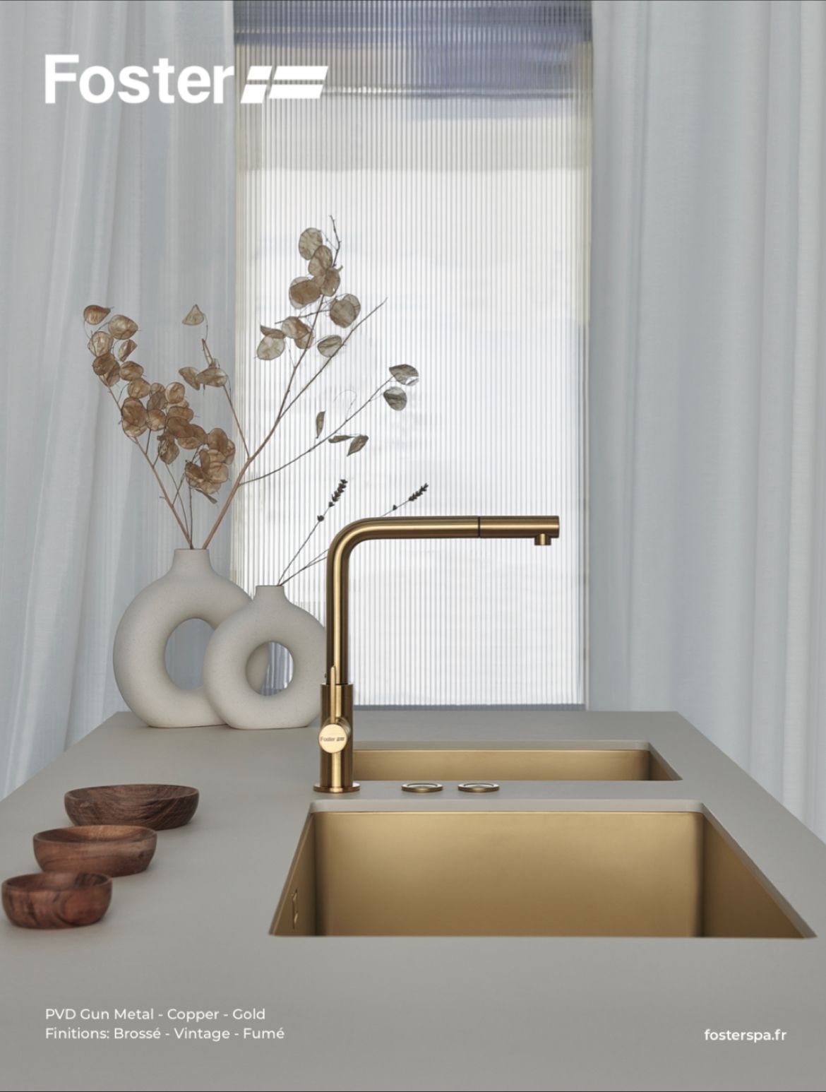 De drie breedte maten zijn 40, 50 en 71 en de vier uitvoeringen zijn RvS, Gun Metal, Goud en Koper. Maak uw droomkeuken compleet met Foster.