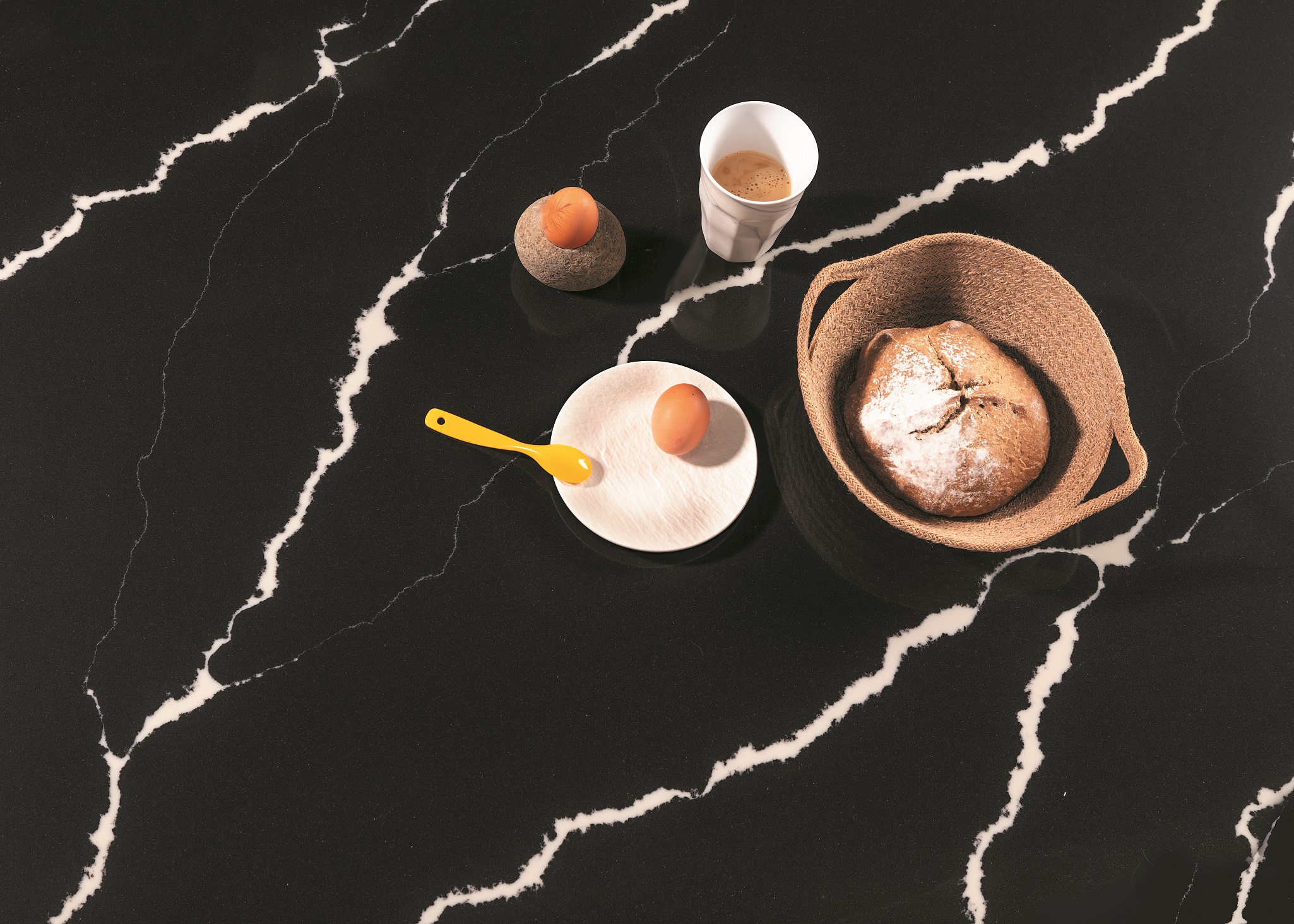 Evora Quartz Nemesis heeft een diep zwarte kleur met een grove witte ader. De kleur en marmeroptiek is een tijdloos design, maar combineer het met natuurlijke materialen zoals keramiek, geweven riet en steen dan is dit klassieke blad heel modern.